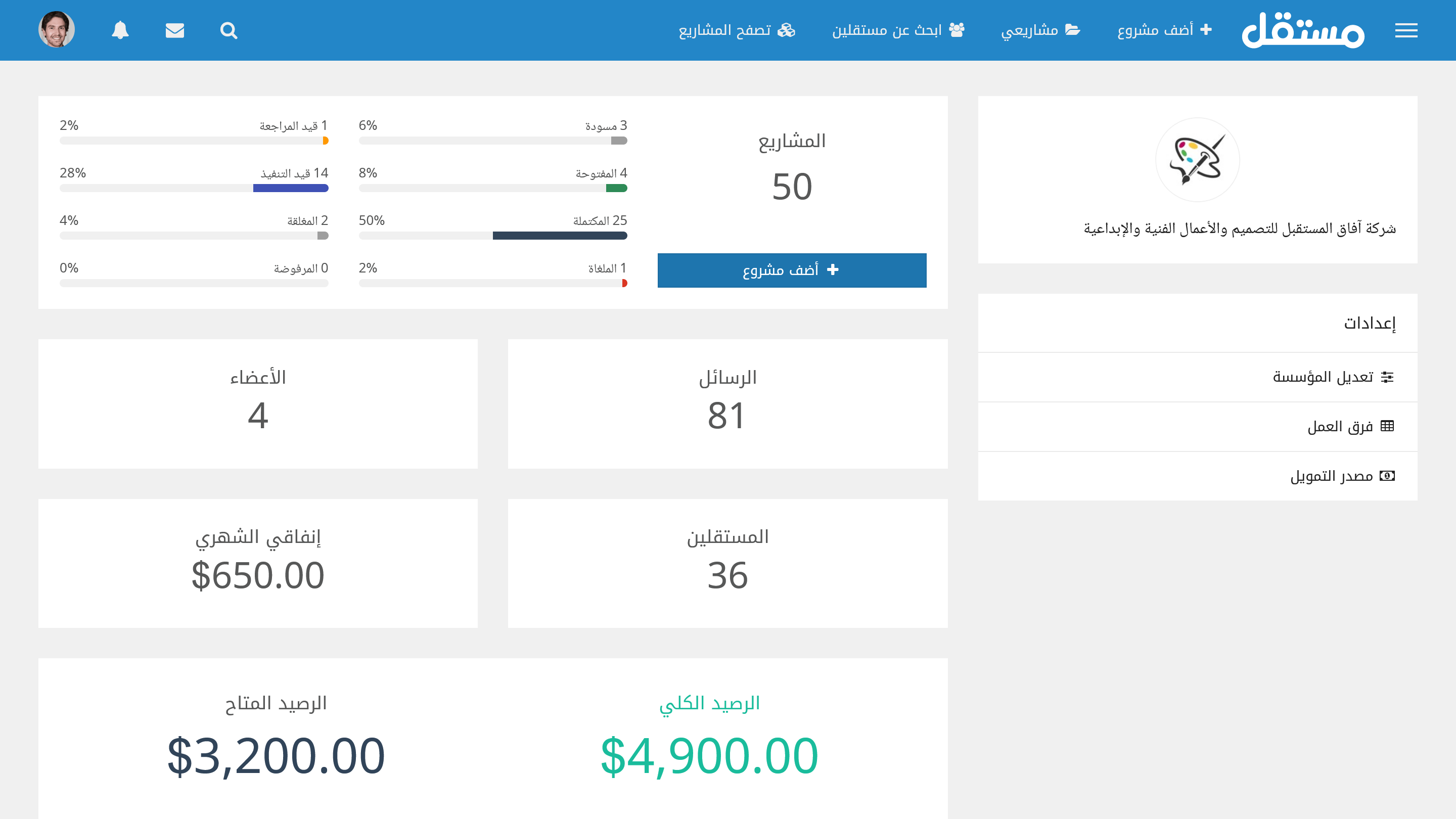 ألقي نظرة عامة على مجريات العمل في المؤسسة كعدد المشايع والرسائل والأعضاء والمستقلين وحالة الرصيد.