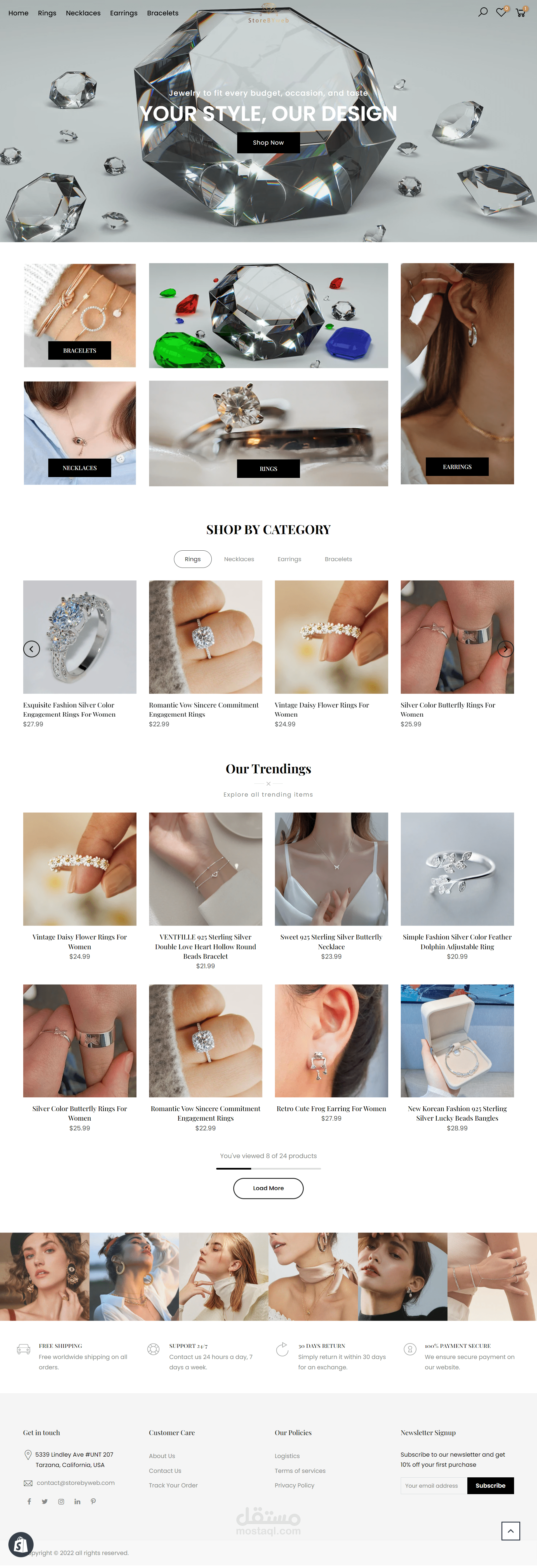 إليكم أحد المتاجر الإنجليزية الاحترافية التي قمنا بتصميمها بطريقة ميزة وباستعمال قالب احترافي مدفوع على شوبيفاي Shopify لعلامة تجارية متخصصة في بيع المجوهرات Jewelry Store.