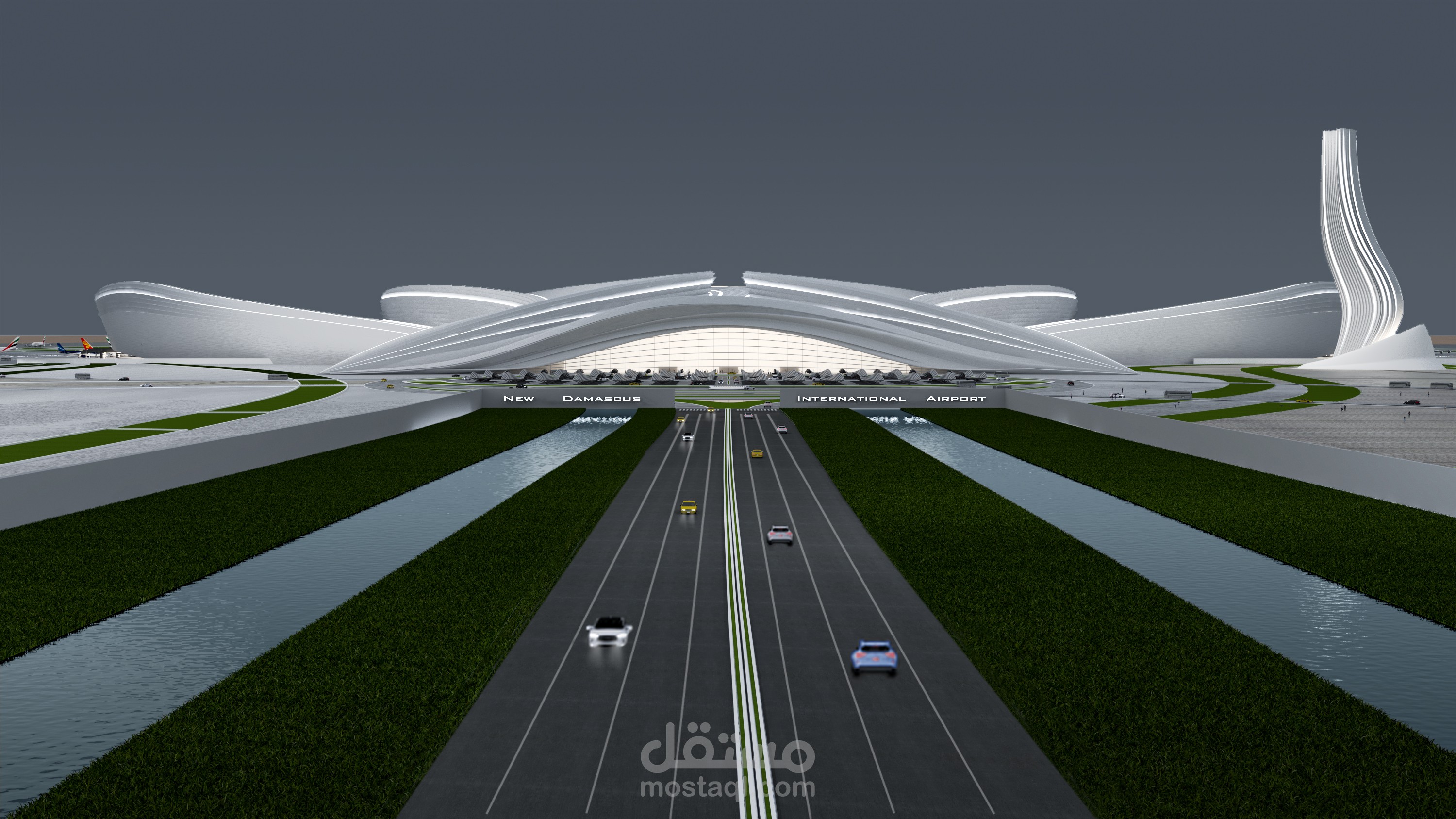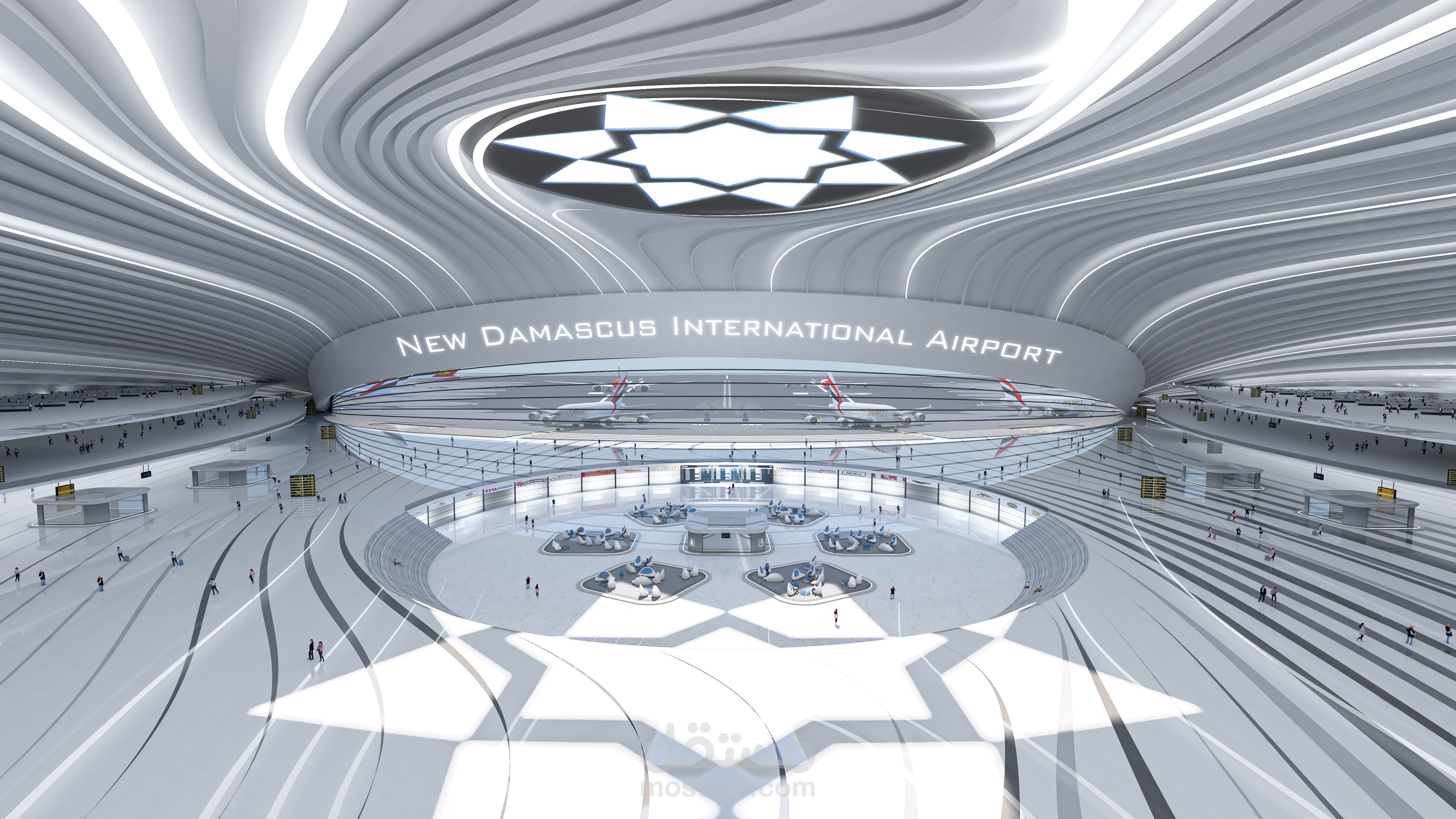 Design is aimed at open view between main entrance and airplanes square .Also , there is a kinetic Damascus pattern links with airplanes movement .