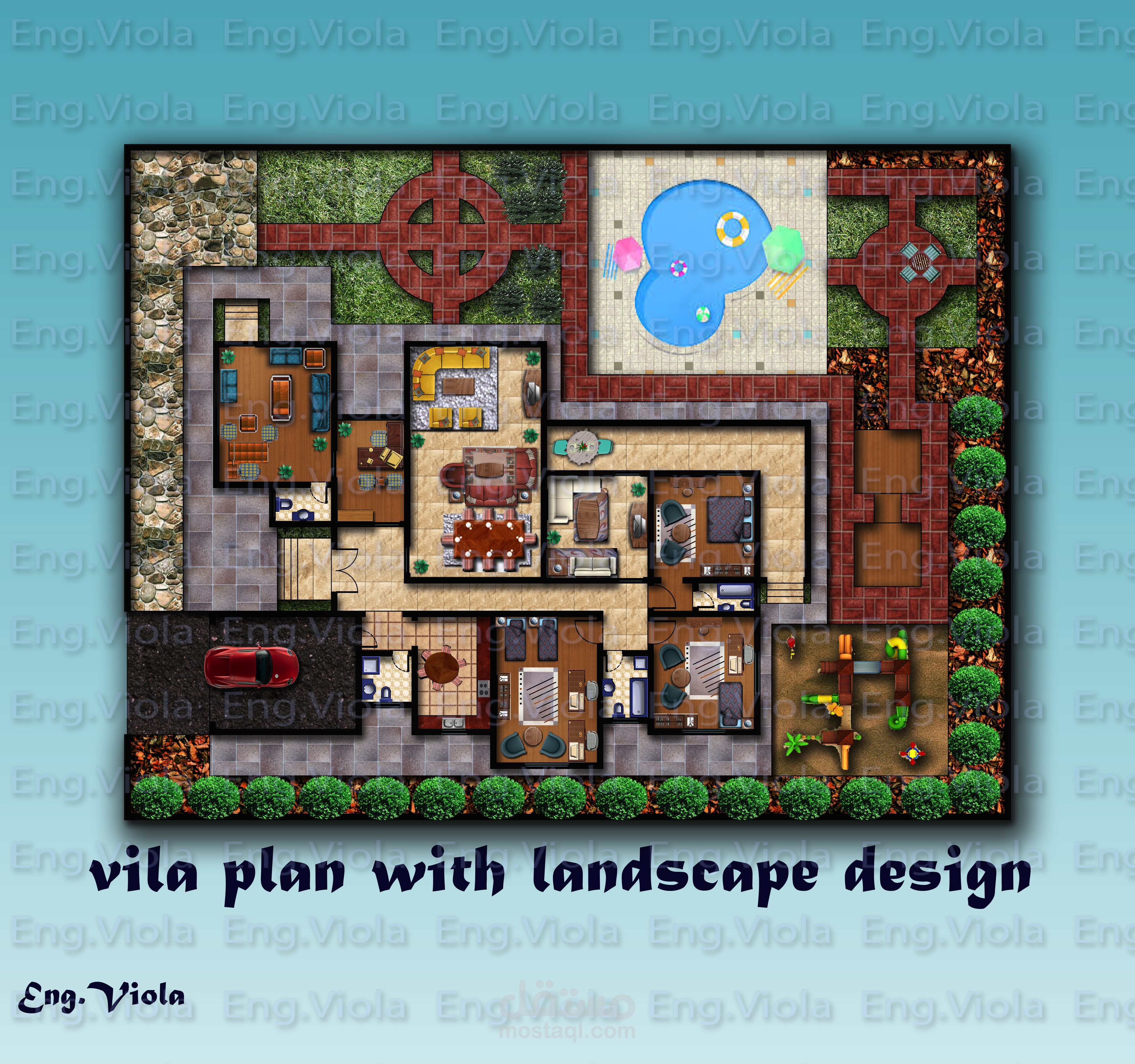 تصميم لفيلا سكنية بها مكتب هندسى بمدخل منفصل وخصوصيه تامه بالاضافة الى تصميم landscape للارض المحيطه بها على حسب طلب العميل