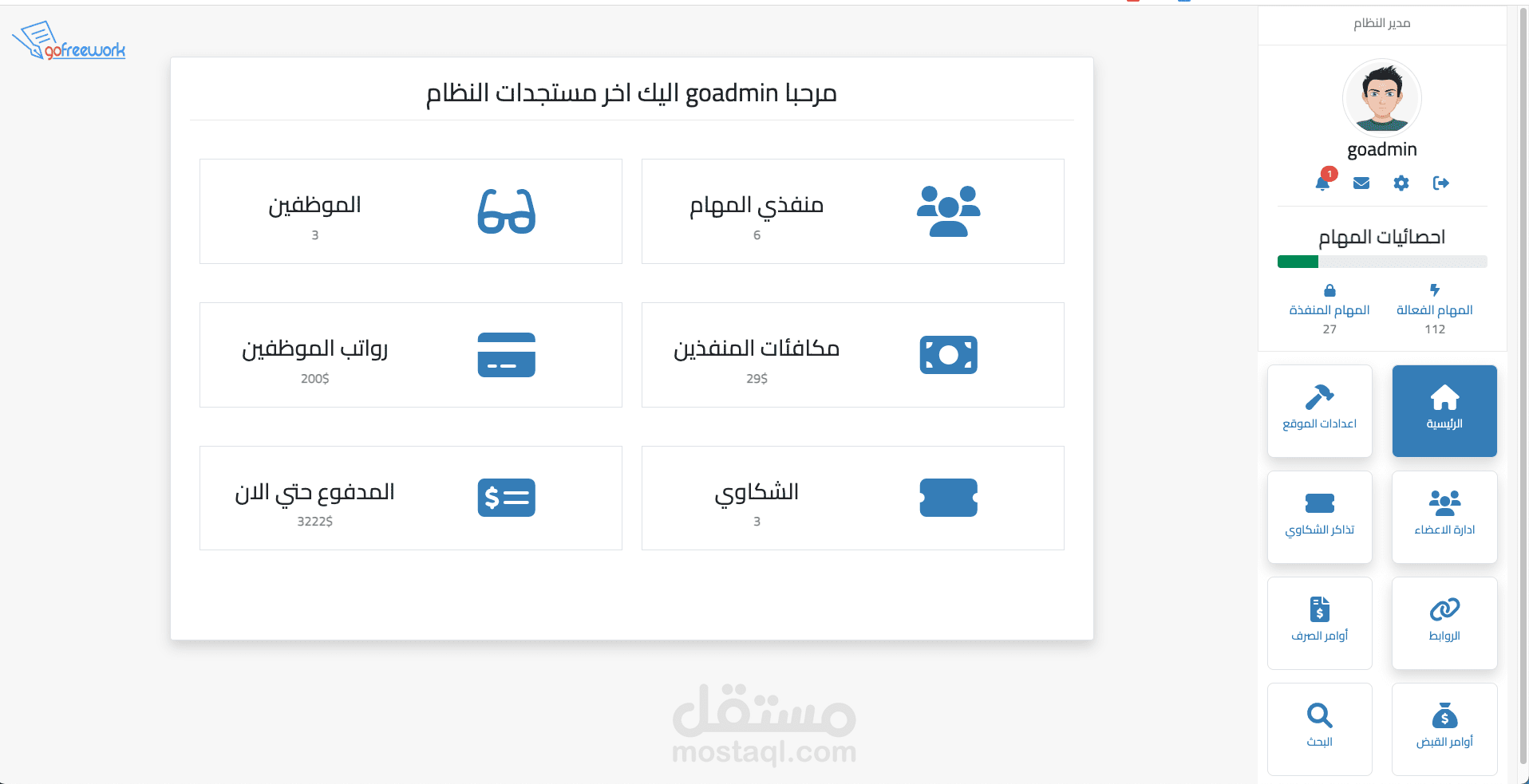 مدير النظام : له كامل الصلاحيات من ادارة النظام وادارة المستخدمين والموظفين