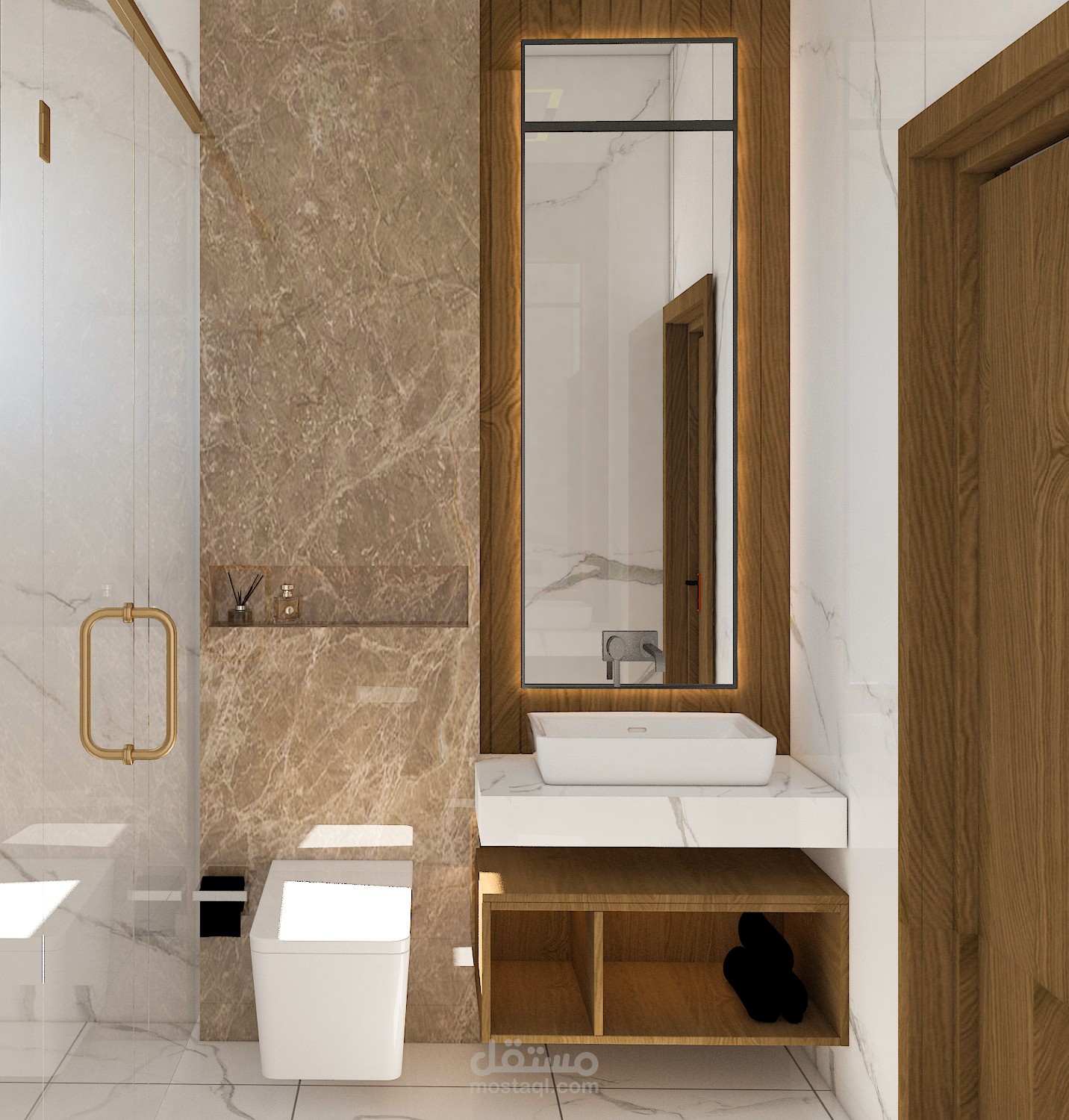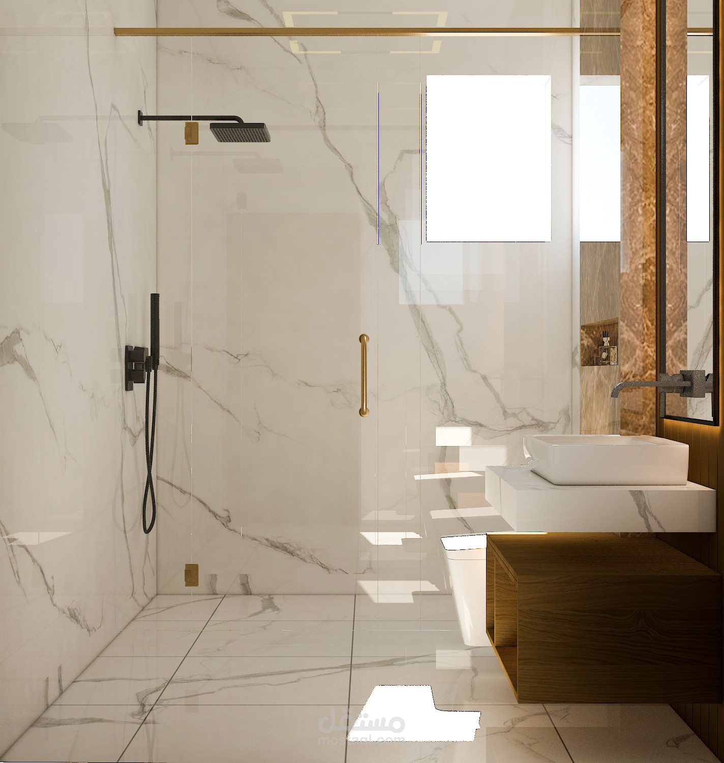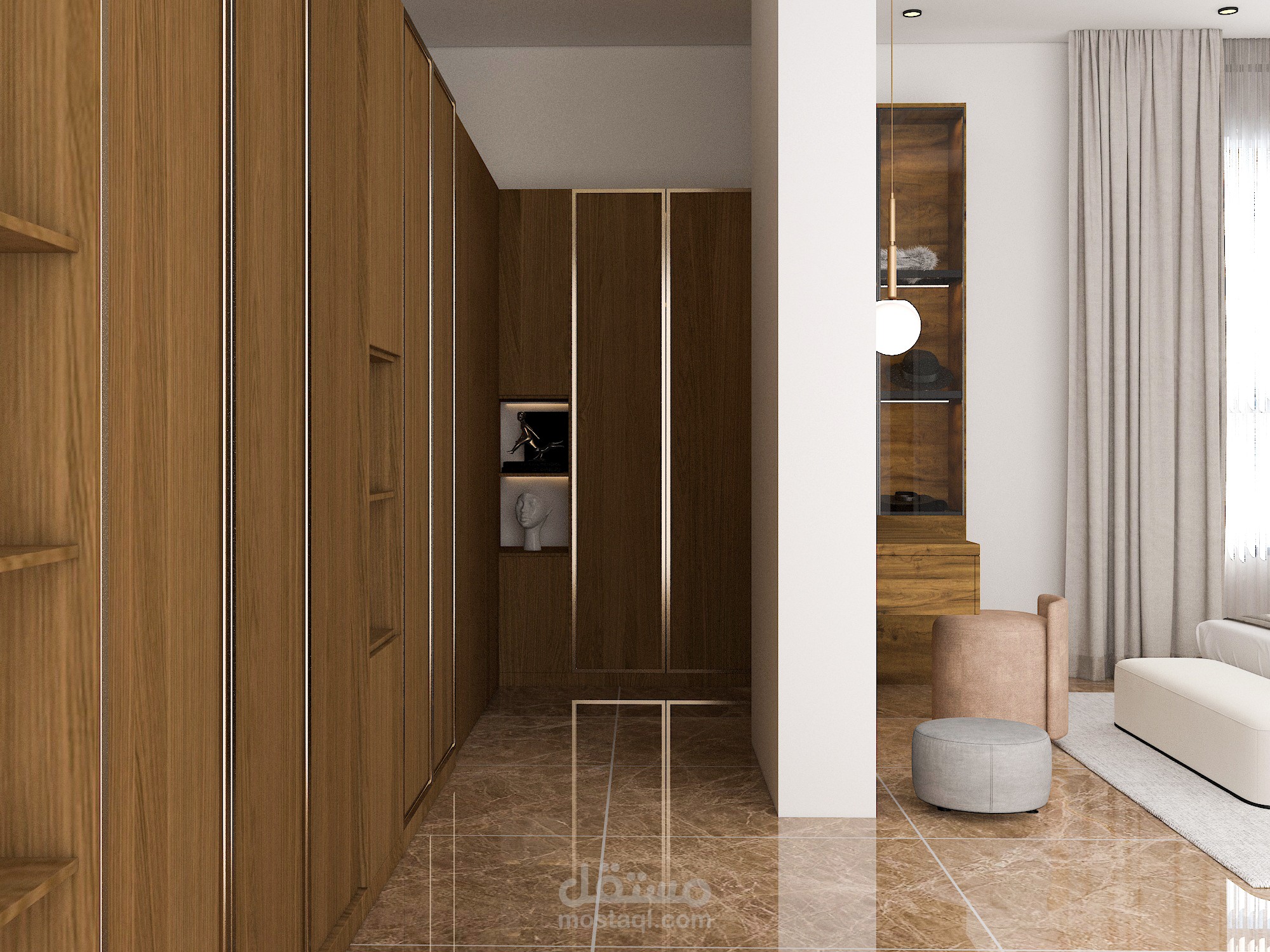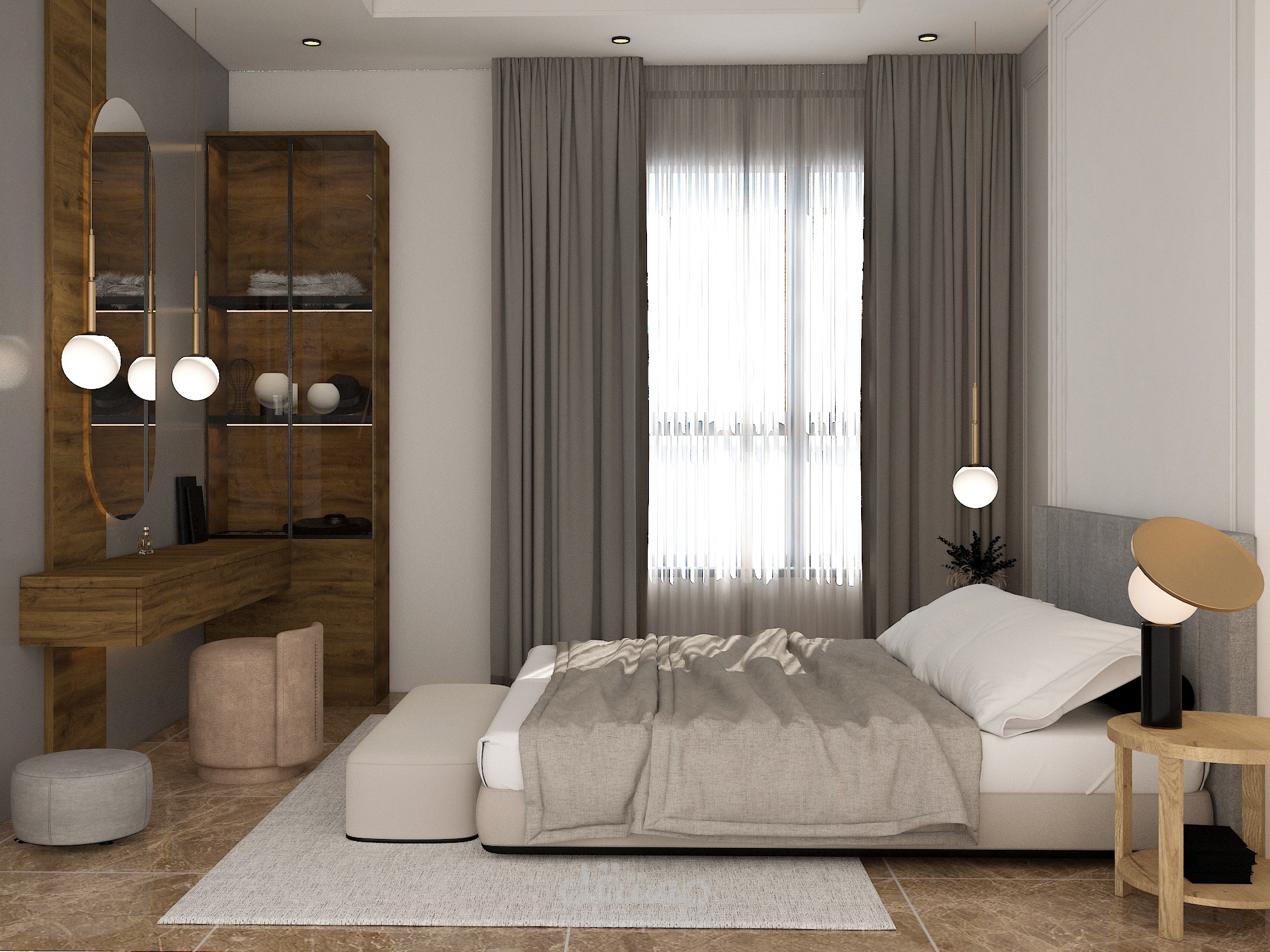 تم التصميم بألوان هادئة و رمادية على الطراز الحديث (موديرن ) و ذلك باستخدام اوتوكاد و 3DS MAX