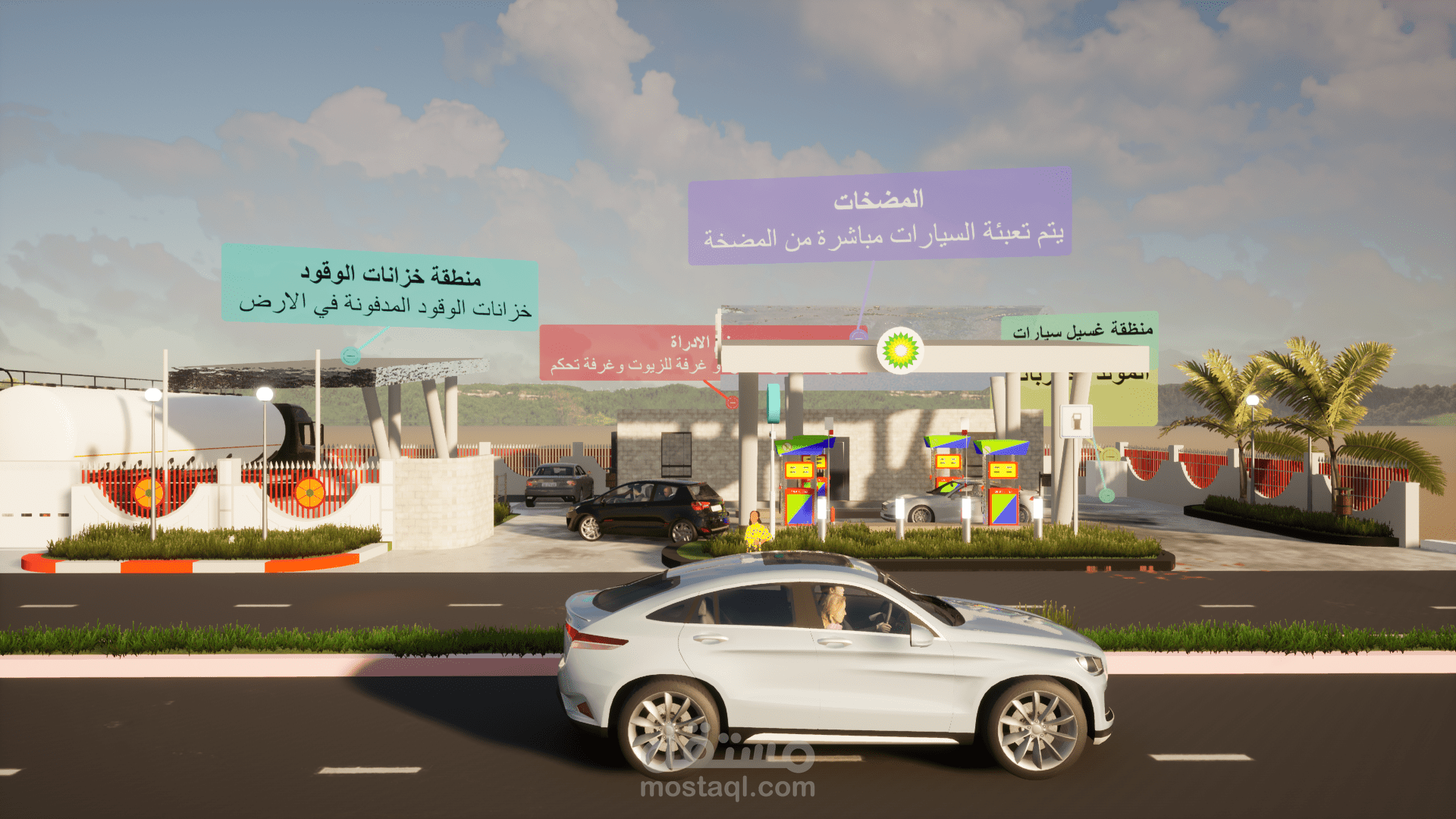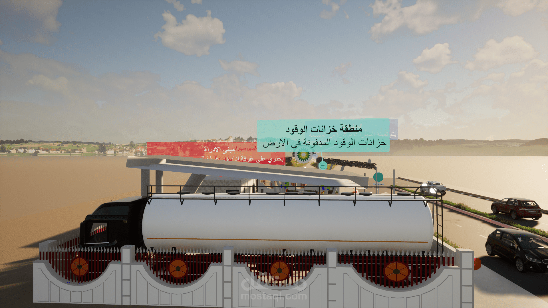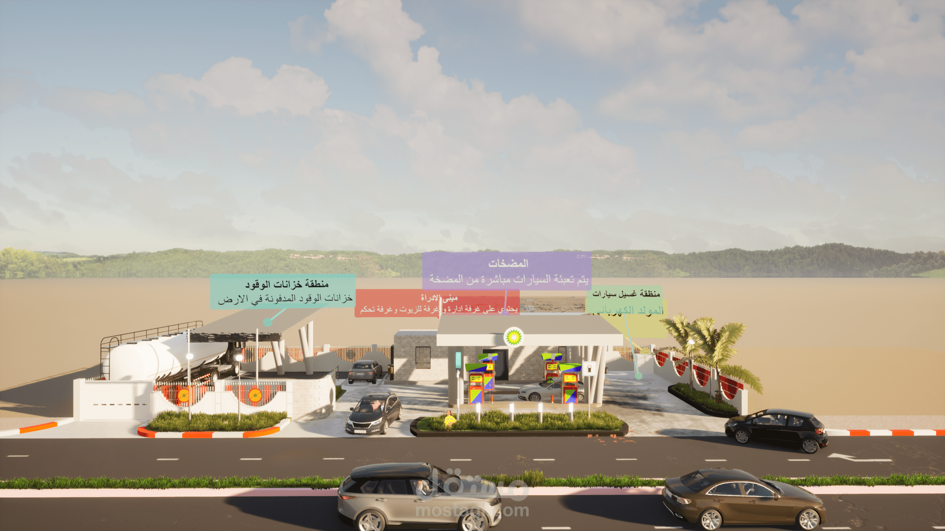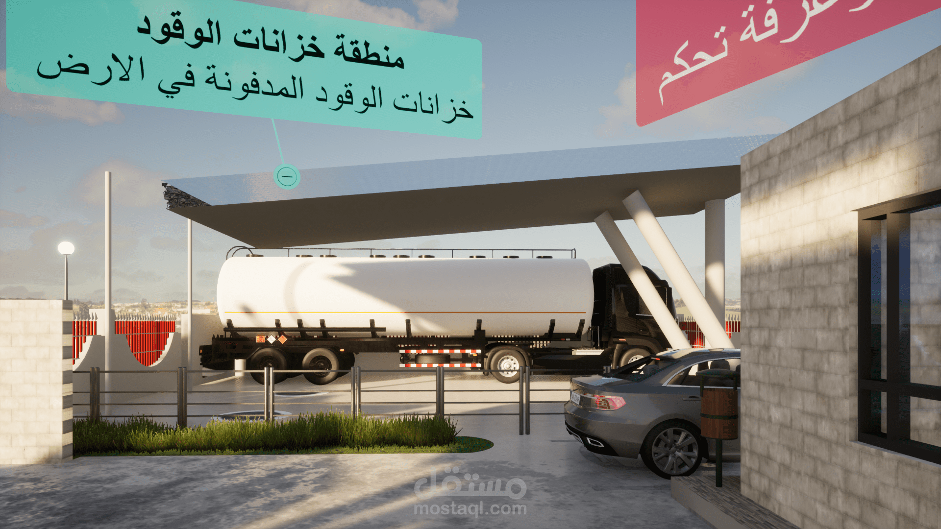 تصميم محطة وقود حسب معايير الأمن والسلامة من جهات الدفاع المدني والهيئة العامة لتصميم محطات الوقود.