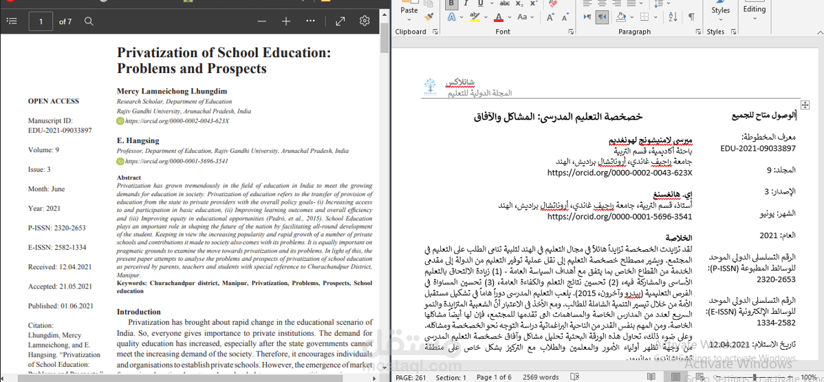 قمت بترجمة هذا البحث " التعليم في المغرب" من الإنجليزية إلى العربية ترجمة تقنية دقيقة. ذلك البحث يتحدث عن التعليم في المغرب من لدن فترة ما بعد الإستقلال الوطني حتى الآن وهو يتناول معدل التسريب في المراحل الأولية و تعدادها كل عام و عمل استبيانات من أجل ذلك. كذلك هو يتناول الفرق بين جودة التعليم في كلا من المدارس النظامية العامية و المدارس الخاصة. هذا العمل أفادني كثيراً حيث أطلعني عن جودة العليم في المغرب مقارنة بباقي الدول العربية وخاصة بعد جلاء المستعمر الفرنسي.