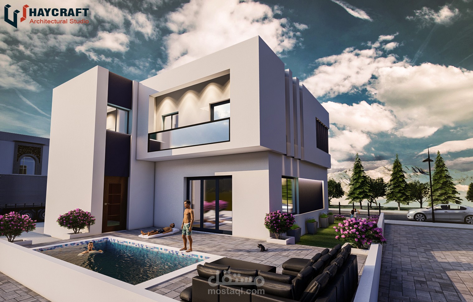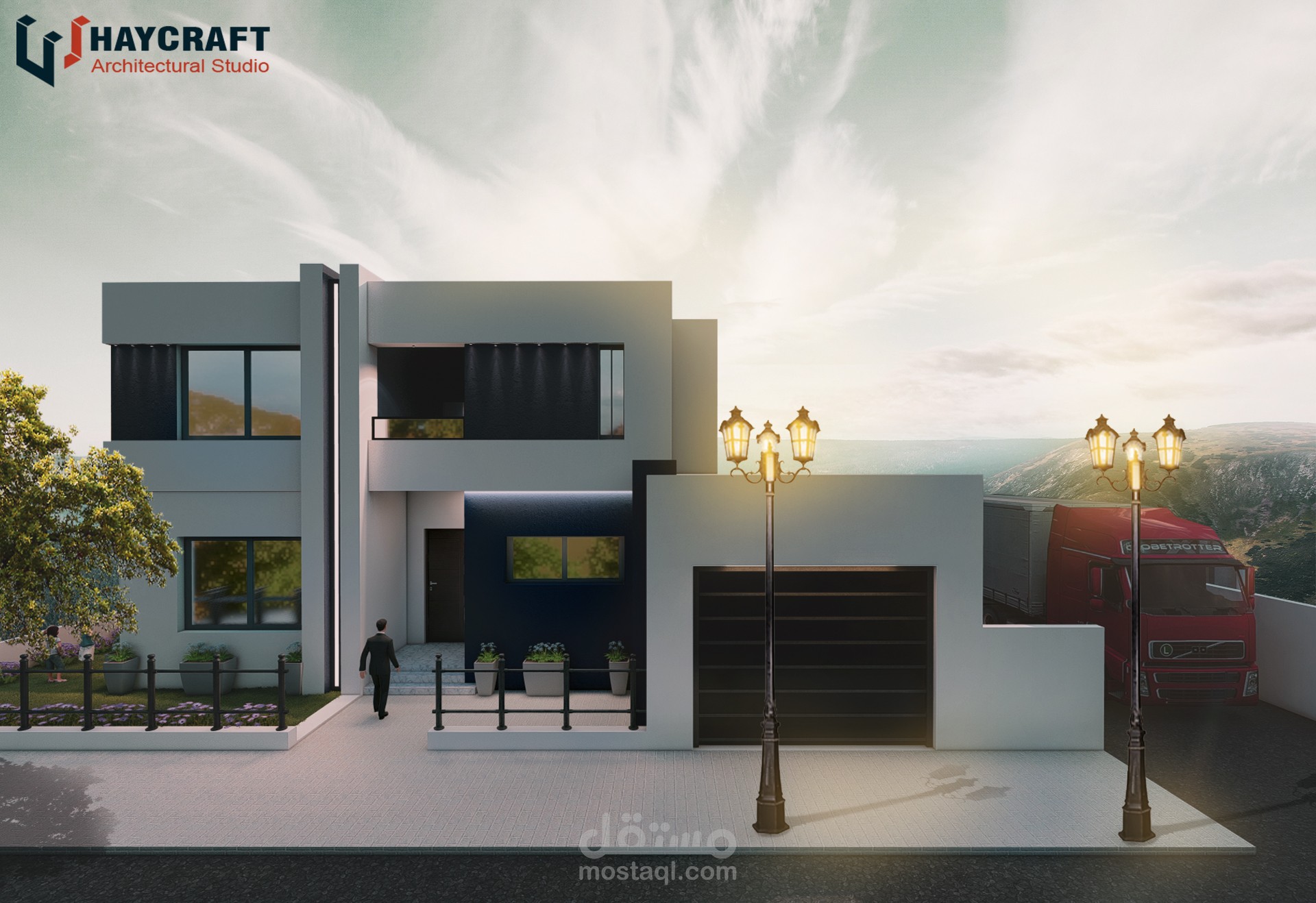 فيلا مكونة من طابقين مصممة على الطراز الحديث من الخرسانة مع كراج لسيارة وموقف خاص للشاحنة