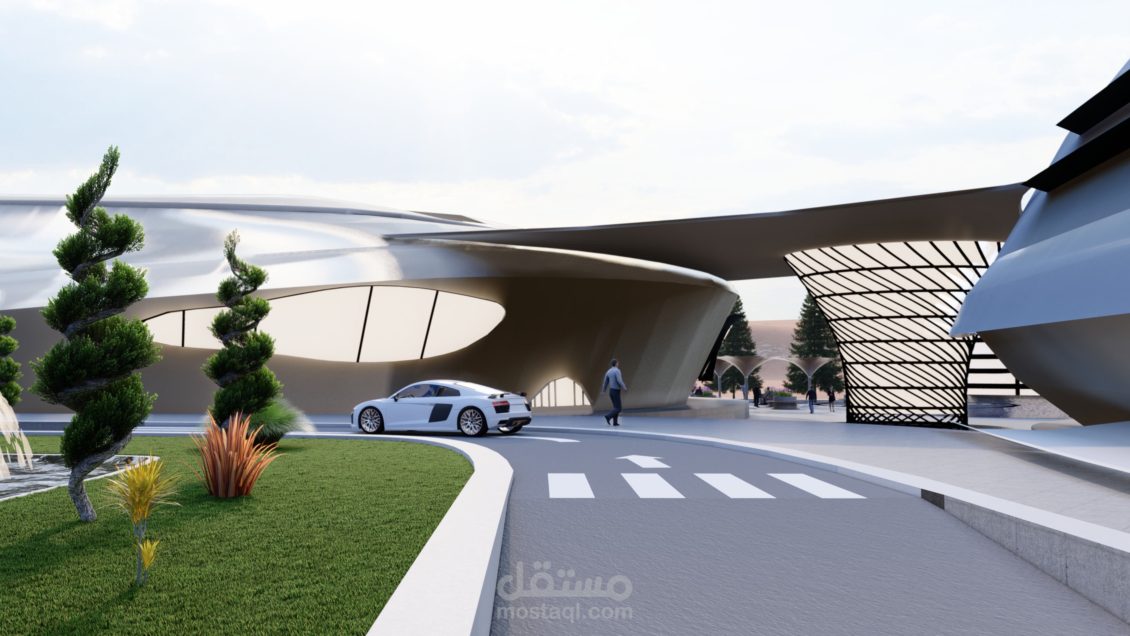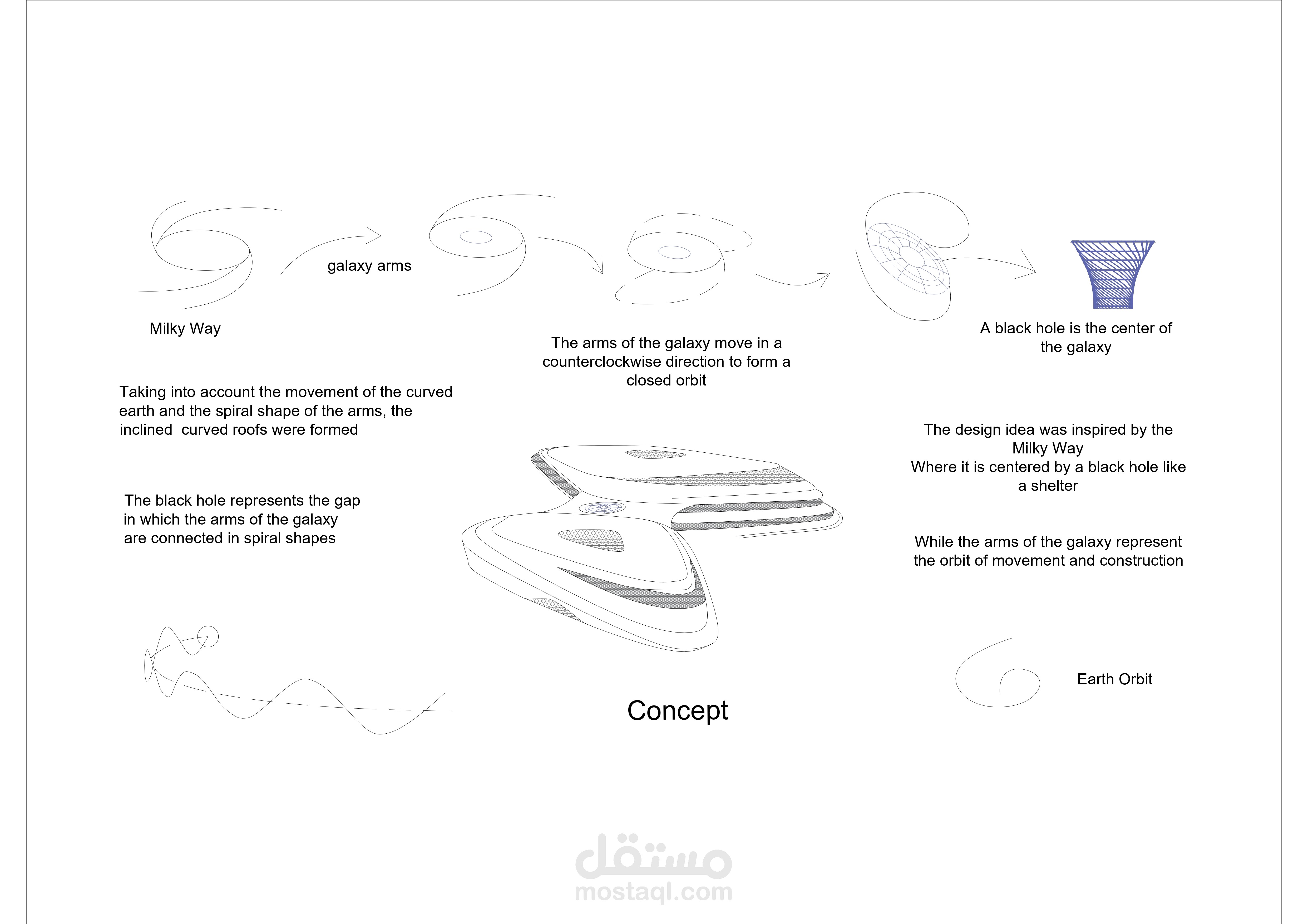 تم تصميم الواجهات لإعطاء الانطباع عن الفضاء وعلم الفلك ، وتمثل المنحنيات فيهما الحركة المدارية للأرض والمجرات