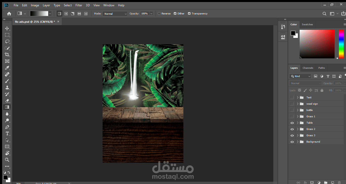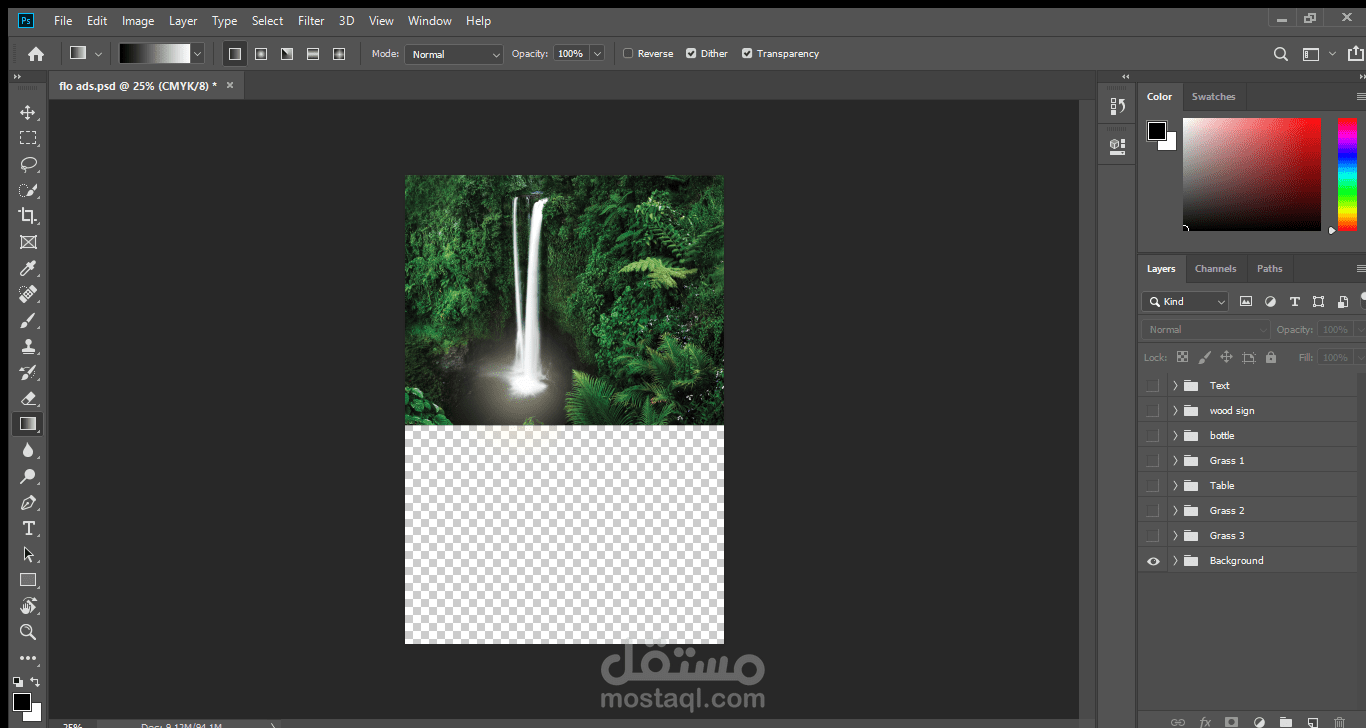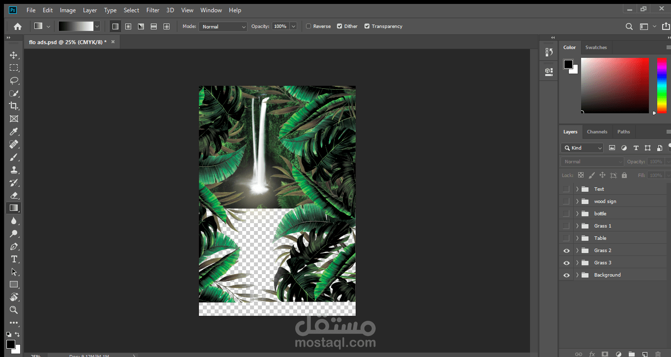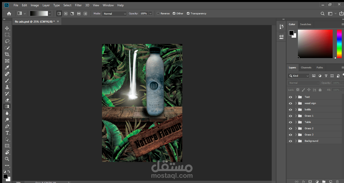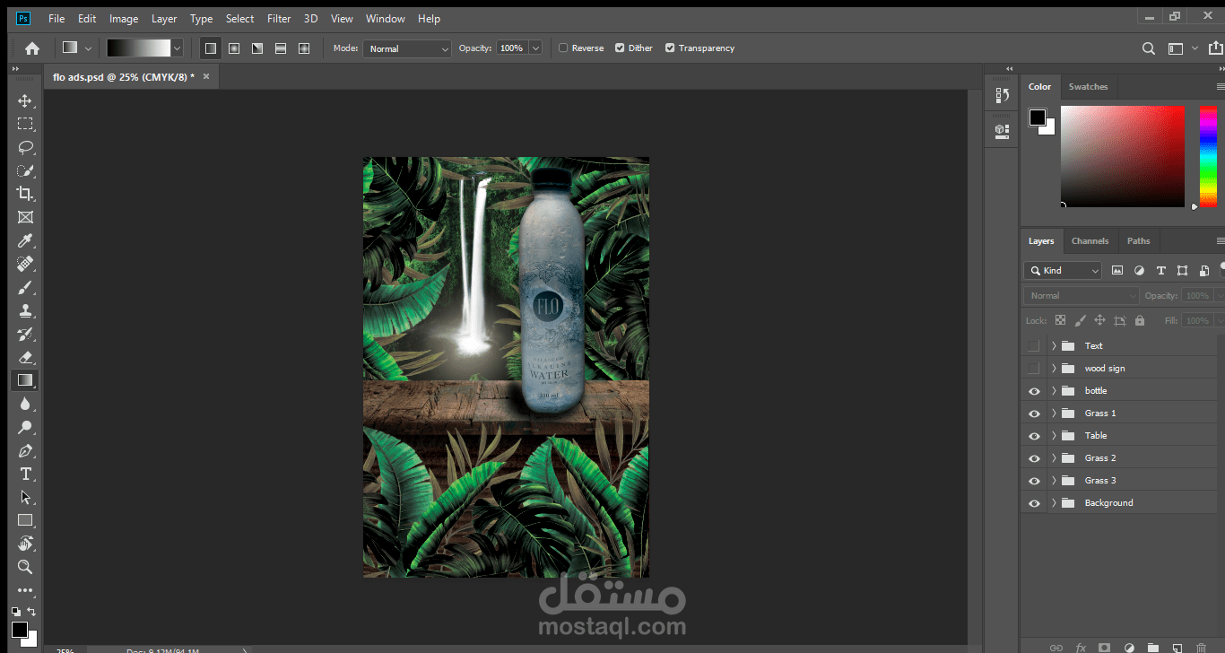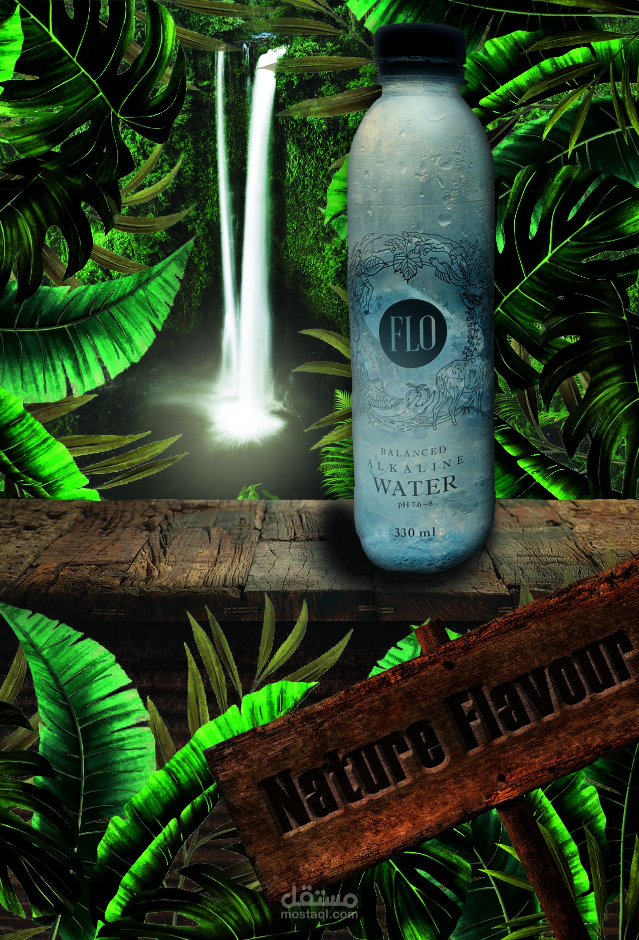 اعادة تصميم لزجاجة مياه flo مع ابتكار فكرة اعلانية جديدة منعشة كربط الغابات الاستوائية بالشلال الذي يقدم لنا مياه flo المنعشة