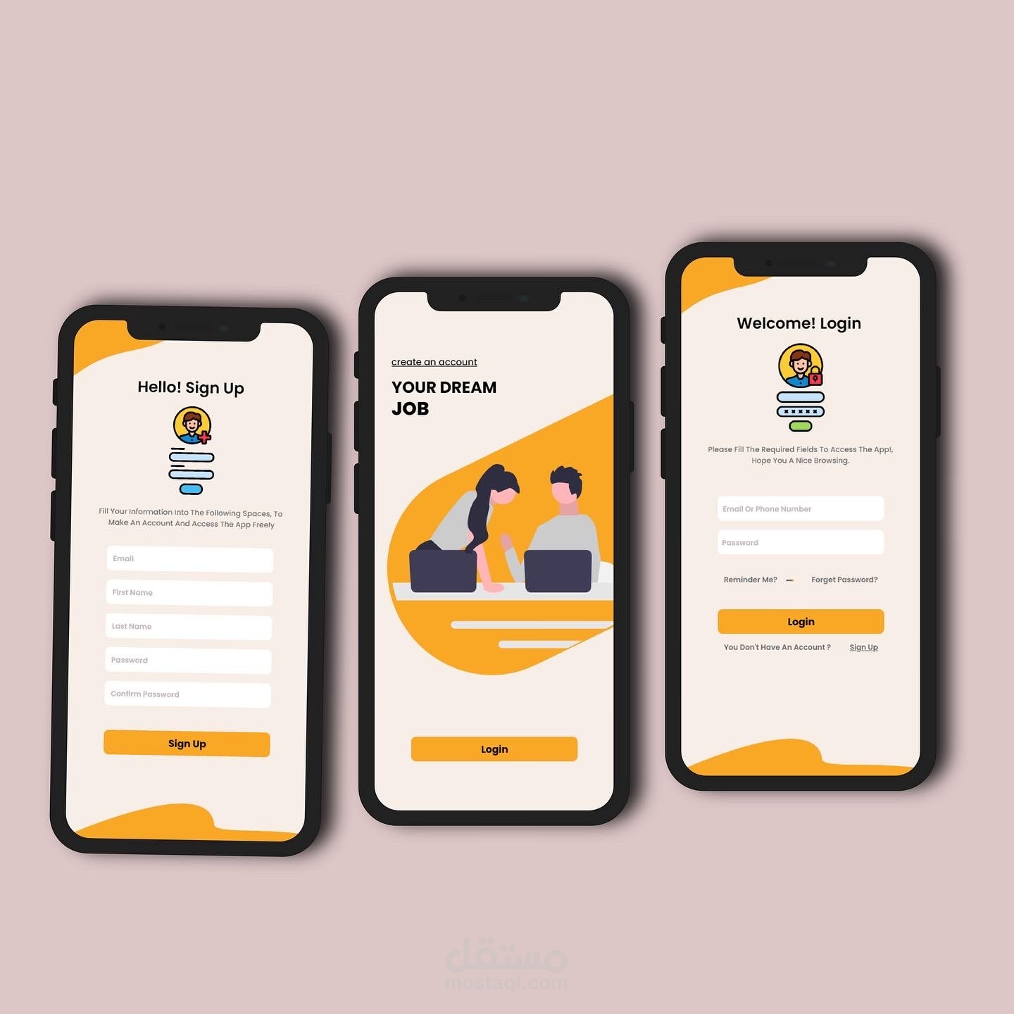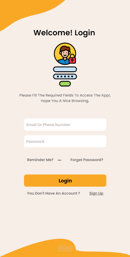 وشاشة التسجيل / تسجيل الدخول لتطبيق هاتف المحمول