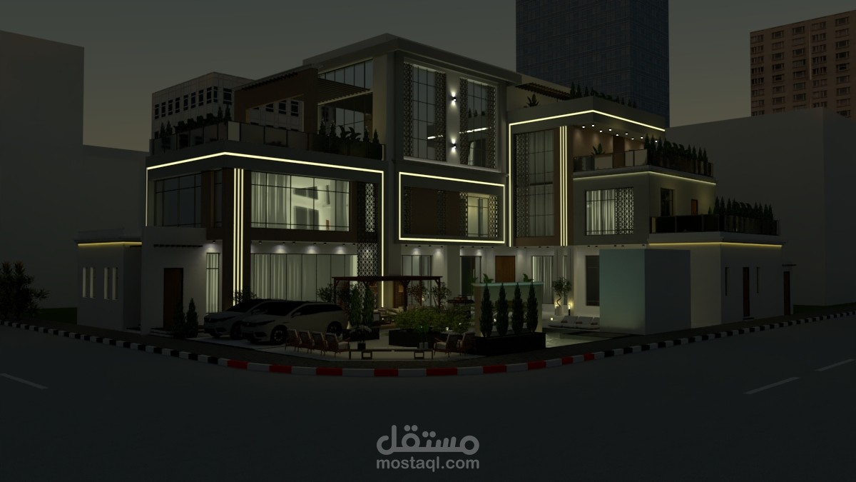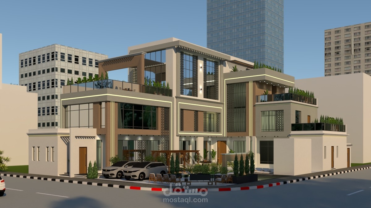تم العمل مع المالك لتحقيق افضل استفادة من كافة الظروف والمعطيات، ليكون المبنى علامة مميزة في مظهره الخارجي وكذلك في نمط واسلوب استخدامه الداخلي..