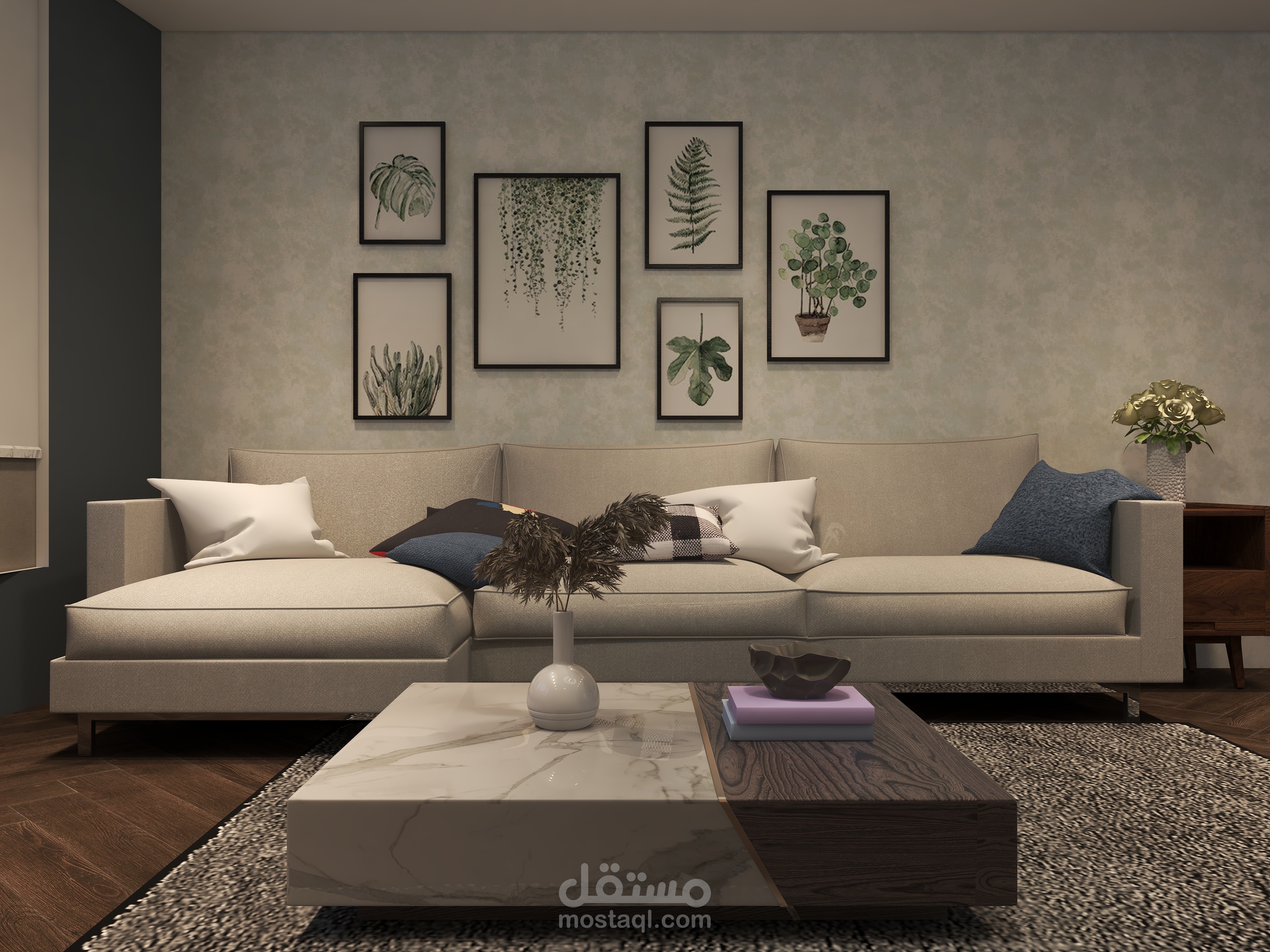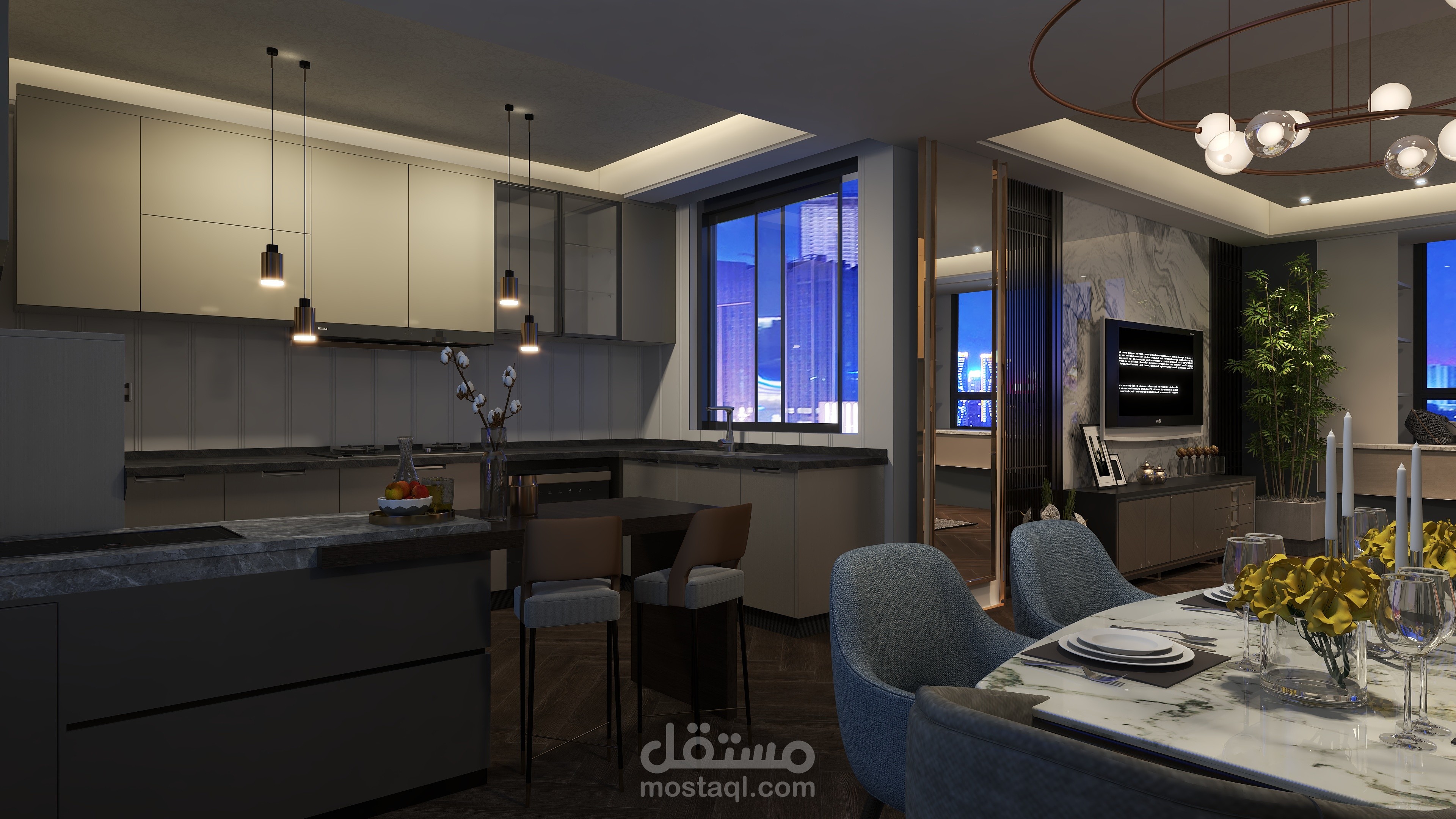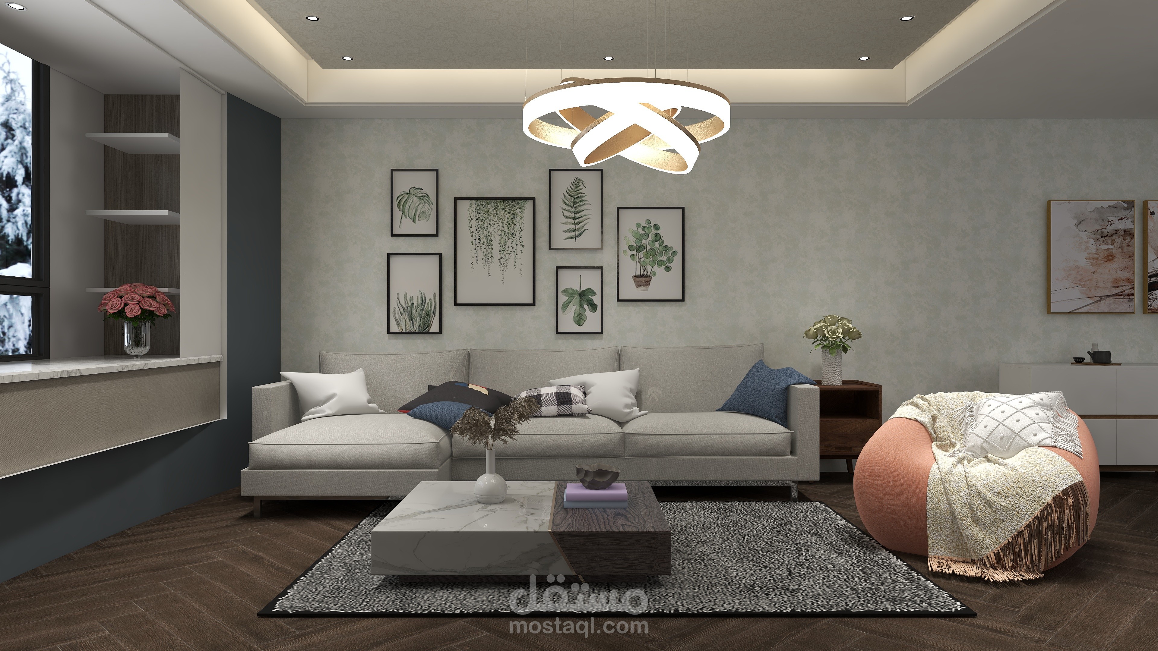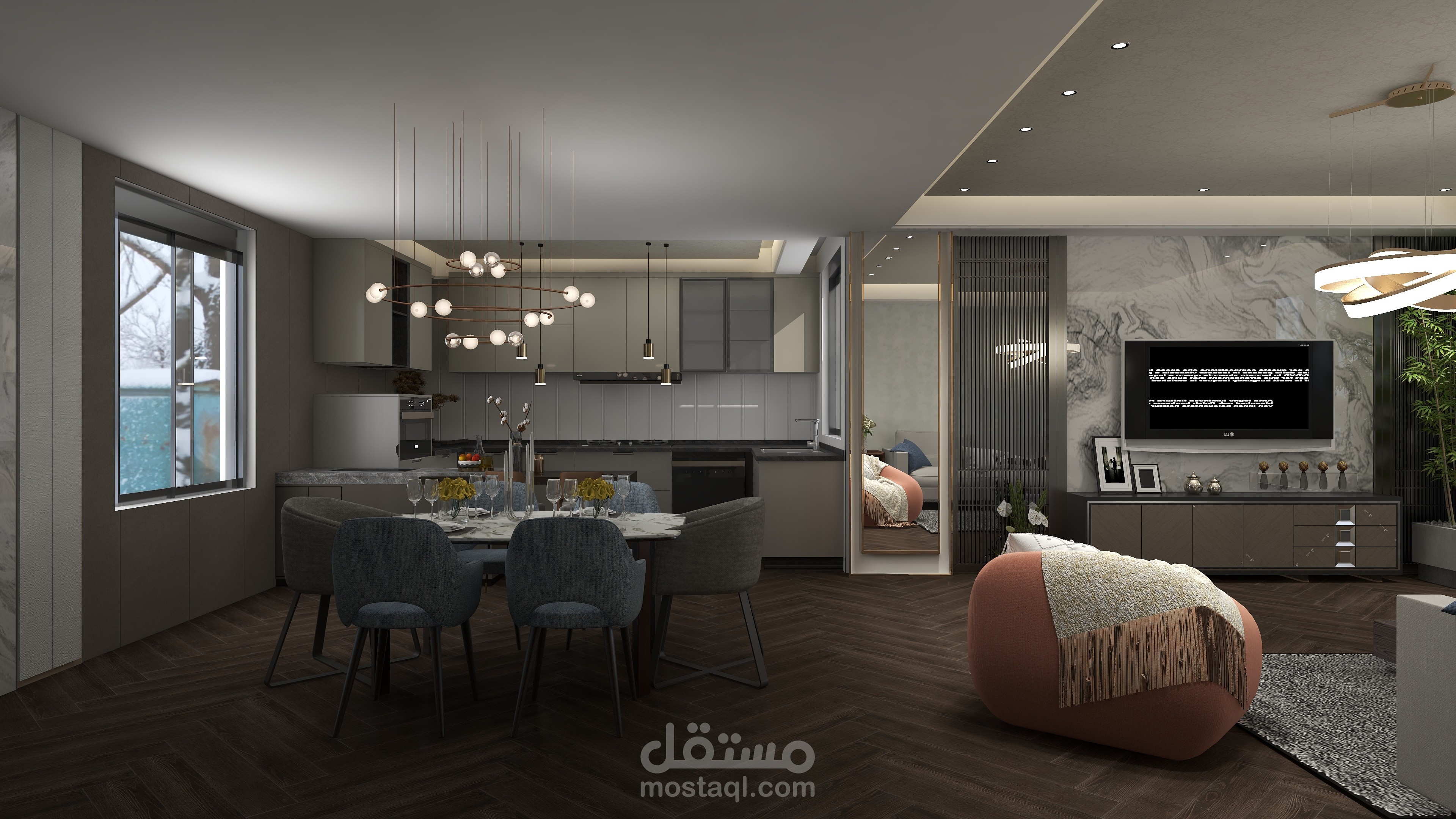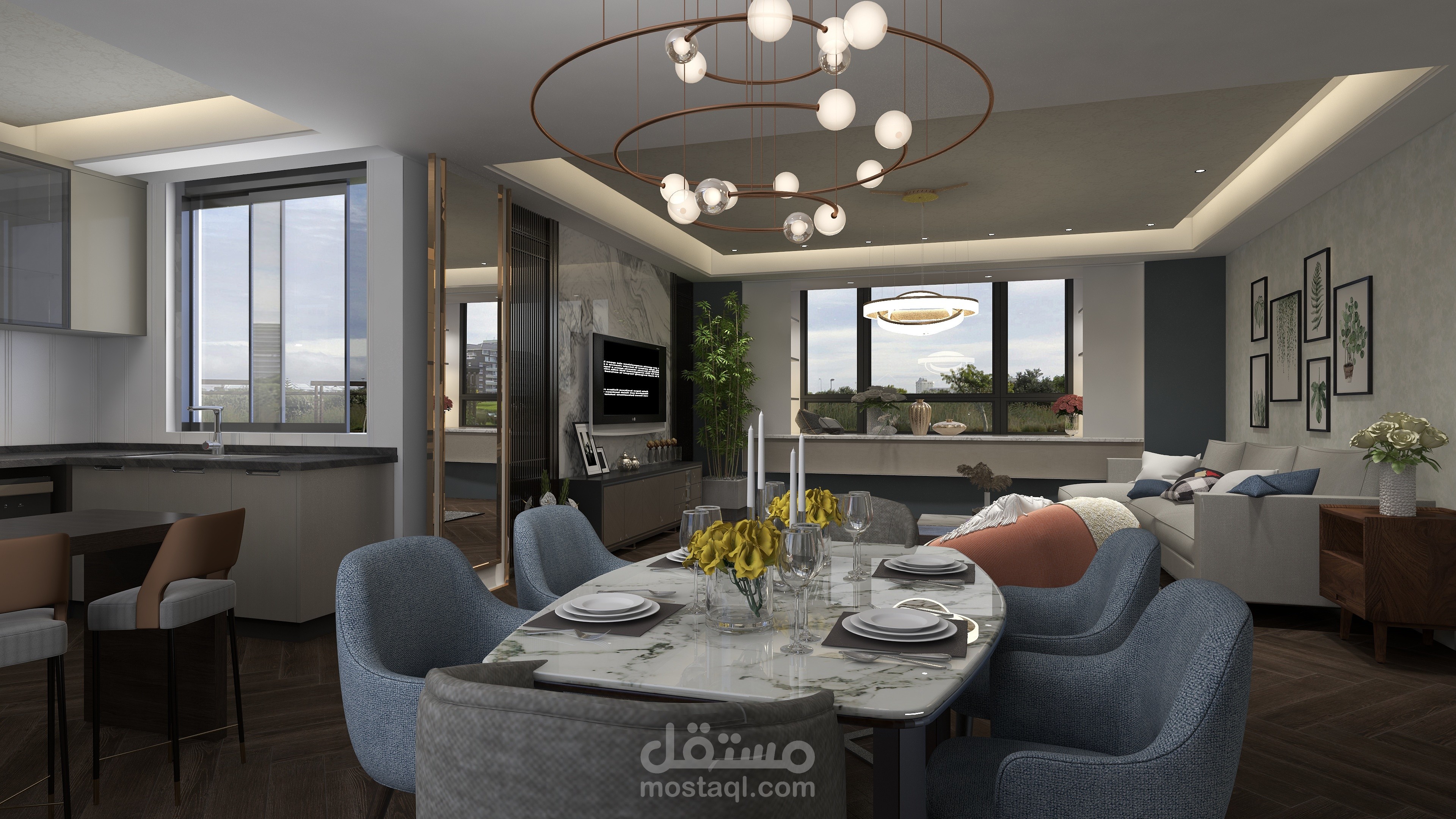 تتكون من غرفة جلوس مفتوحة على صالة طعام مطلة على المطبخ وغرفتي نوم وحمام وجلسة خارجية
