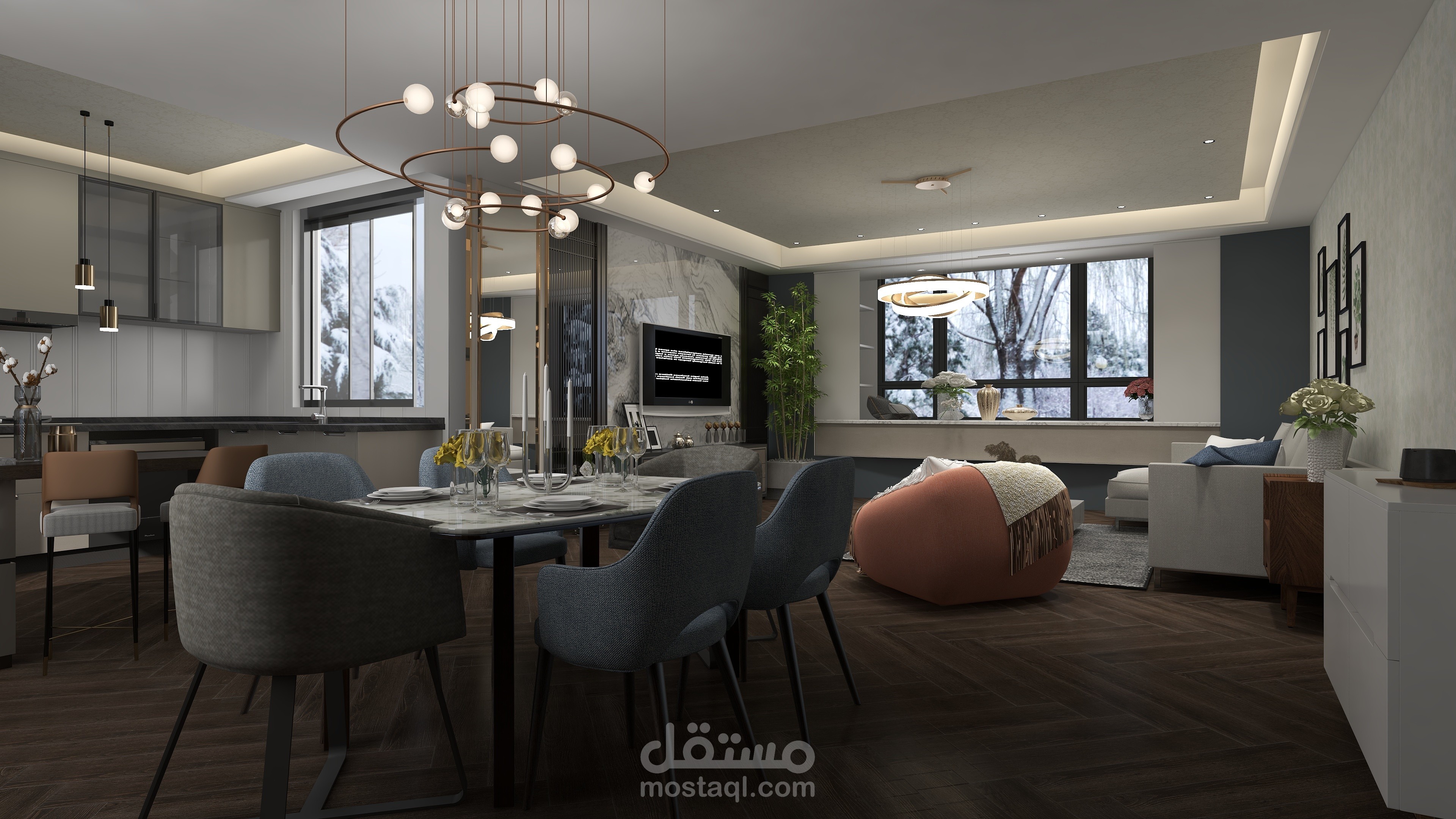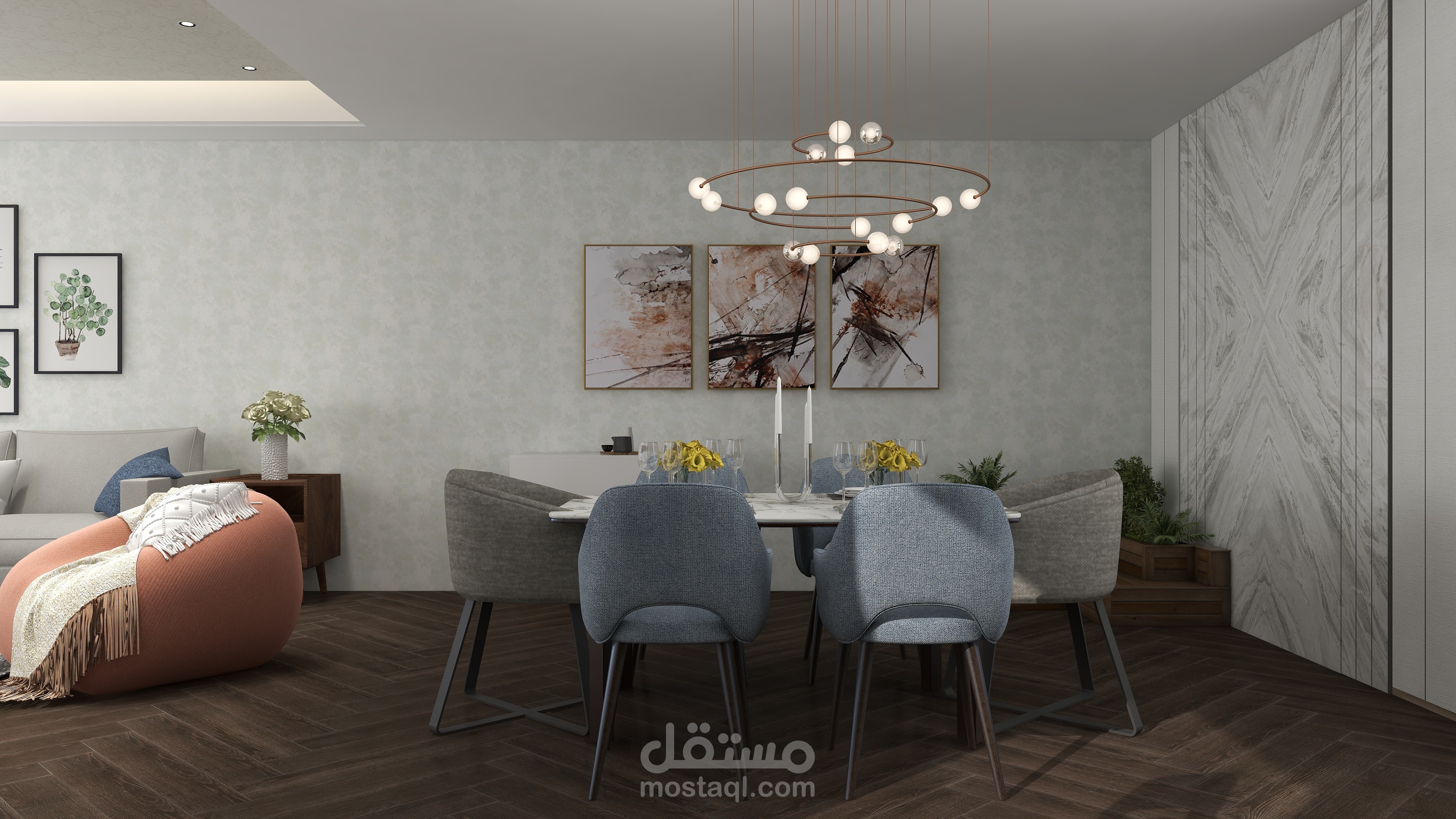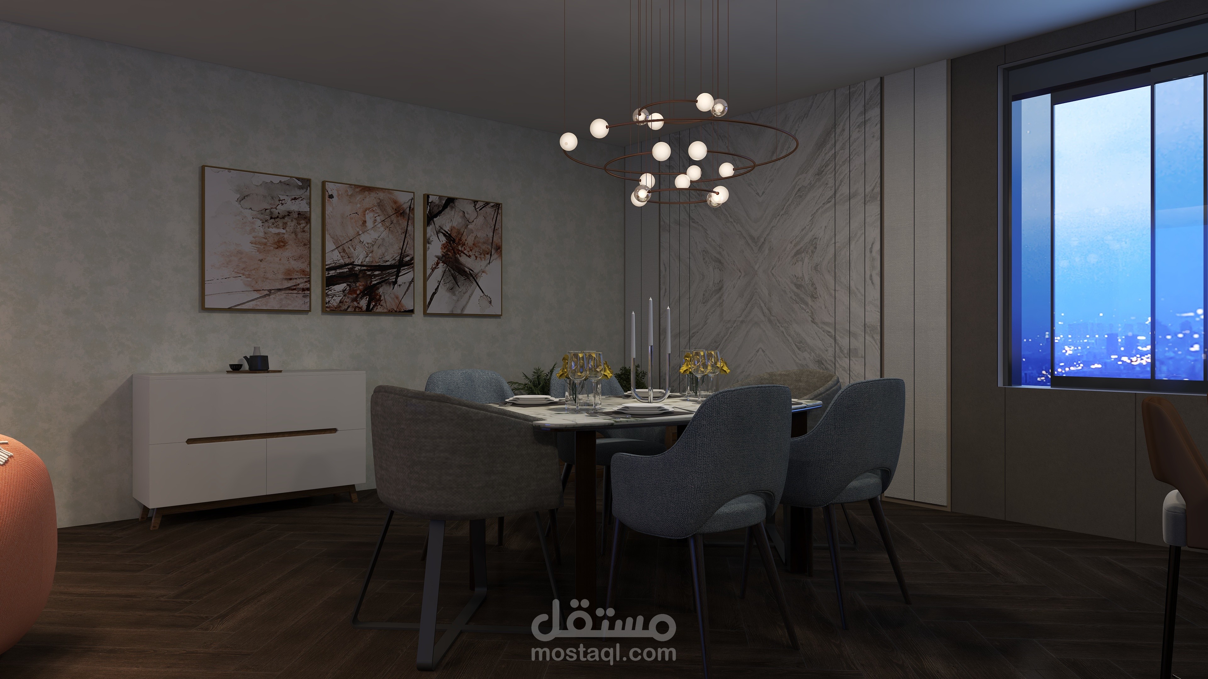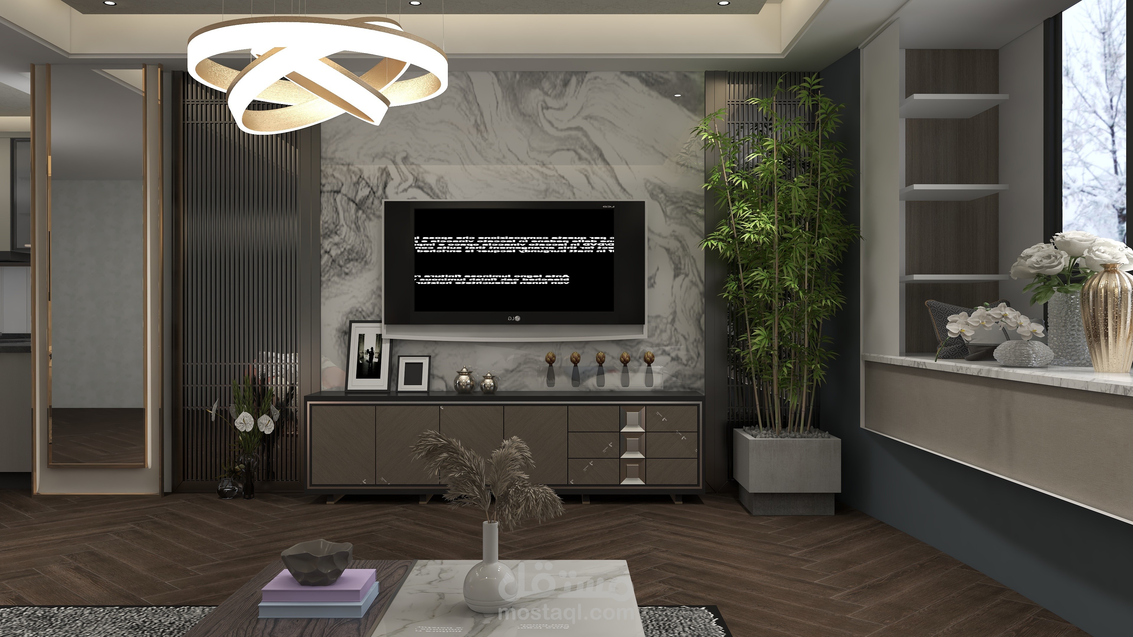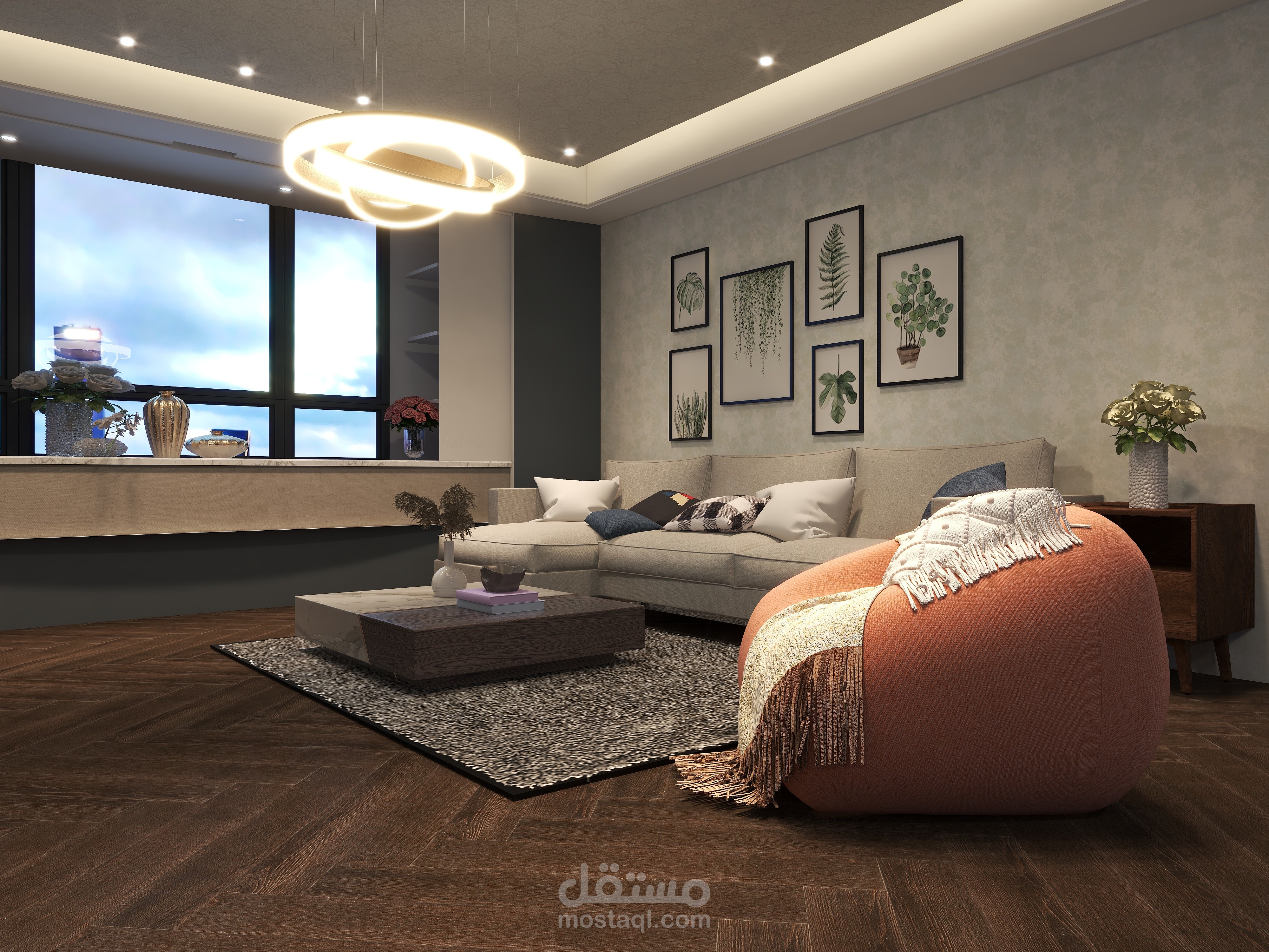 تتكون من غرفة جلوس مفتوحة على صالة طعام مطلة على المطبخ وغرفتي نوم وحمام وجلسة خارجية