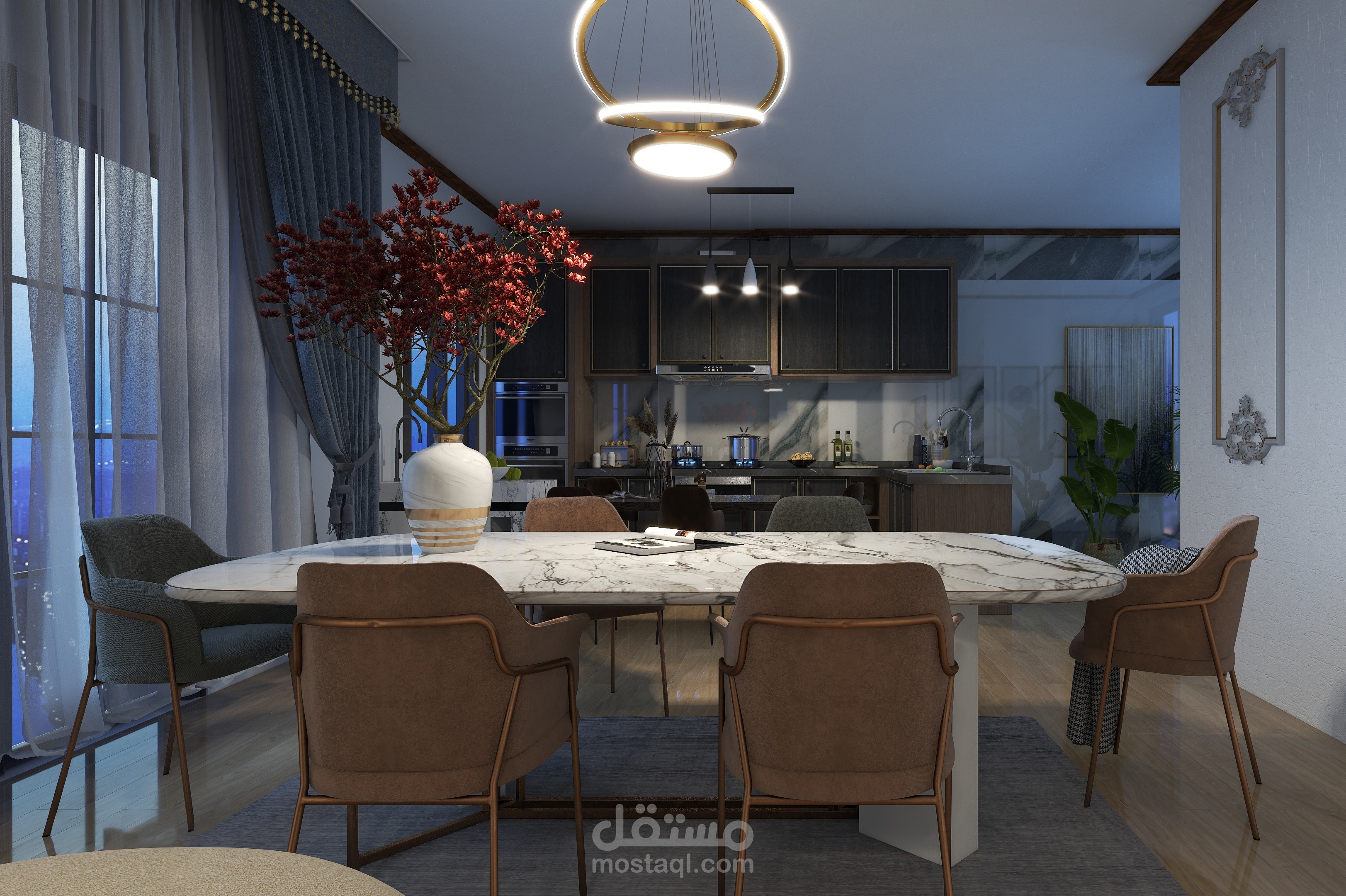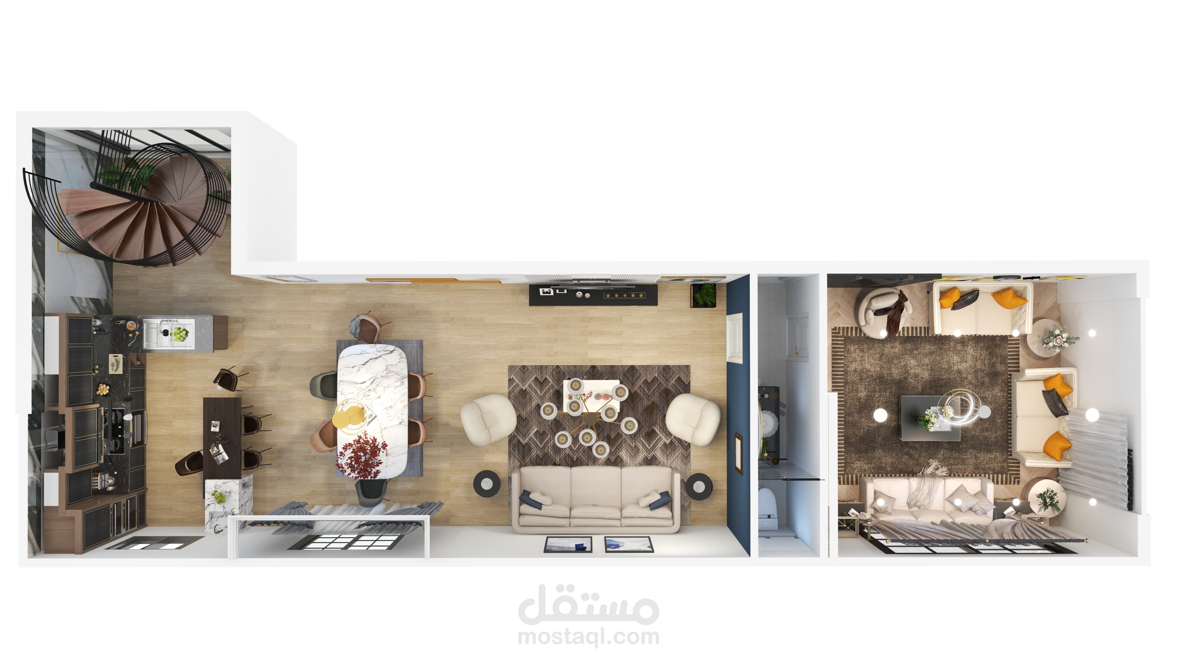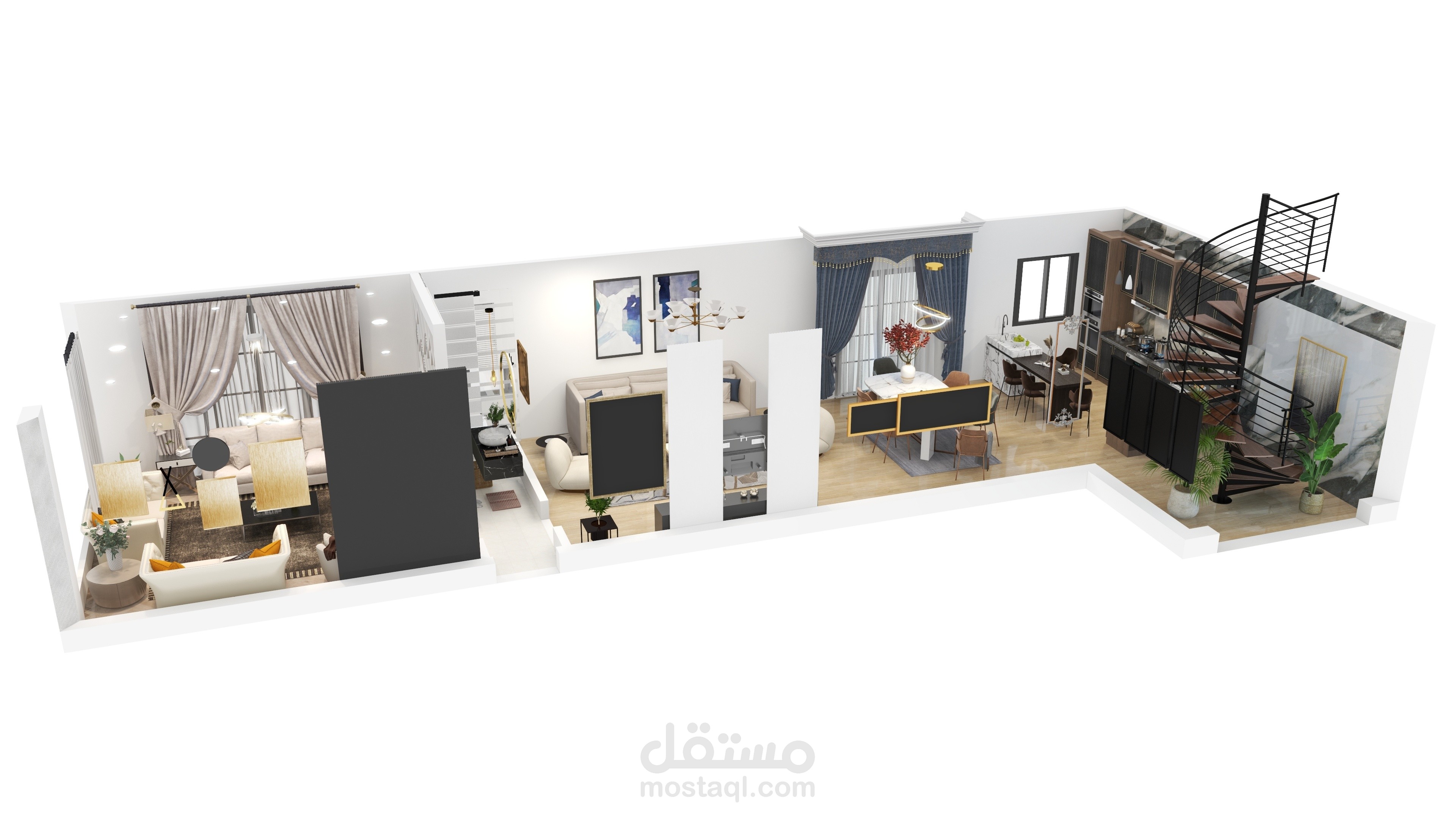 فيلا مكونة من طابقين تم تصميم الطابق الأرضي وتحتوي على غرفة معيشة وغرفة ضيوف وقاعة طعام مفتوحة على مطبخ