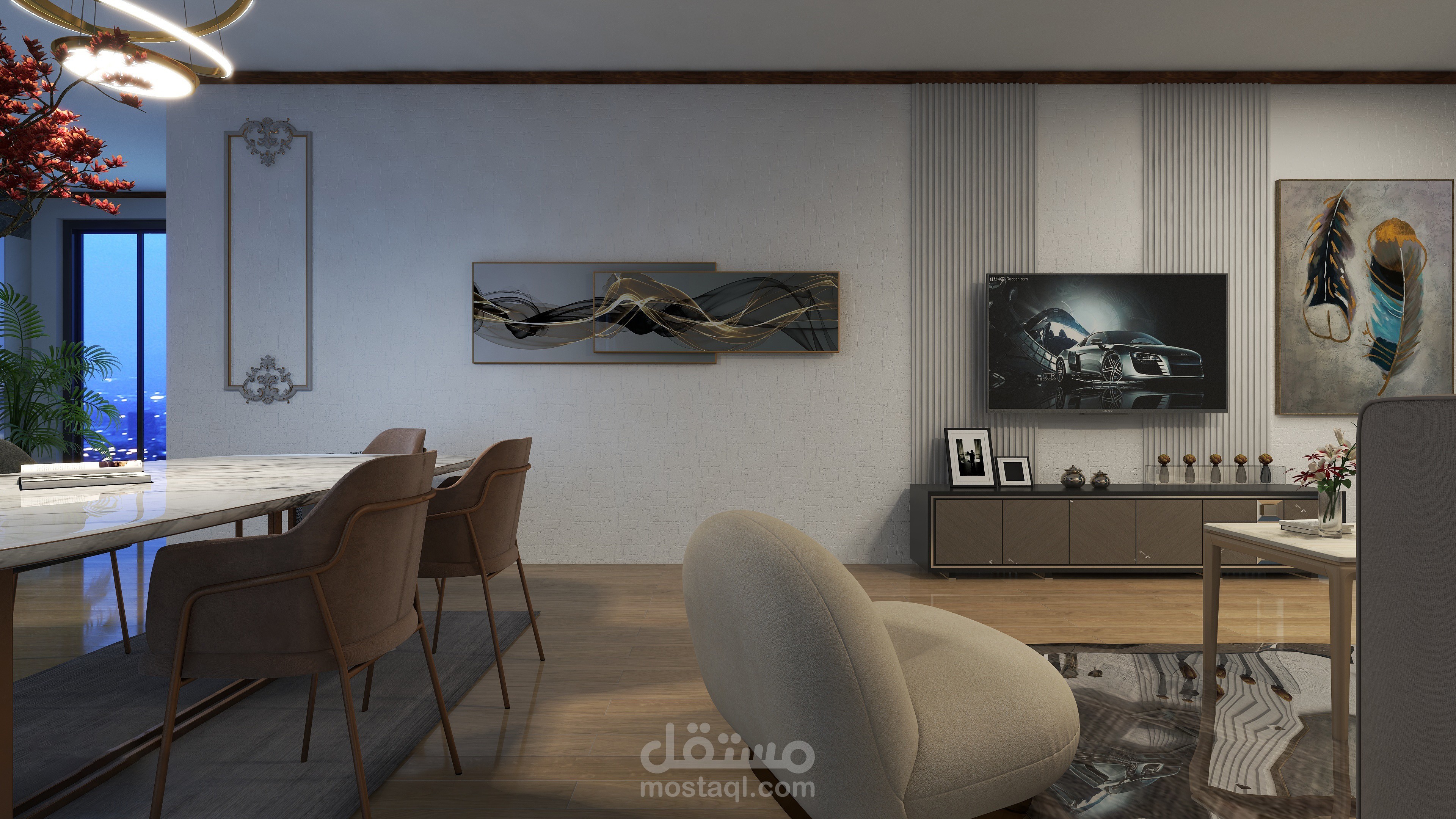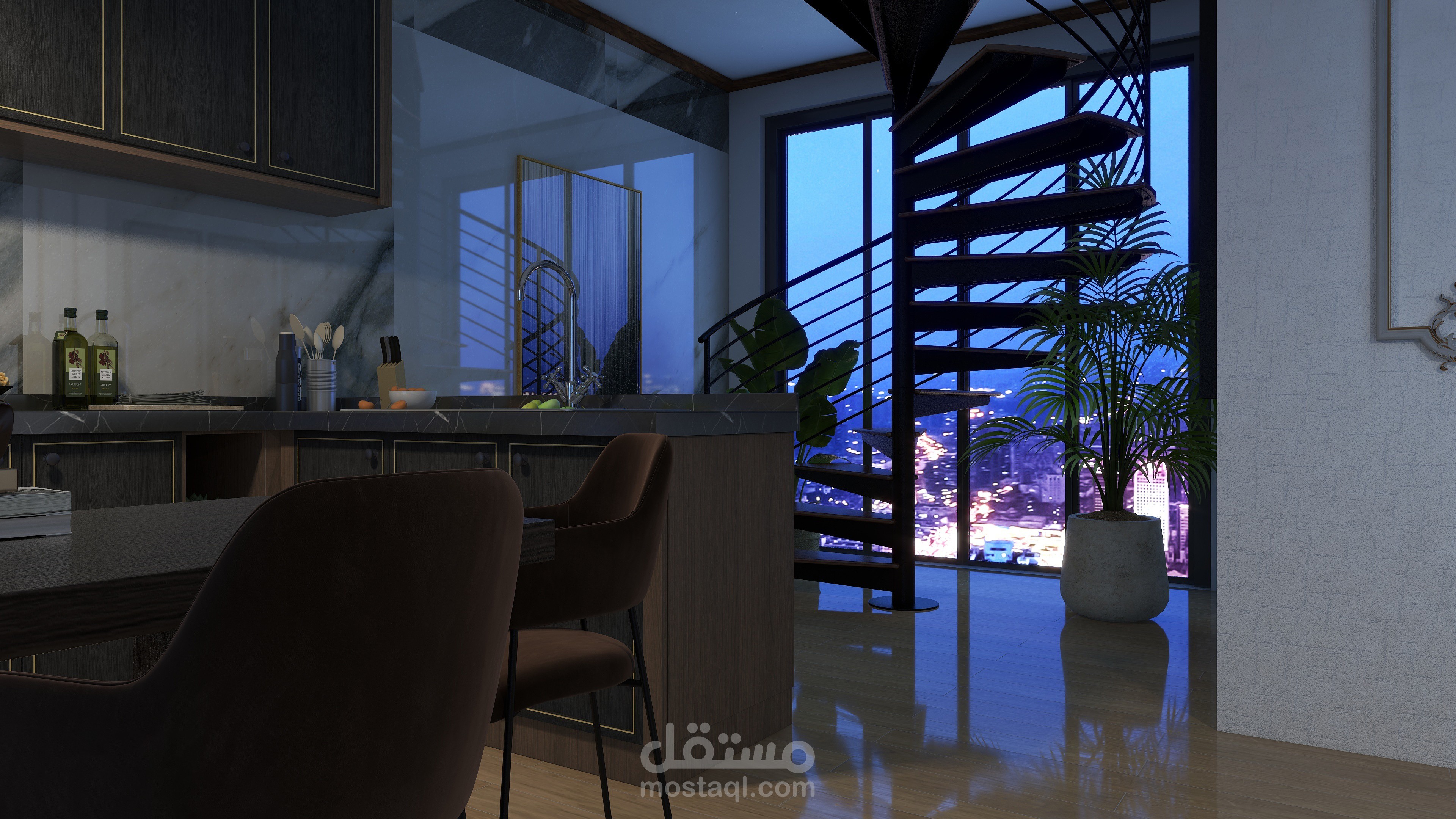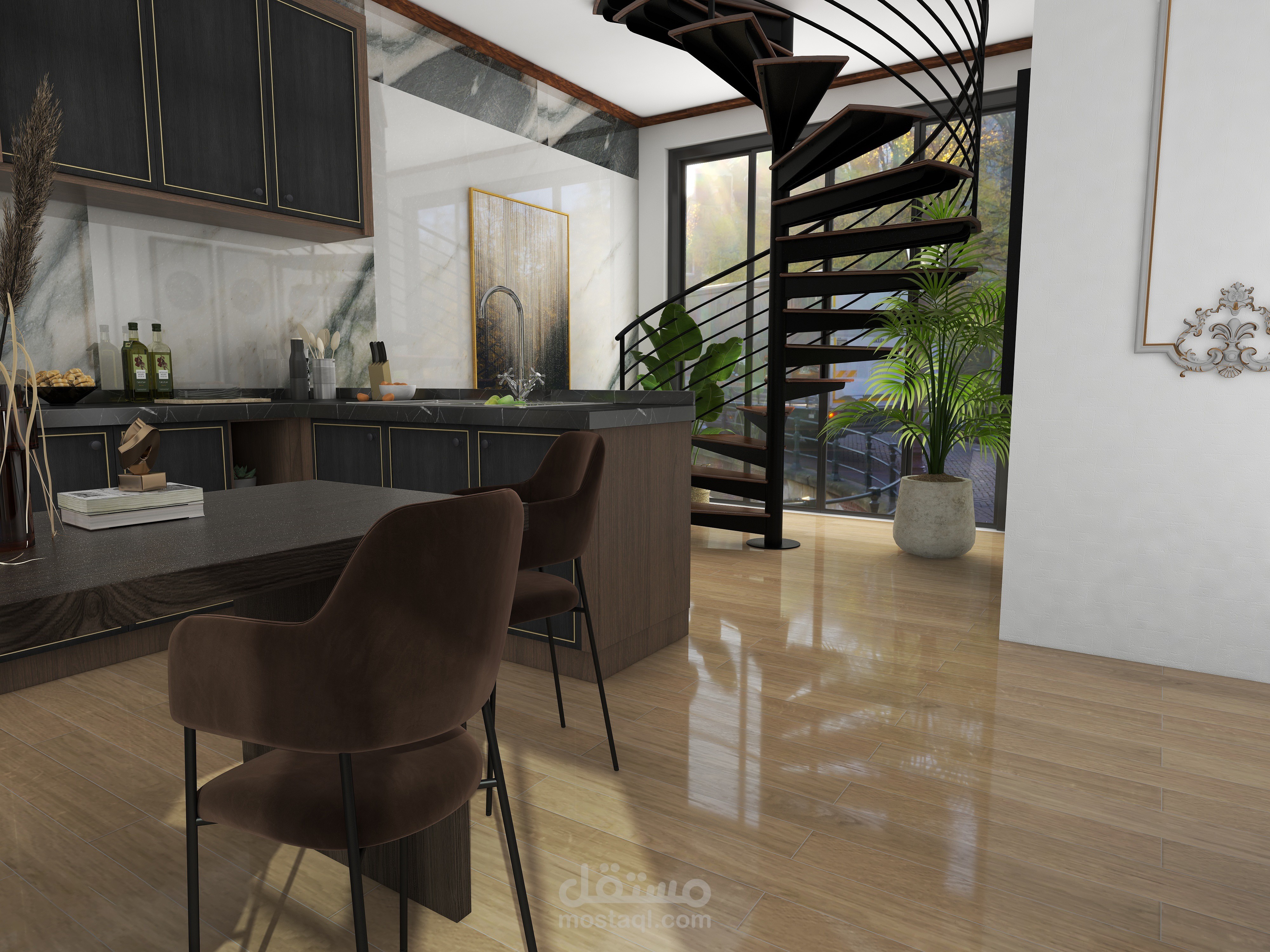 فيلا مكونة من طابقين تم تصميم الطابق الأرضي وتحتوي على غرفة معيشة وغرفة ضيوف وقاعة طعام مفتوحة على مطبخ