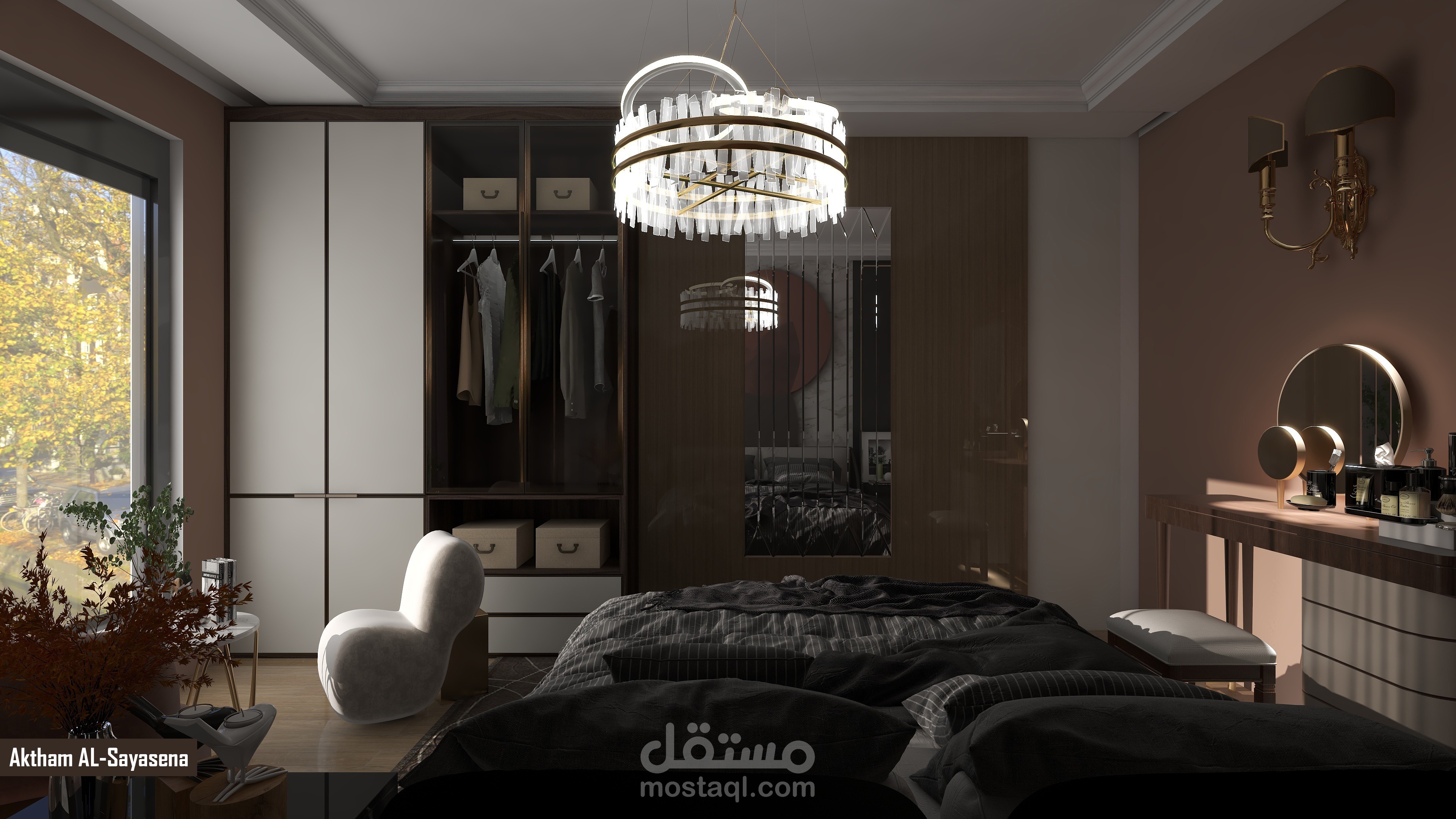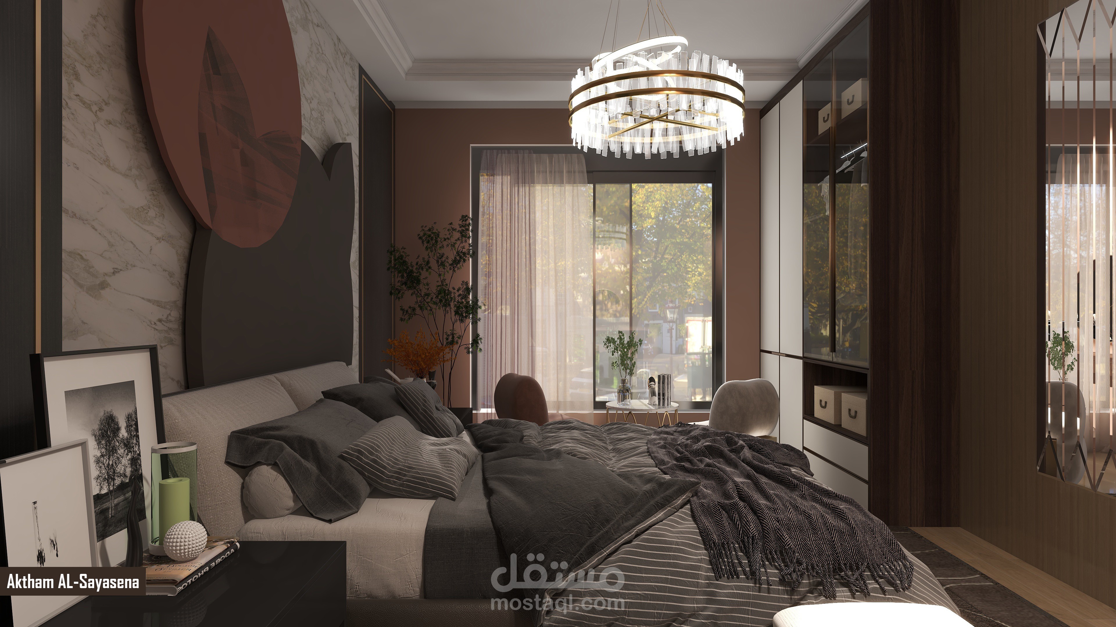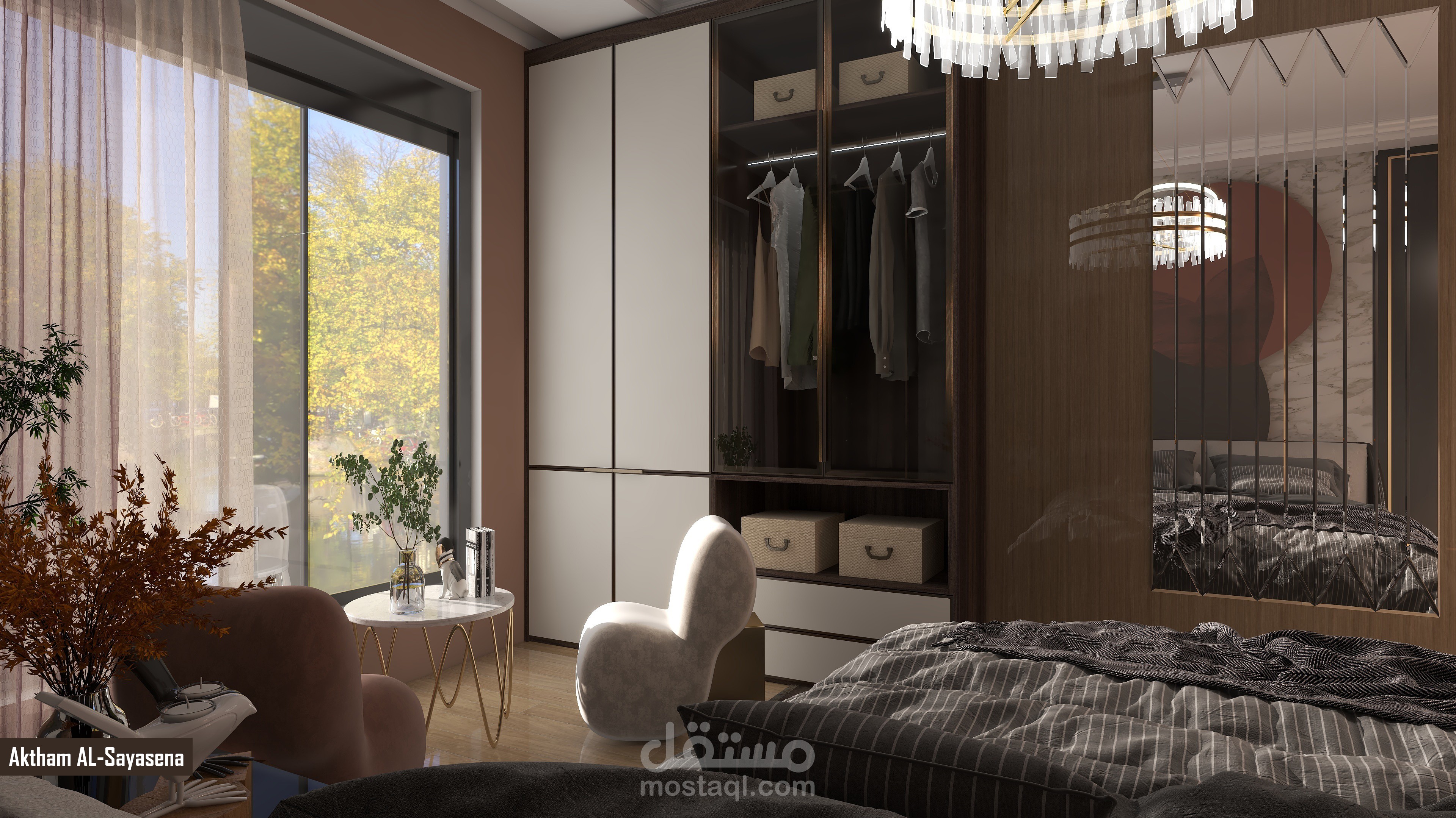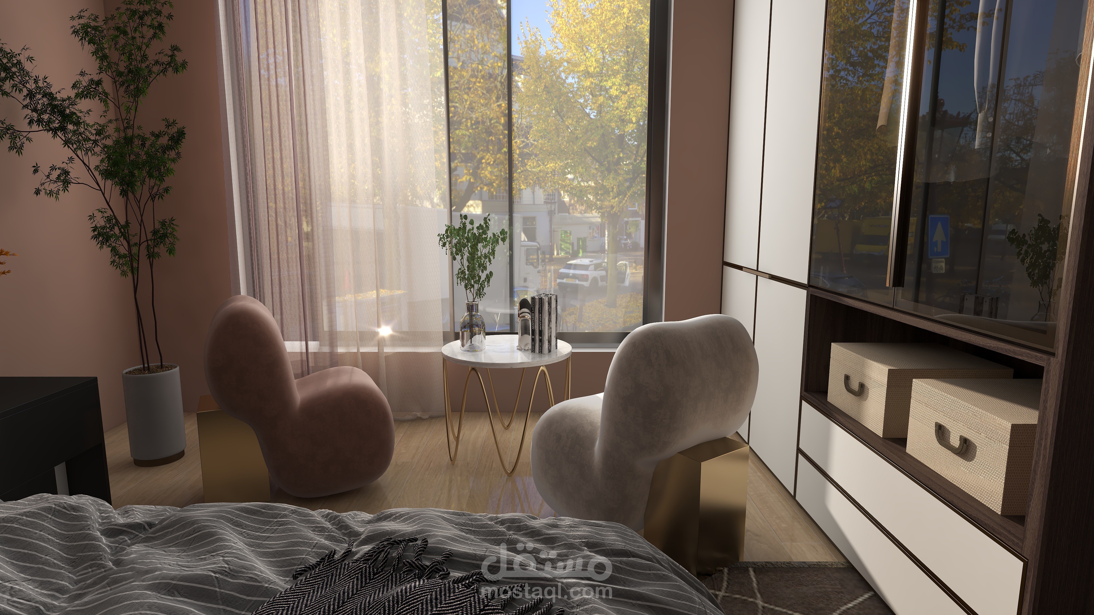 تصميم عصري لغرفة النوم أهم ما يميزها الديكور والألوان التي تمنح الراحة والثبات مع جلسة تطل على خارج الغرفة
