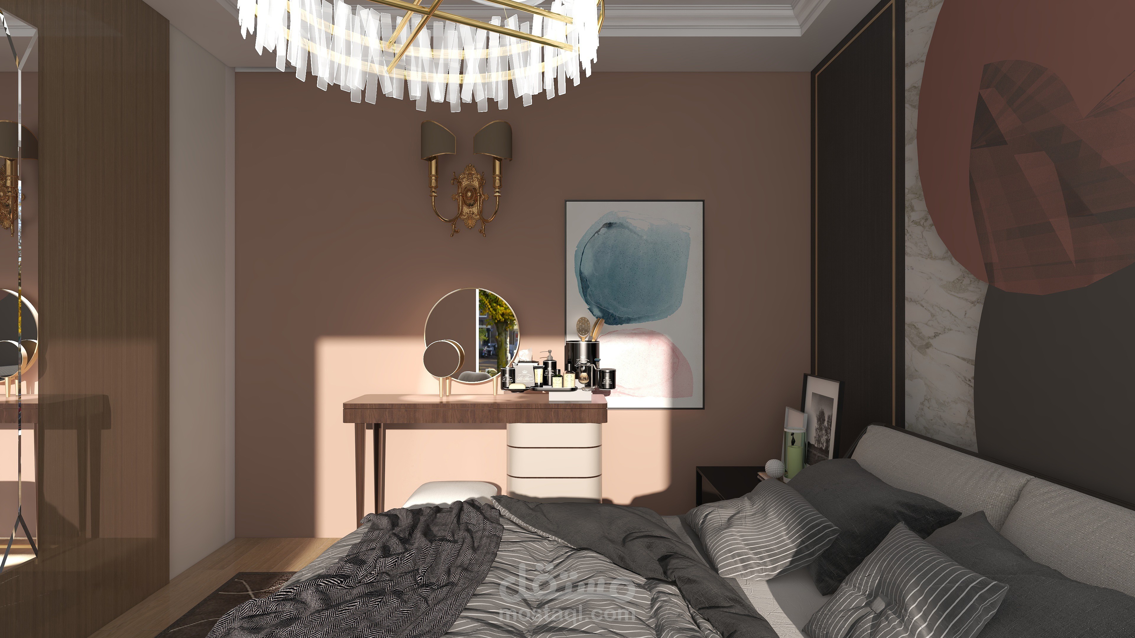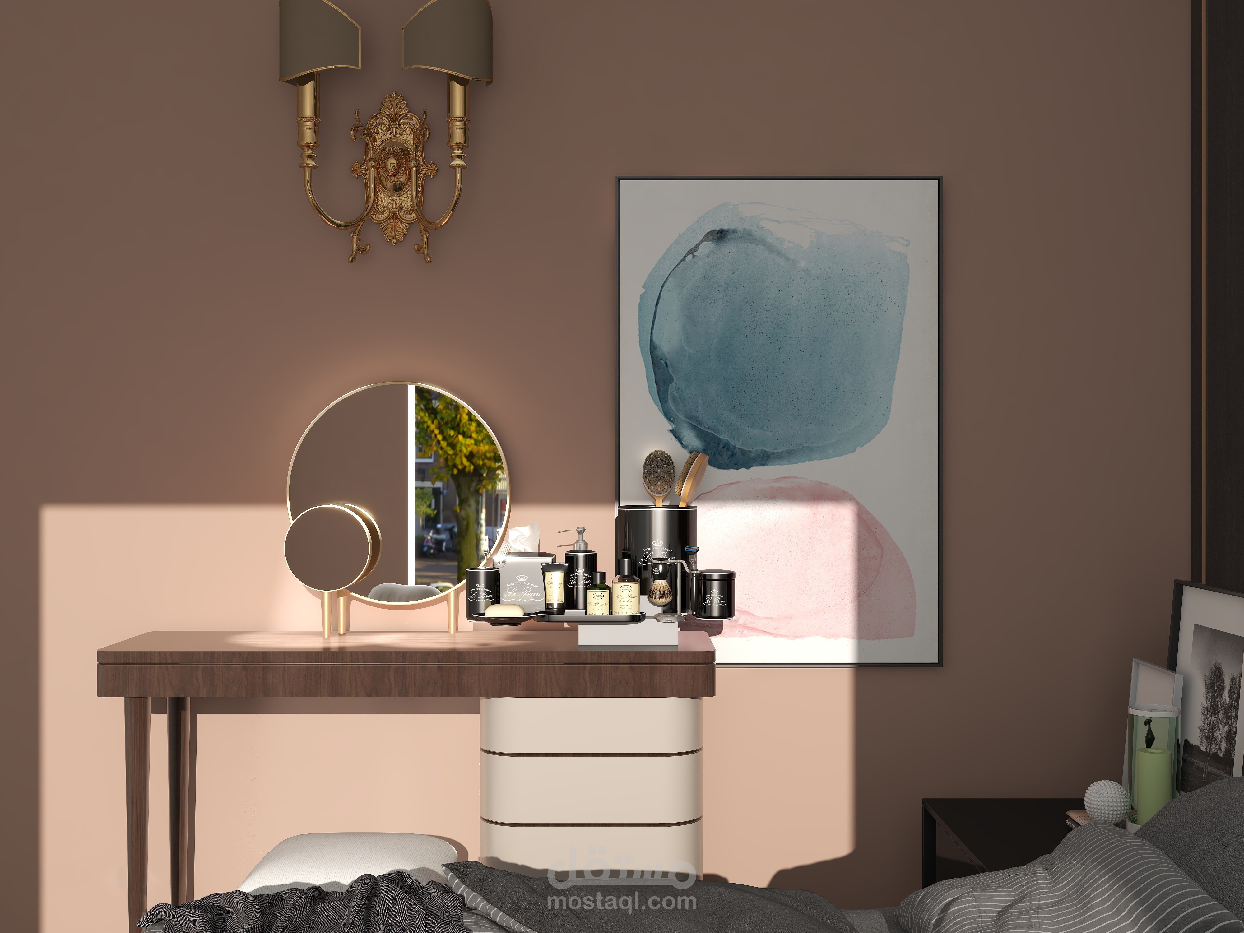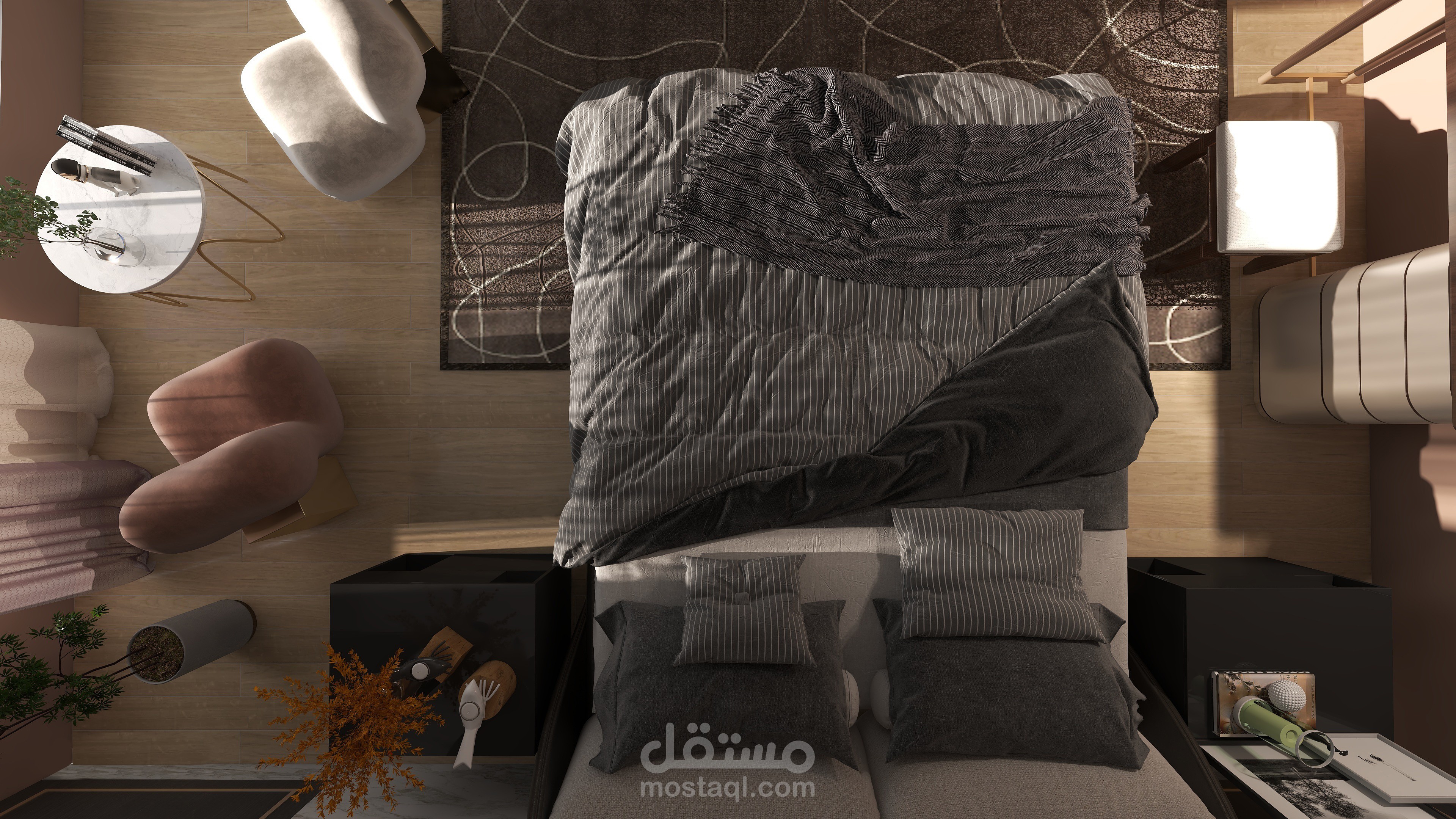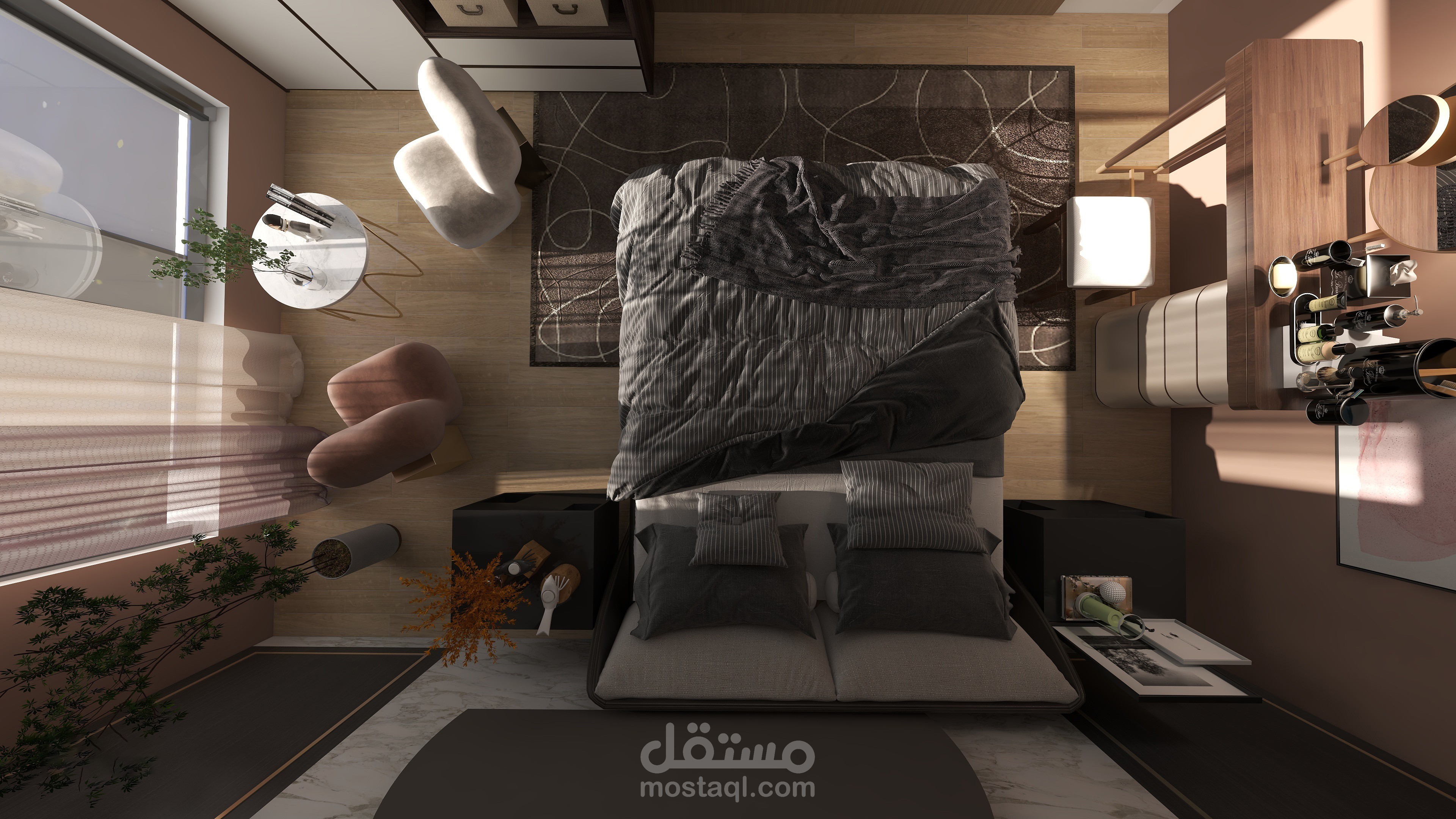تصميم عصري لغرفة النوم أهم ما يميزها الديكور والألوان التي تمنح الراحة والثبات مع جلسة تطل على خارج الغرفة