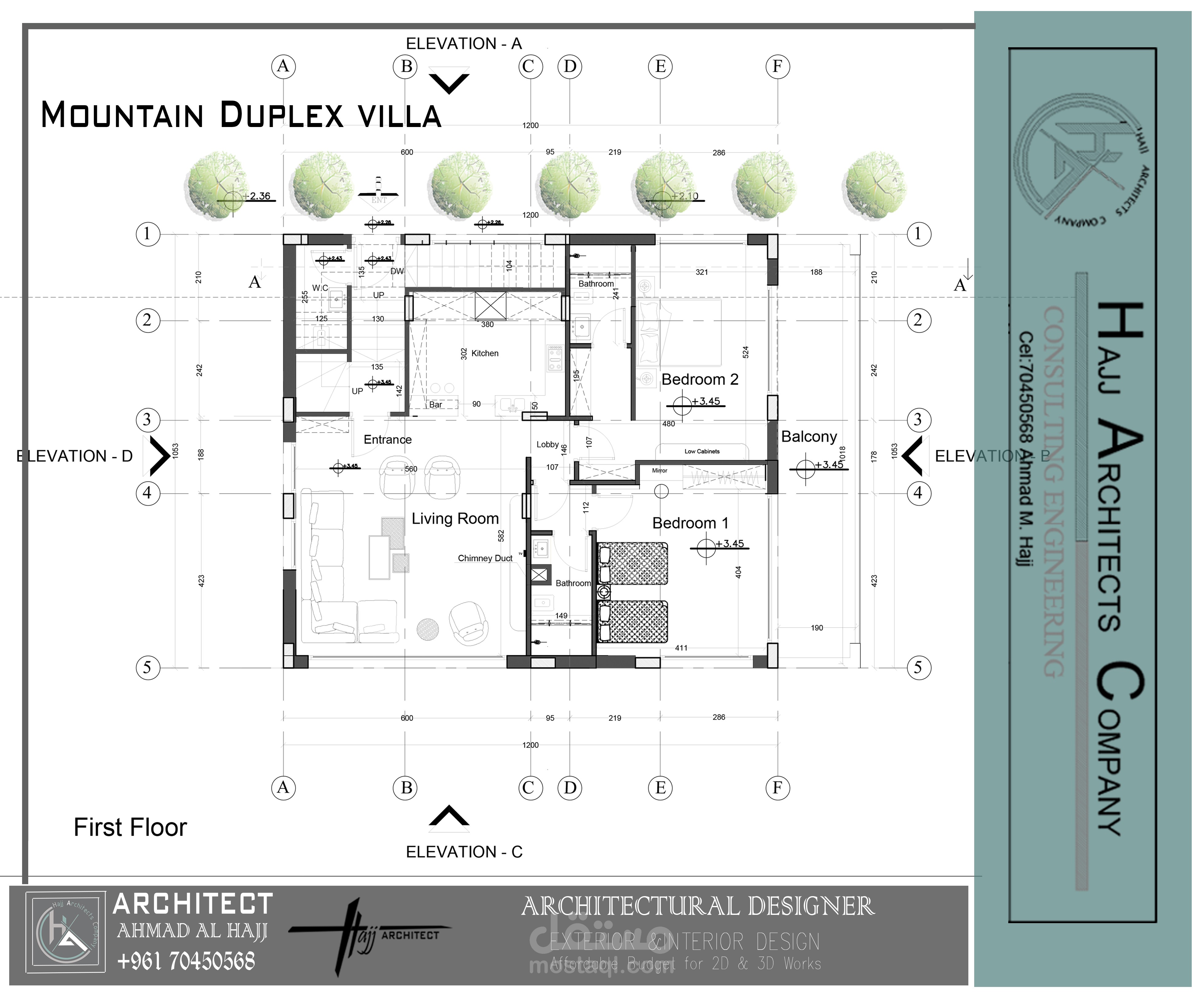 الطابق الأول بمستوى الطريق مساحة ١٠٠م٢ يحتوي على مدخل - درج موزع - حمام للضيوف - صالون مفتوح على مطبخ - غرف نوم ماستر عدد ٢ - وشرفة واسعة