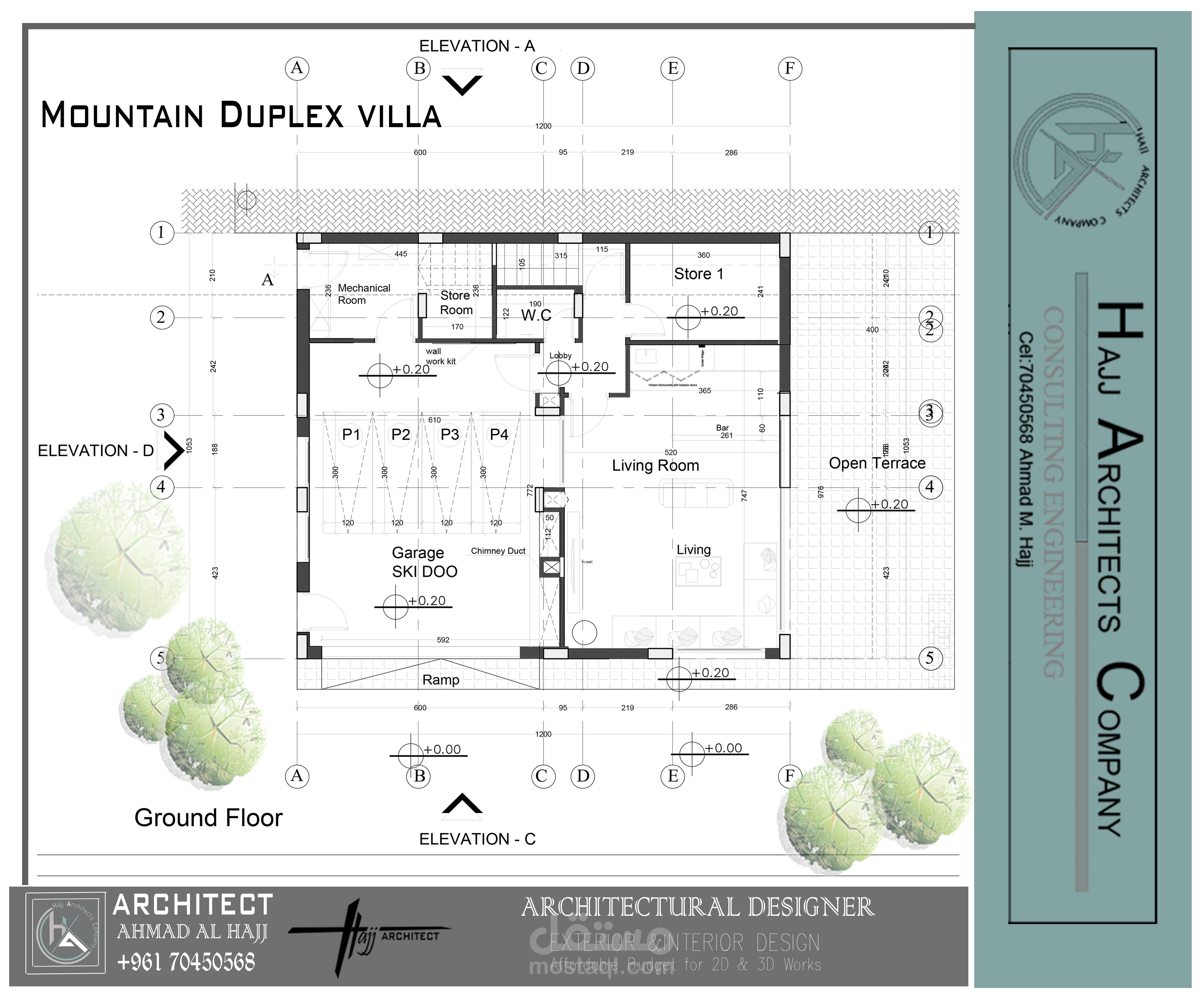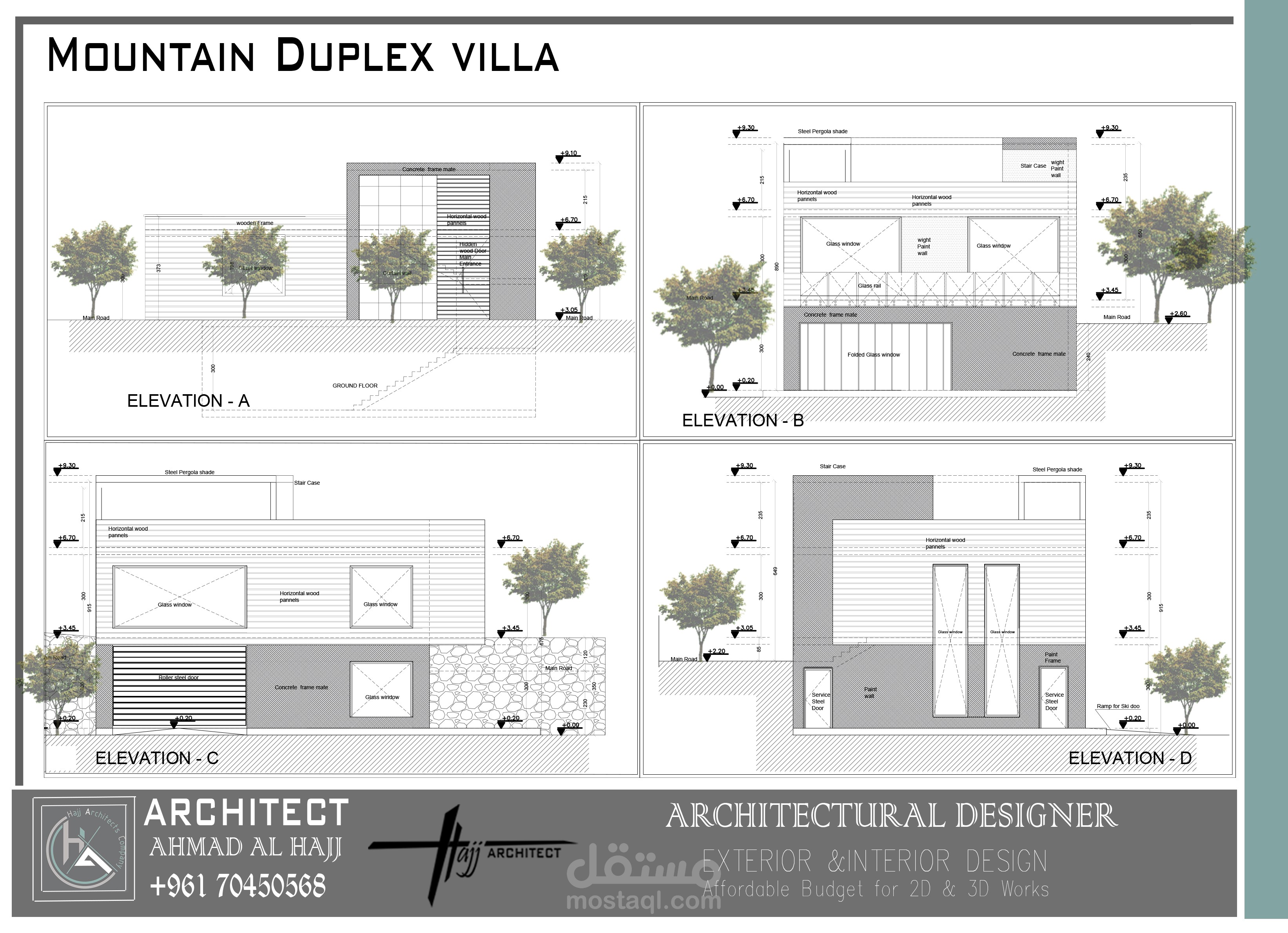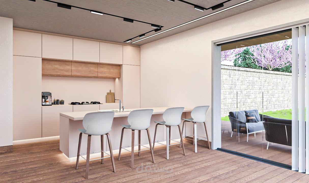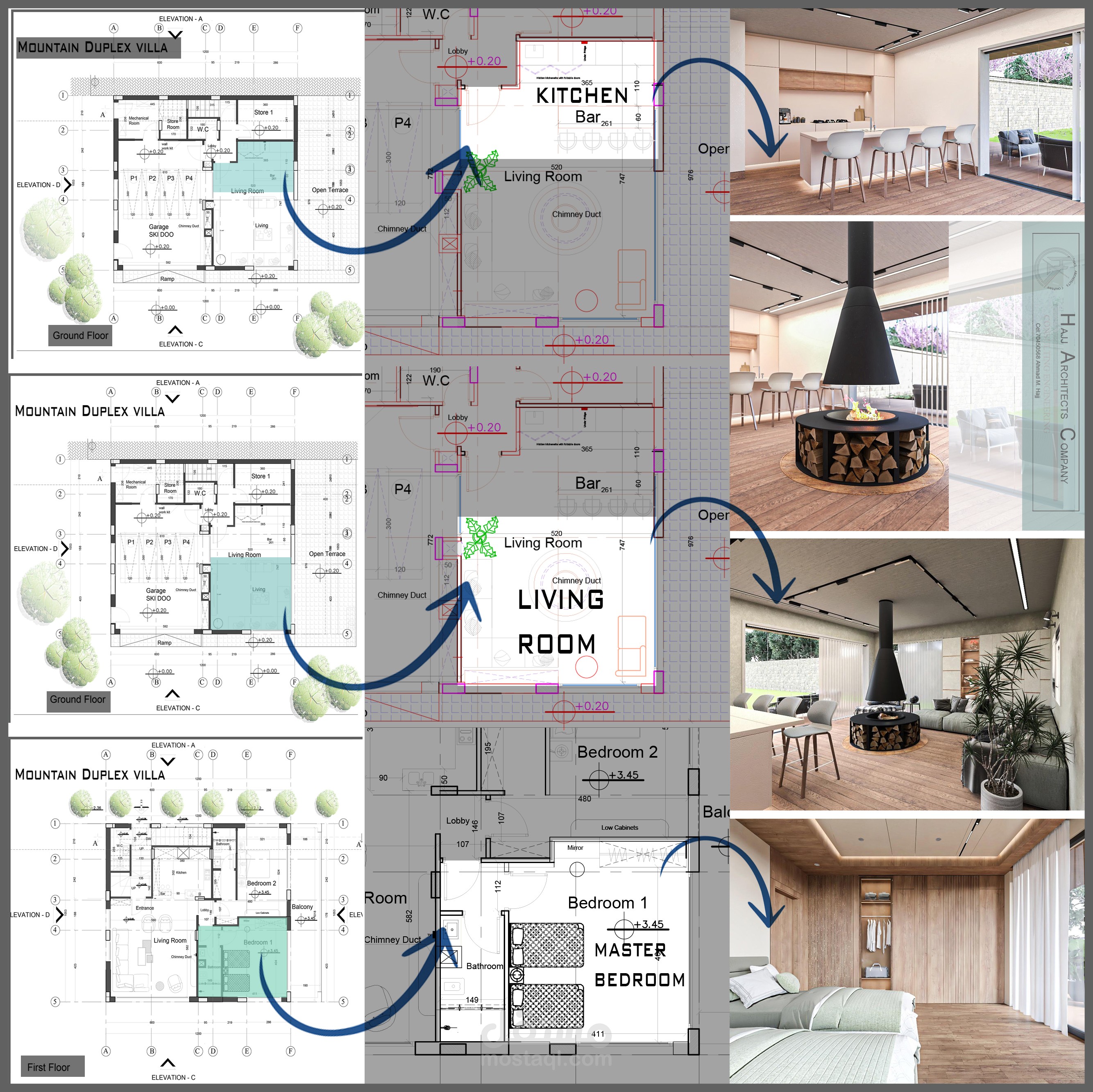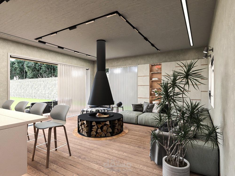 تتألف طابق أرضي يحتوي على غرفة جلوس ضمنها مدفئة على الحطب للشتاء ومطبخ. غرفة الجلوس مصممة واجهتا من الزجاج الدبل المطوي حيث تصبح مفتوحة على التراس الخارجي والحديقة .