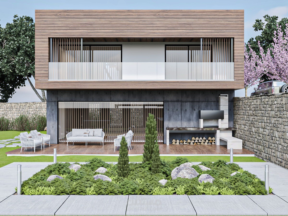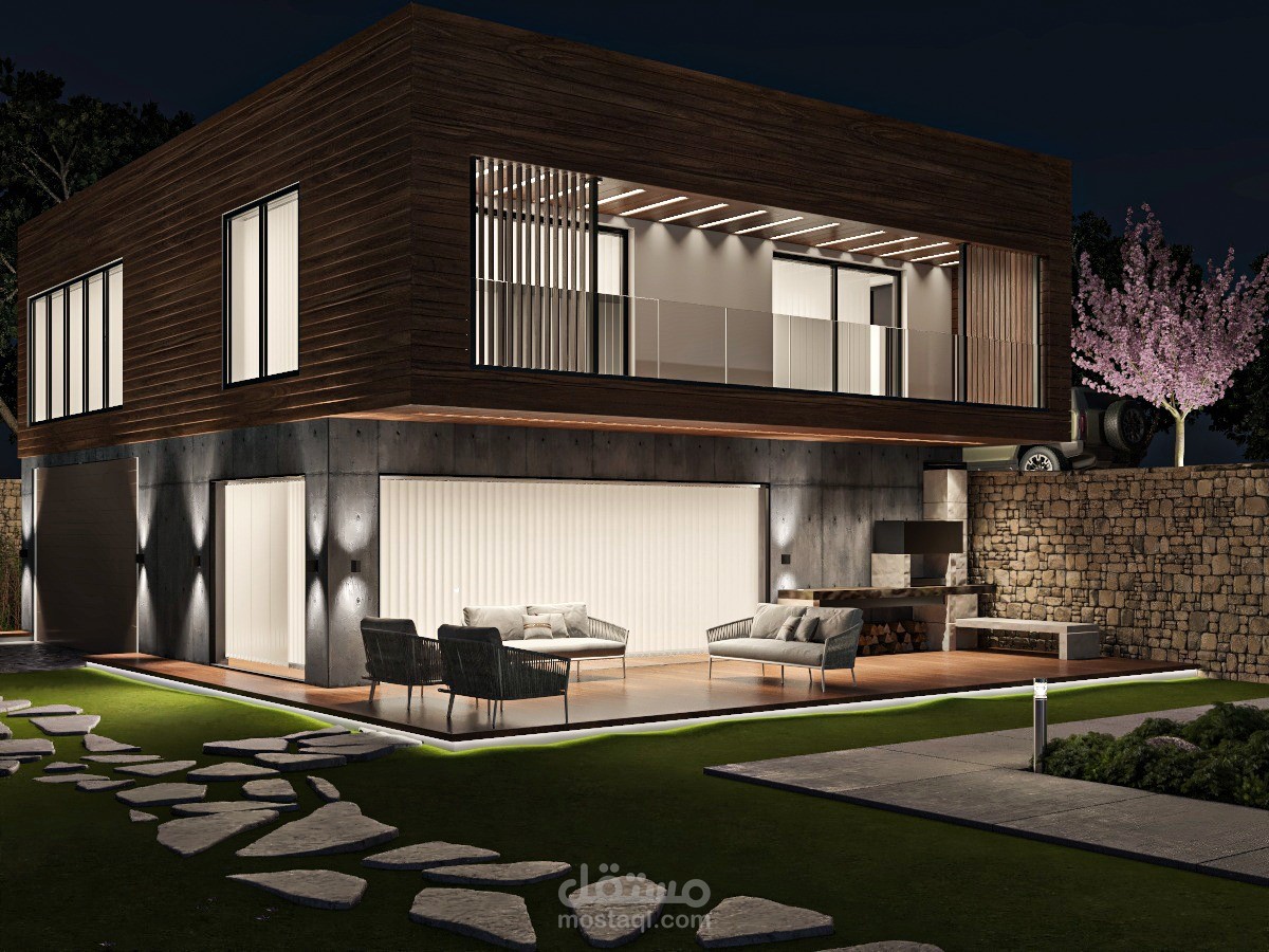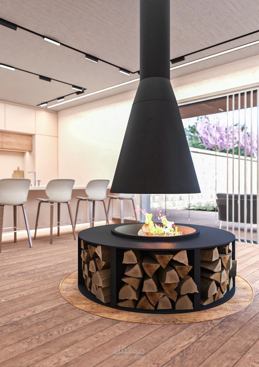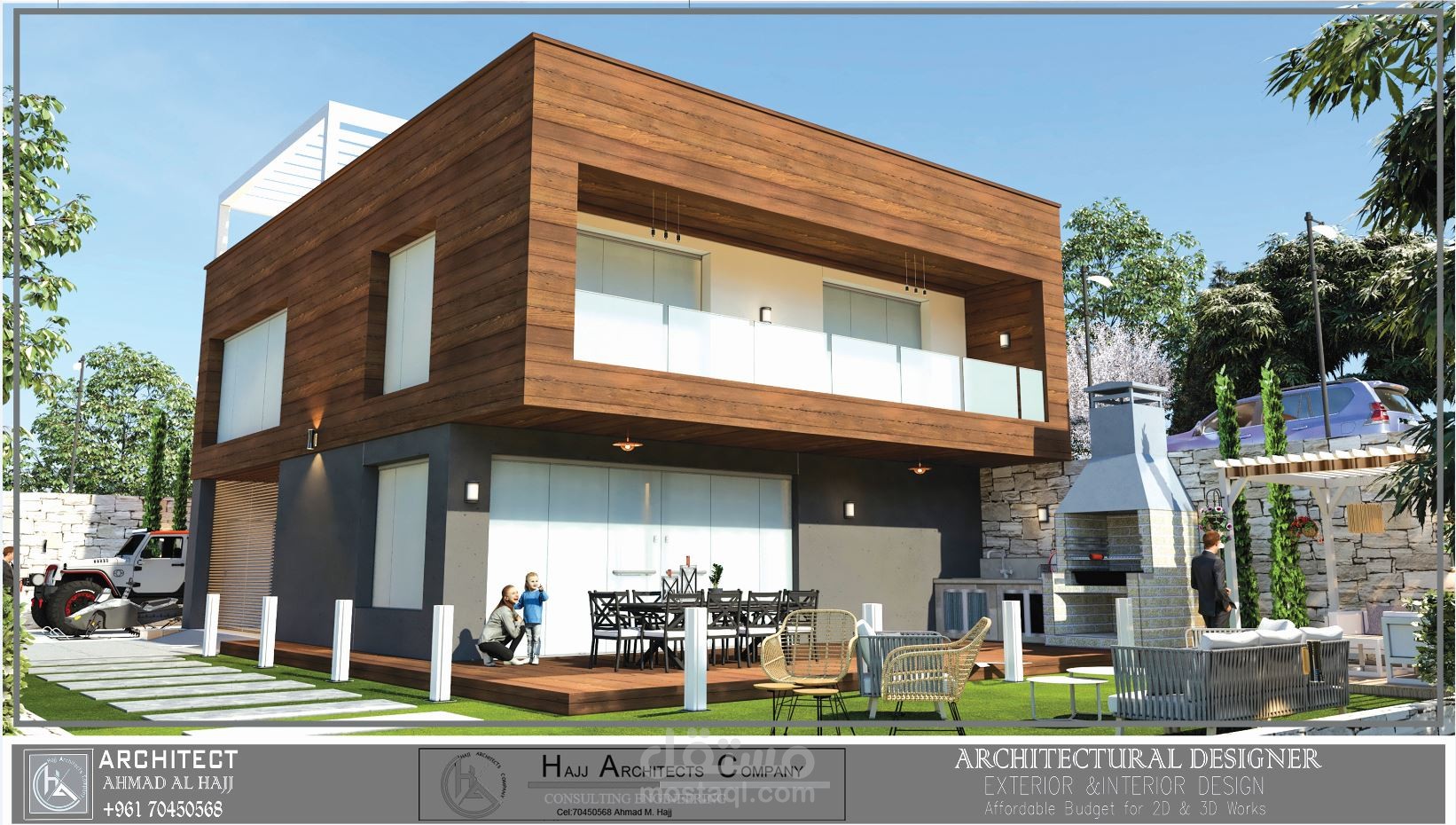 التراس الخارجي صمم فيه جلسات ومواقد للشواء .