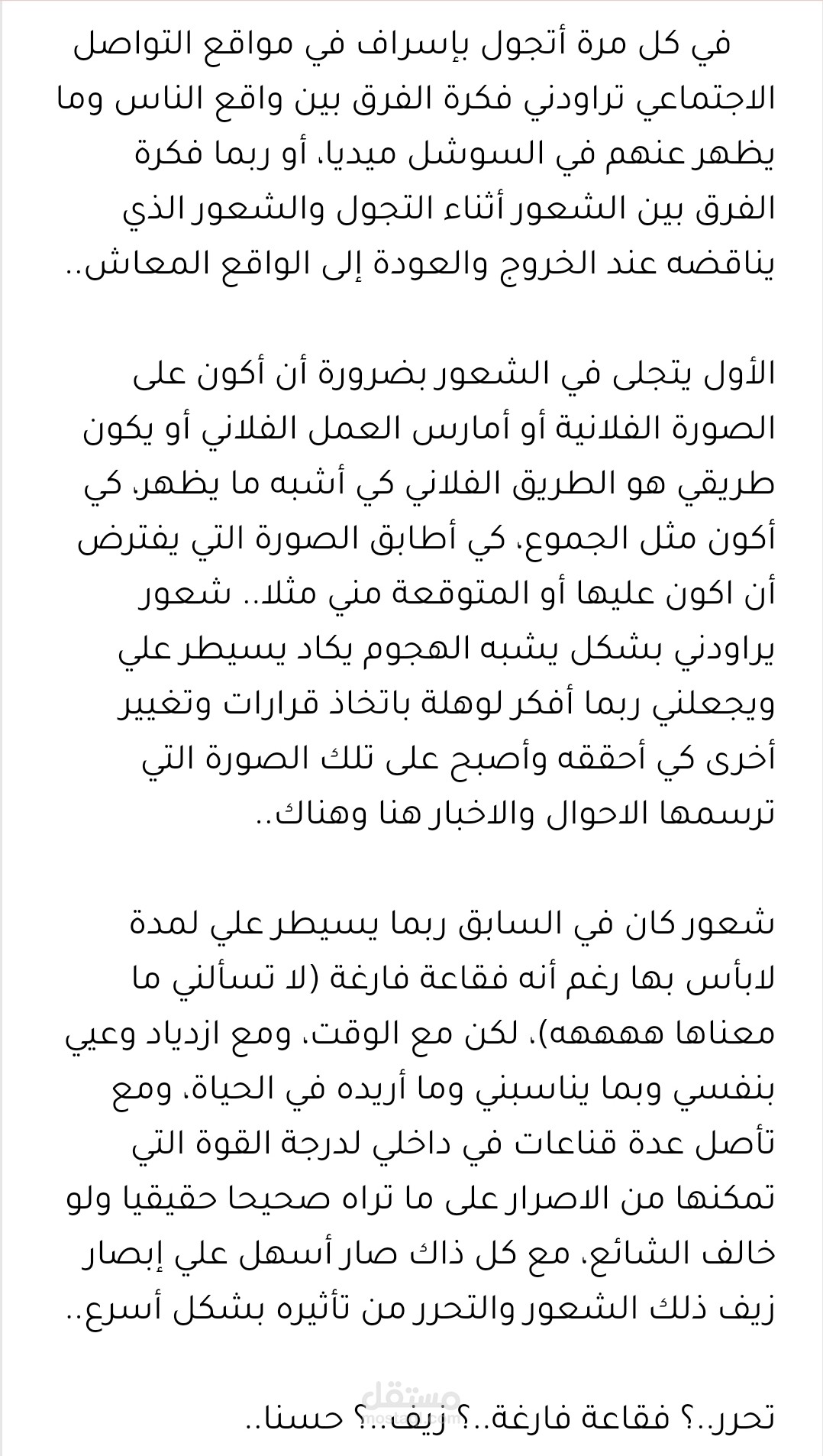 كتبته بأسلوب يدمج بين السرد والتحليل، يخاطب القارئ بطريقة تجعل المعاني تصل إليه ليتمكن من التعامل الجيد مع أفكار المقارنة التي تراوده خاصة عند استخدام السوشل ميديا.