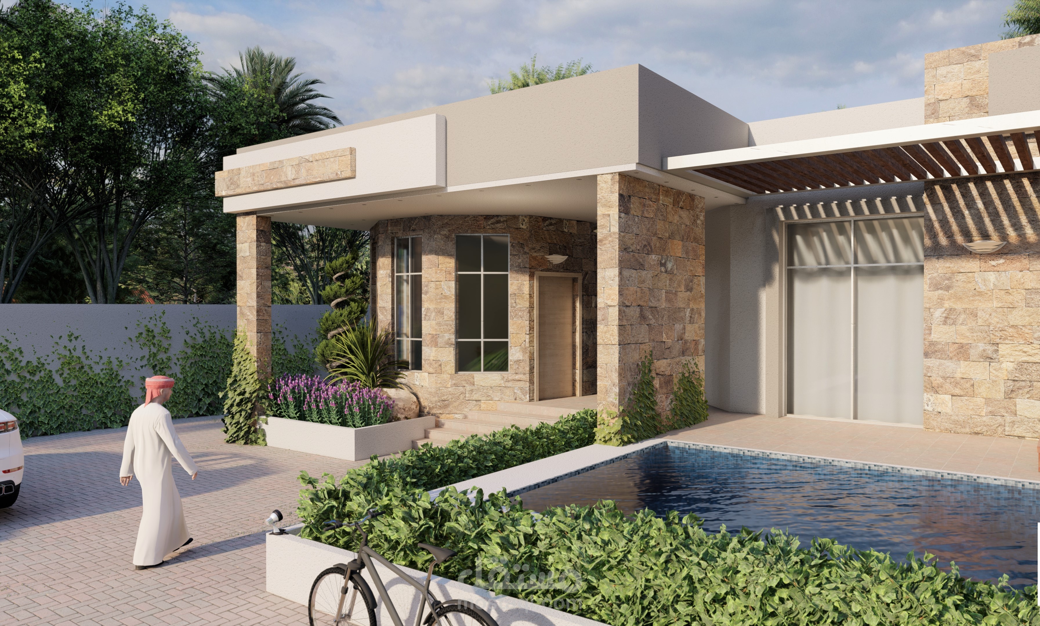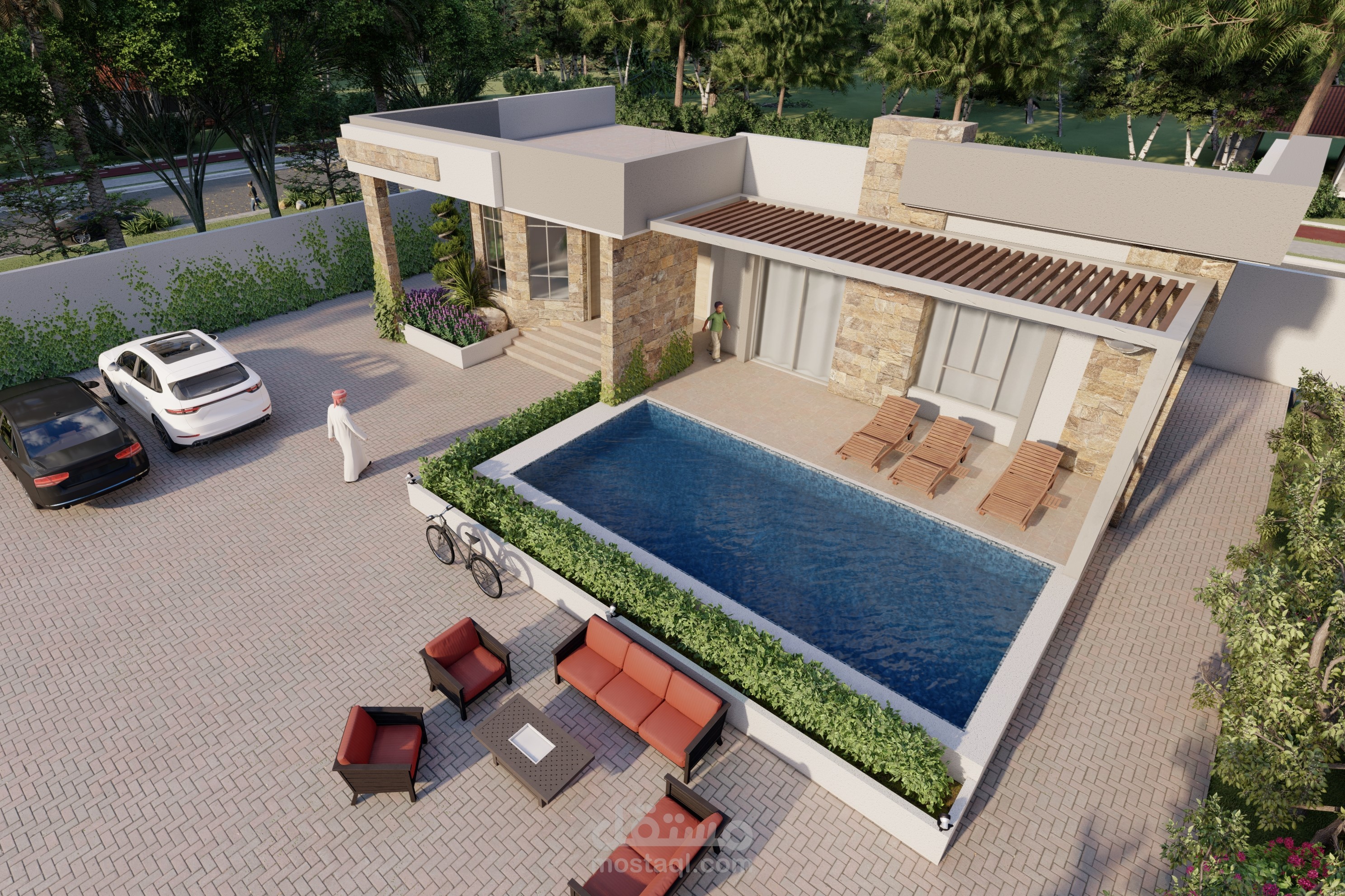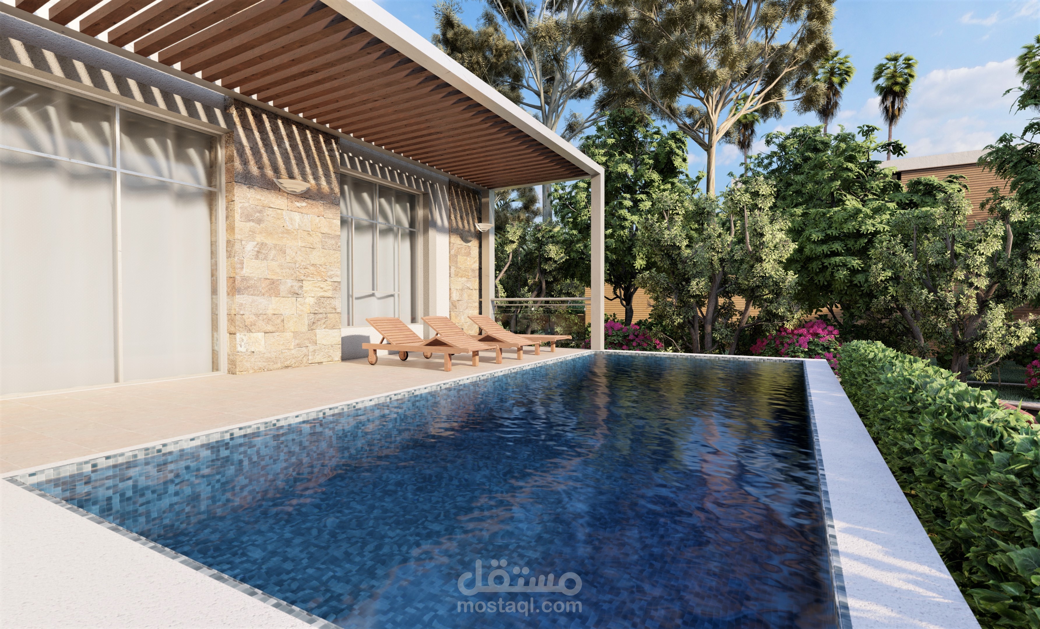 شاليه مكون من 3 غرف نوم و احده ماستر و مجلس نساء و مجلس رجال مع الخدمات و مطبخ و غرفة طعام مطل على بركه سباحه و حديقة.