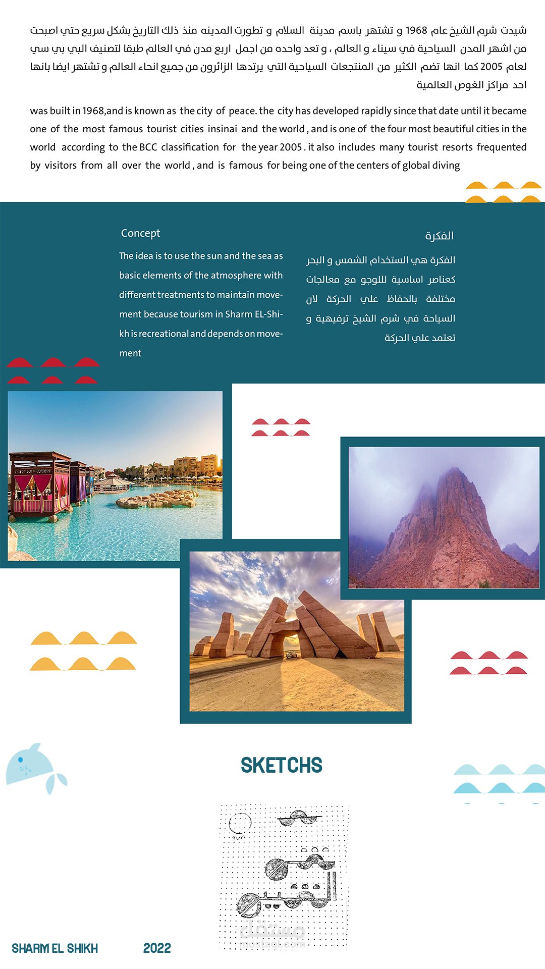 The idea is to use the sun and the sea as basic elements of the atmosphere with different treatments to maintain movement because tourism in Sharm El-Shikh is recreational and depends on movement