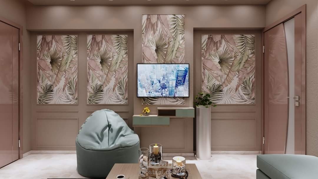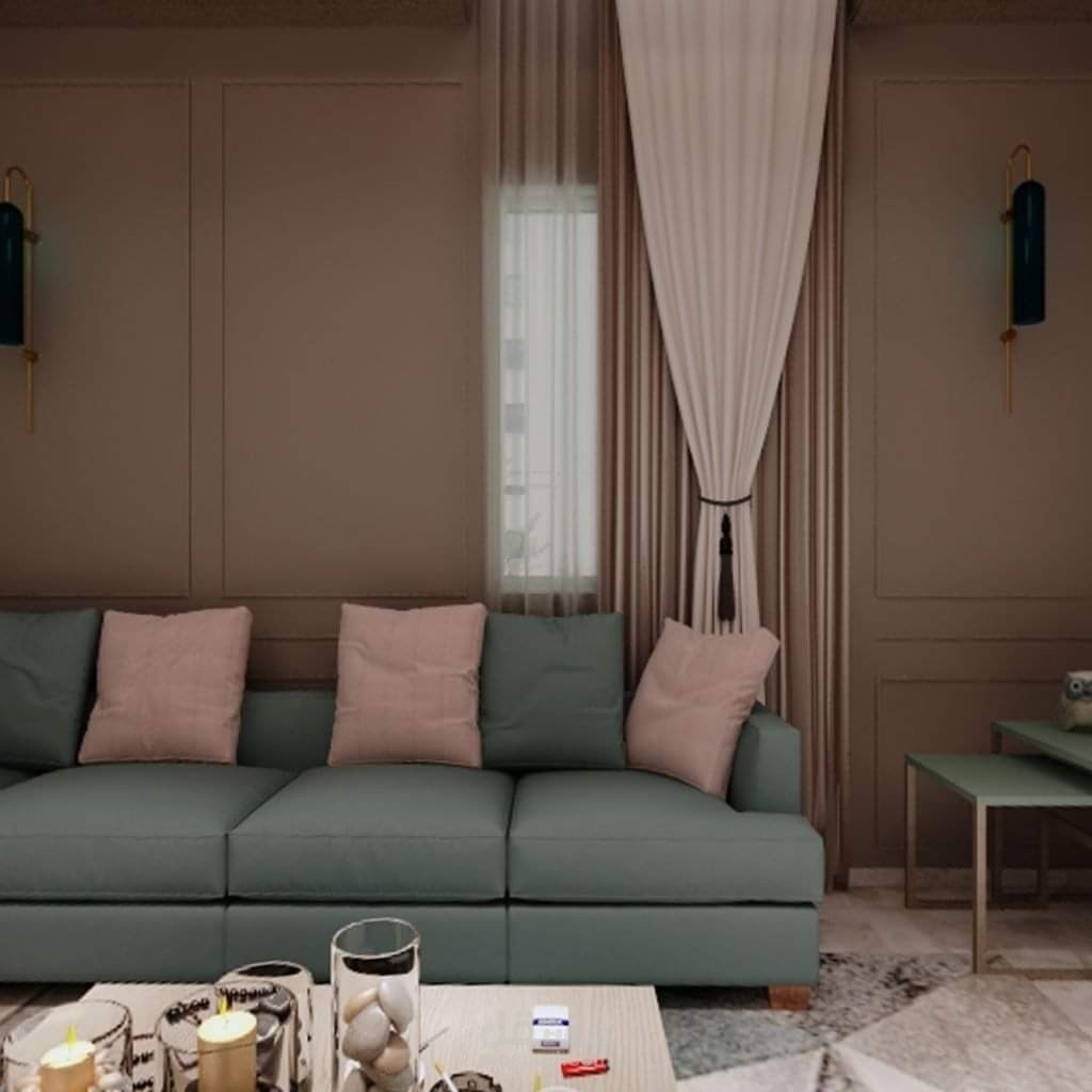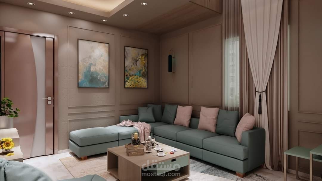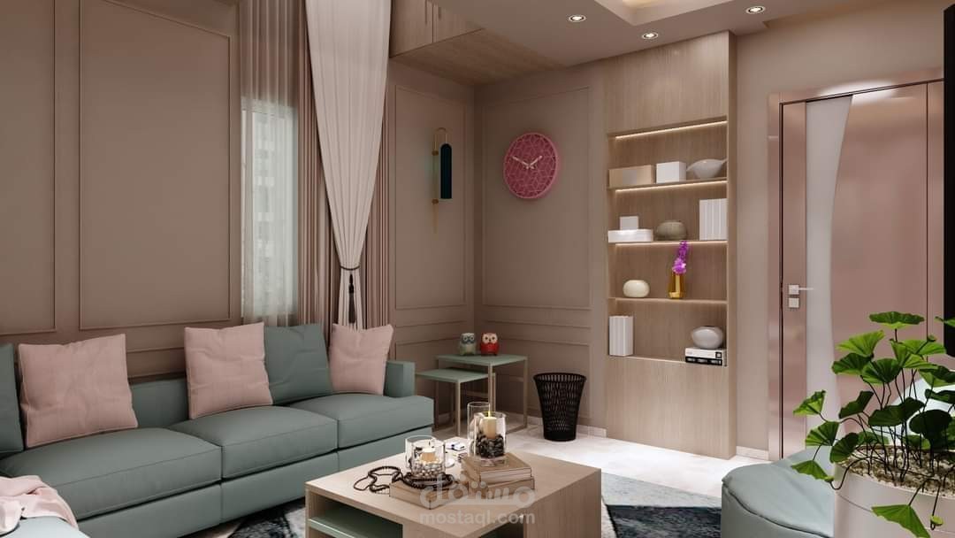 تصميم لغرفة معيشه مناسب تمام للراحه و الوان هادئة لراحة العين تصميم مودرن بسيط مع الاستفادة من المكان بشكل مثالى و اضافة سندرة في السقف لفحظ الالعاب و المقتنيات المختلفه