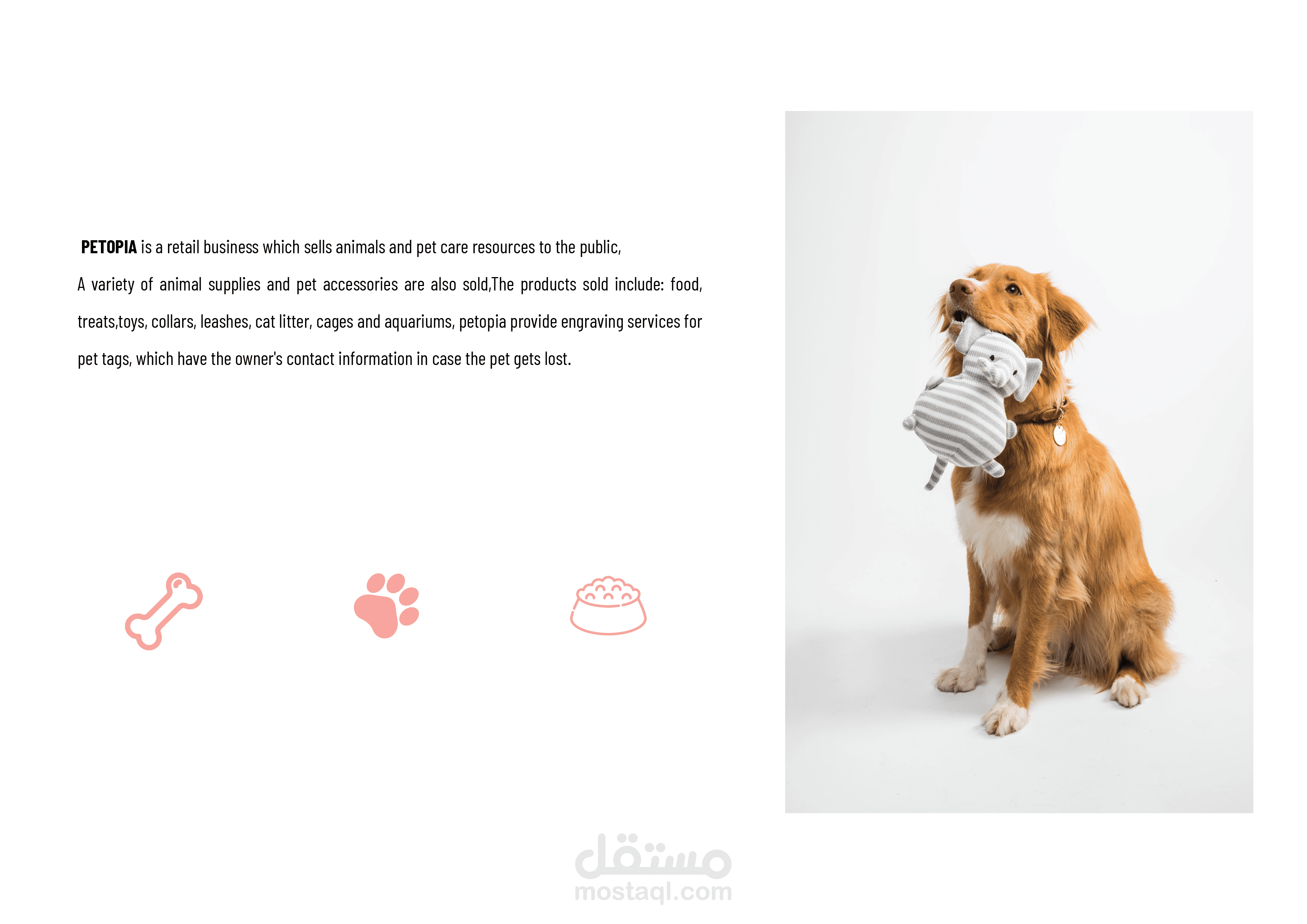 A variety of animal supplies and pet accessories are also sold,The products sold include: food, treats,toys, collars, leashes, cat litter, cages and aquariums, petopia provide engraving services for pet tags, which have the owner's contact information in case the pet gets lost.