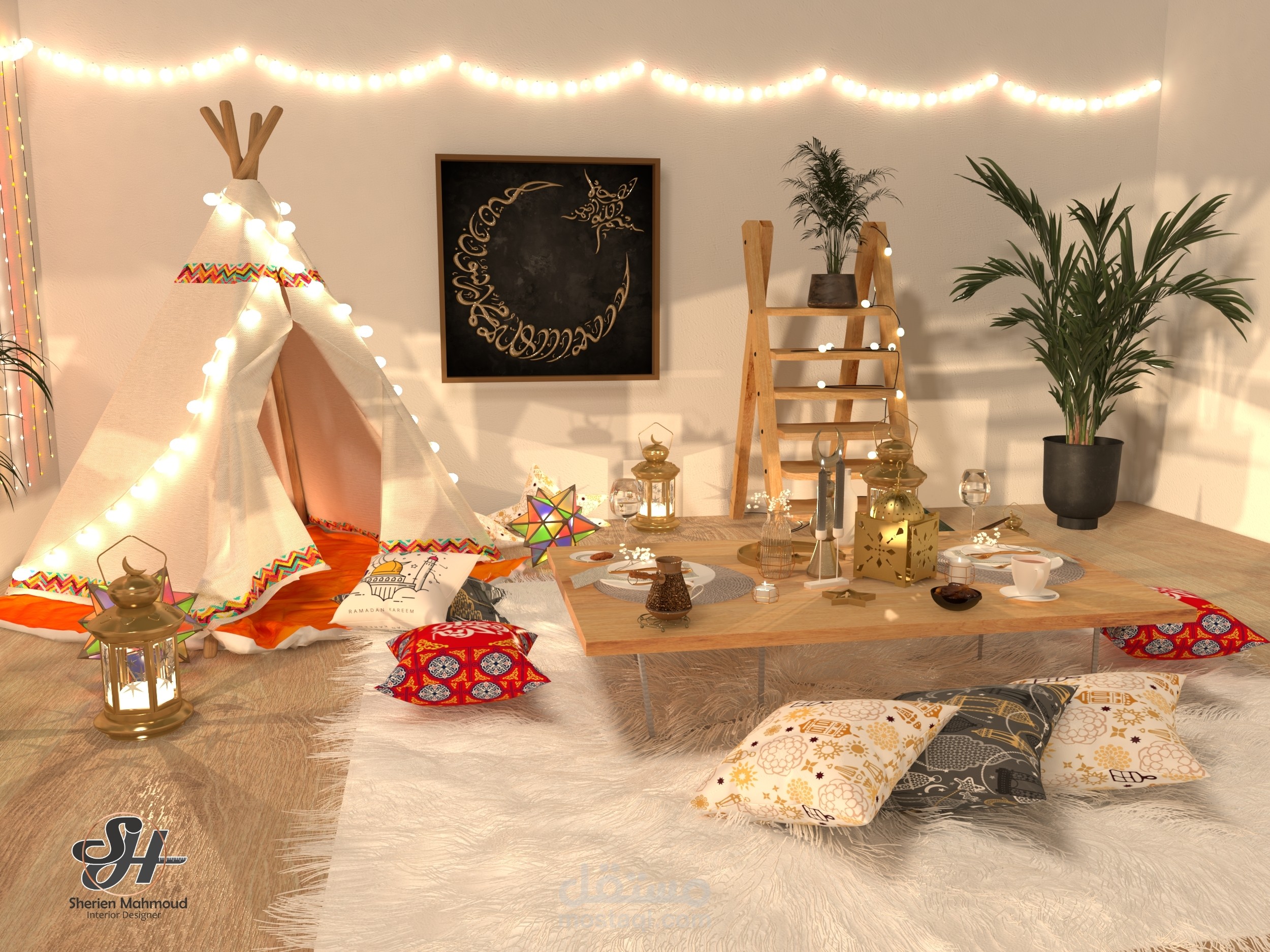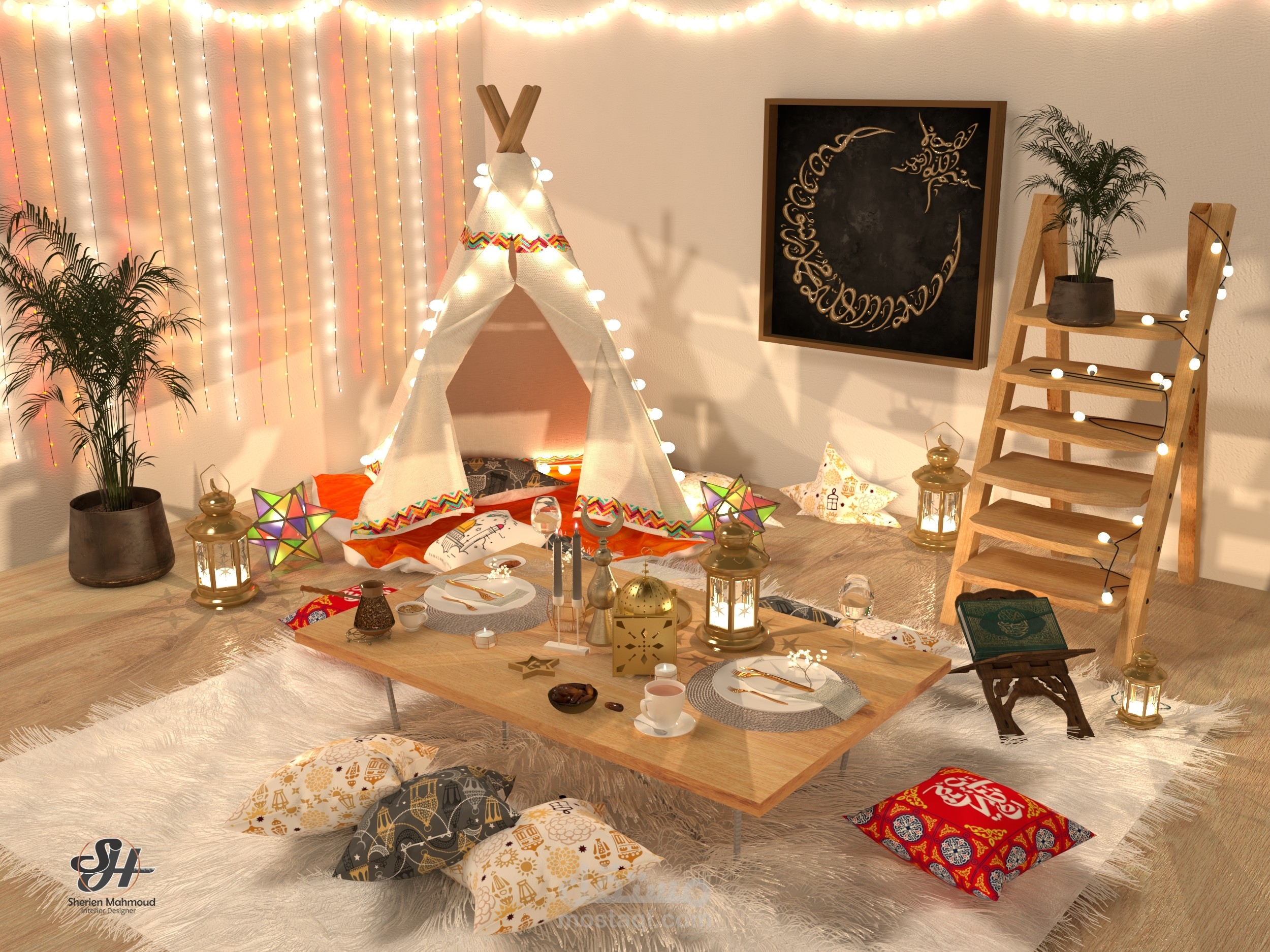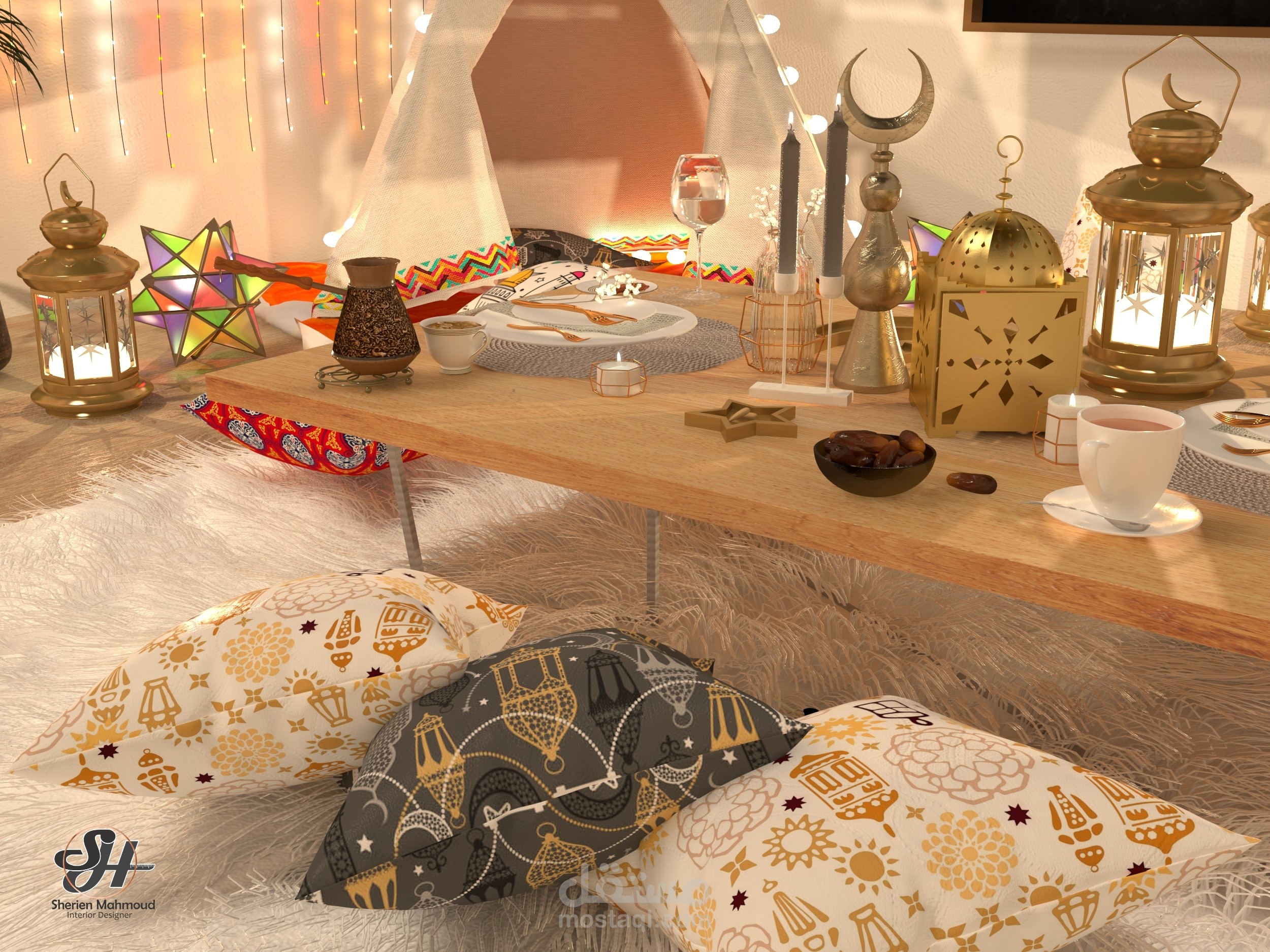 Designing a corner for gathering and having suhoor or iftar. Spending a cozy night in surrounding vibes of Ramadan and prayers.