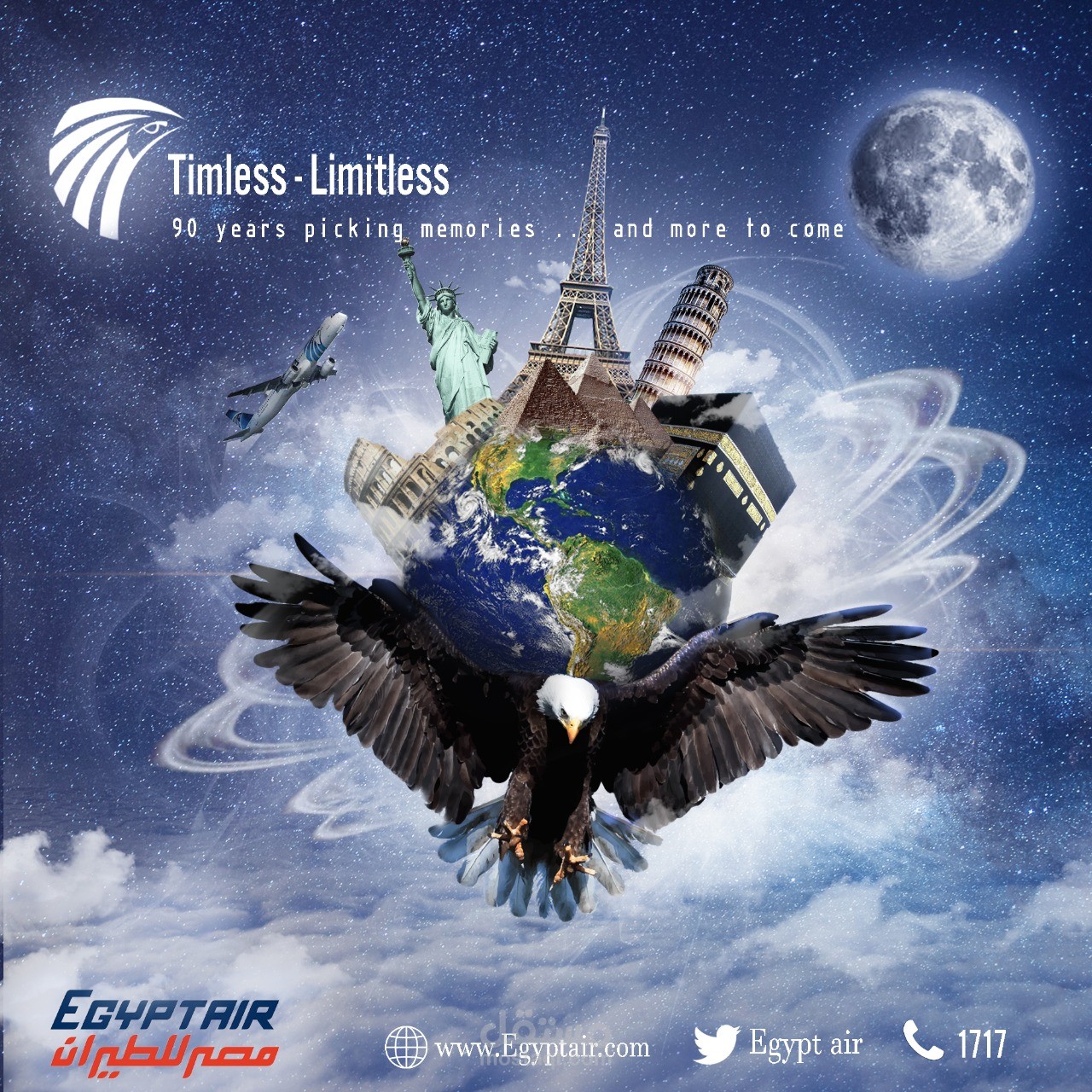تم عمل هذا المشروع كتصور لاعلان لشركة مصر للطيران حيث ان النسر يعبر فيها عن هويه الشركة وهو يحمل كوكب الارض كأنه يتجول فيها حيث يشاء وعليه اكثر الاثار شهره في العالم وبين تعديل الالوان والاضاءات ليظهر البوستر الاعلاني كوحدك واحده ولون التصميم ازرق ليعبر عن الهوية البصرية للشركة