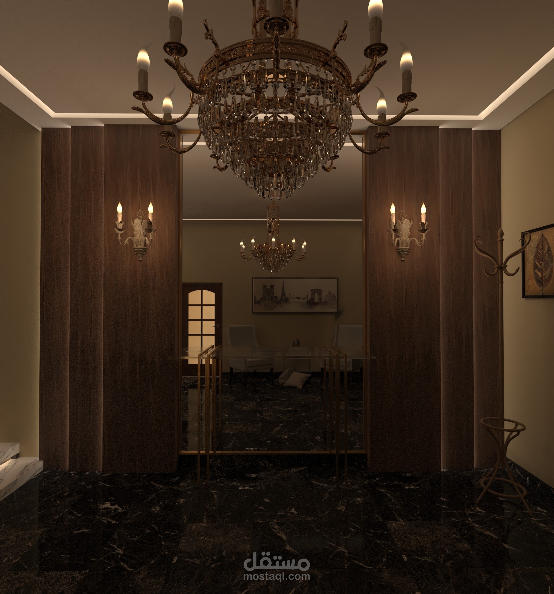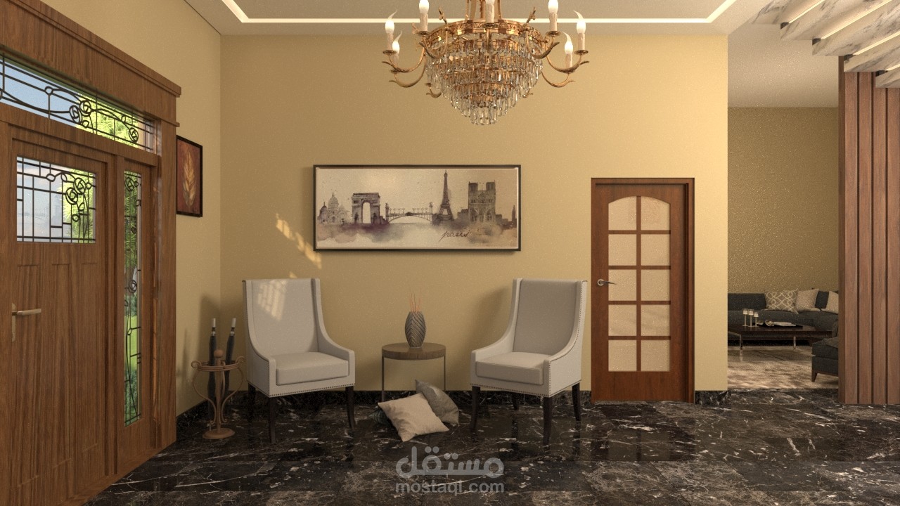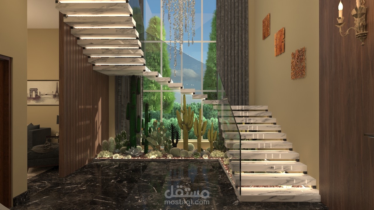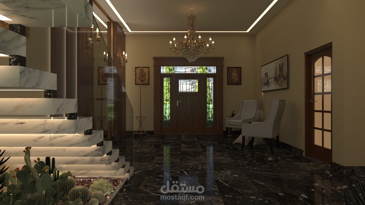 مدخل الفيلا بالاضافة للدرج الرئيسي بتصميم مودرن ومواد مناسبة للتصميم