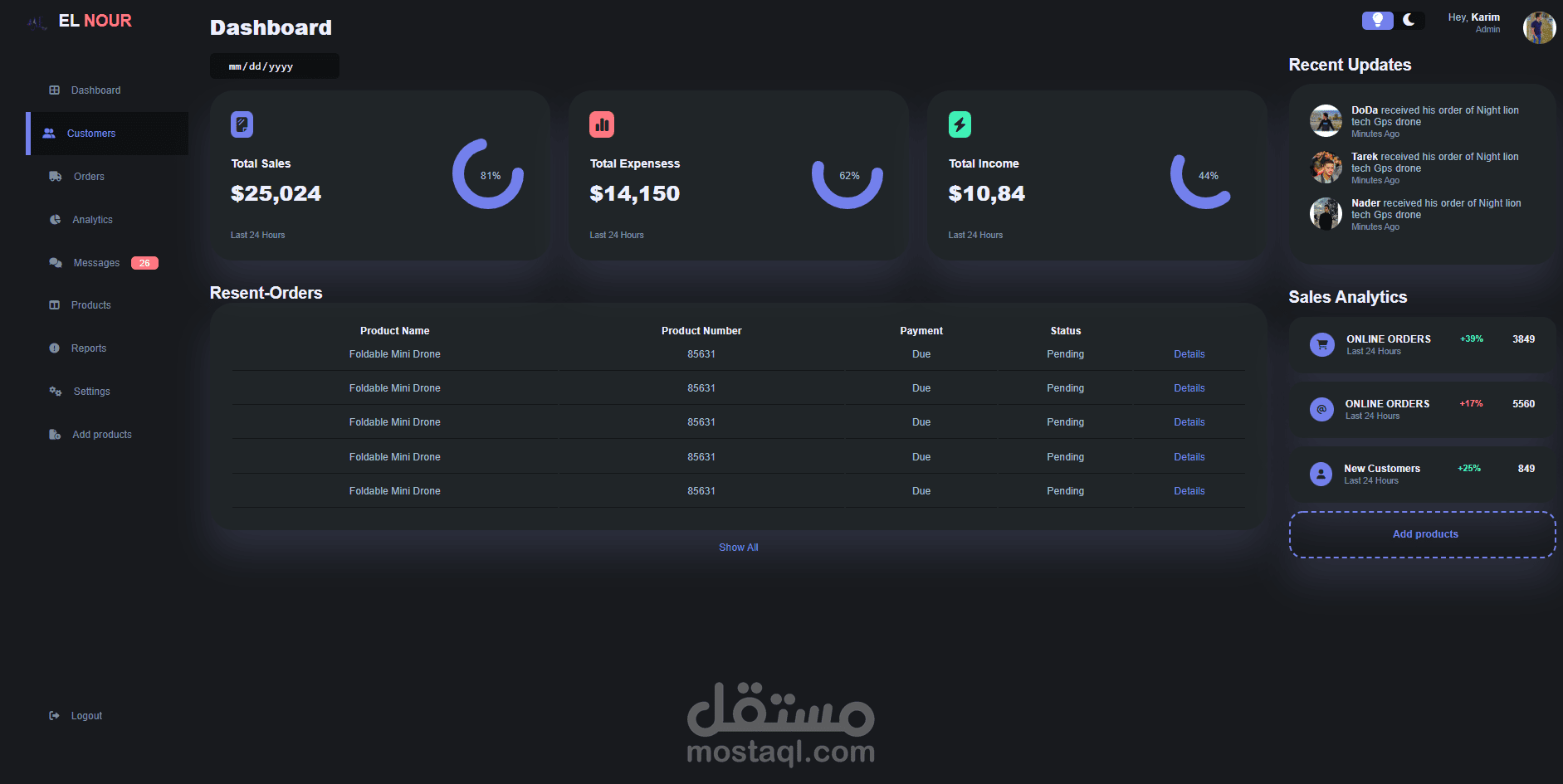 صفحه dashboard الي المستخدم مصممه بطريقه حديثه مع وجود خاصيه ال dark-mood الصفحه متجاوبه مع جميع الشاشات