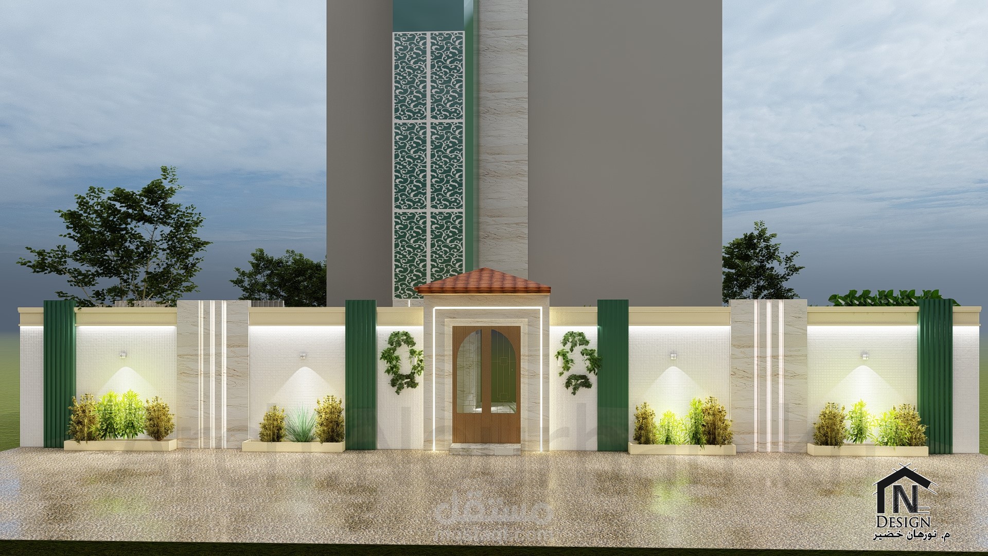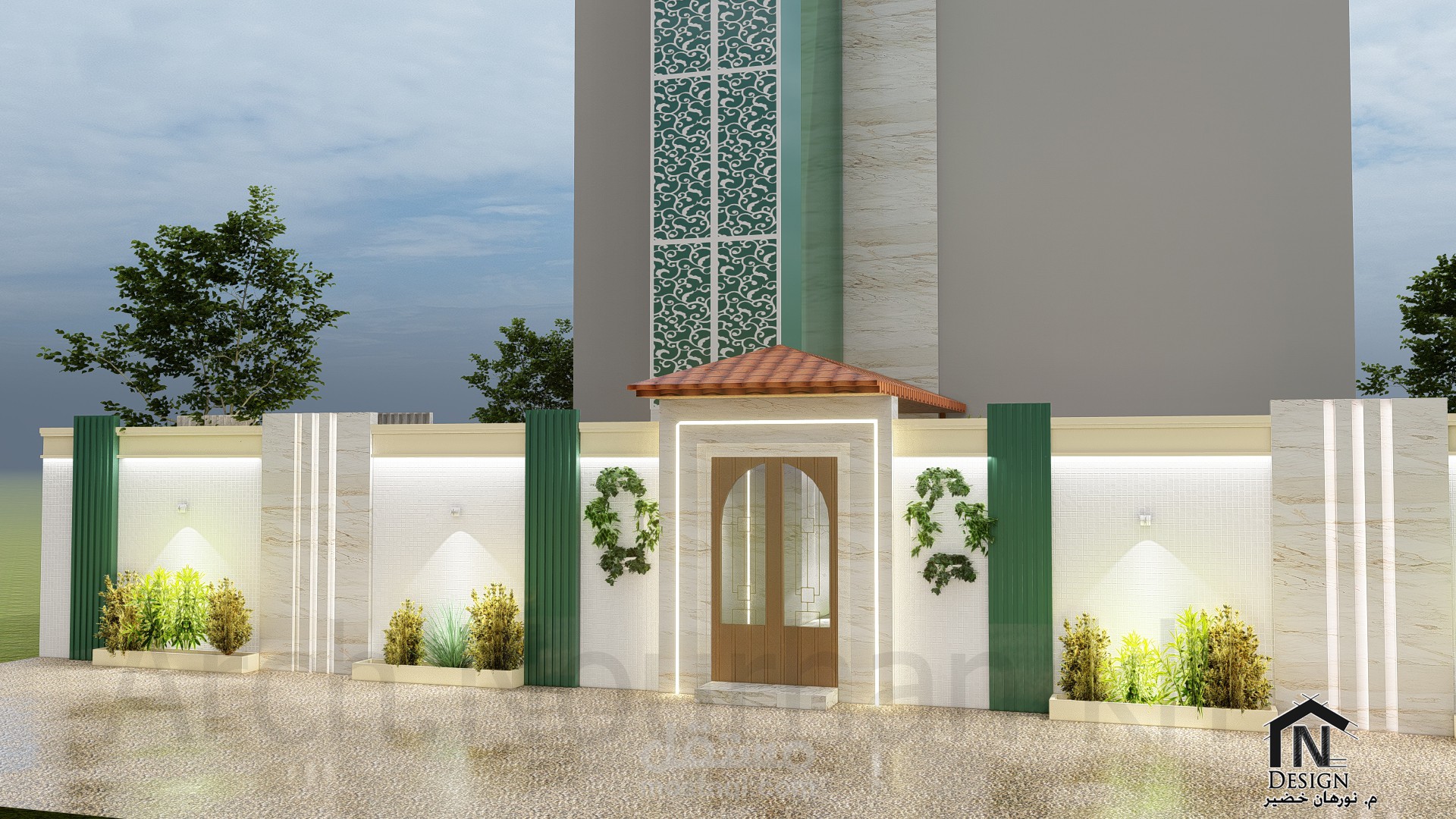 تصميم خارجي لسور عمارة ذات الخمس طوابق حيث يبلغ طول السور 25 مترا وتم تصميمه على الطابع الحديث واستخدام مواد ذات الملمس الناعم والالوان الفاتحة.