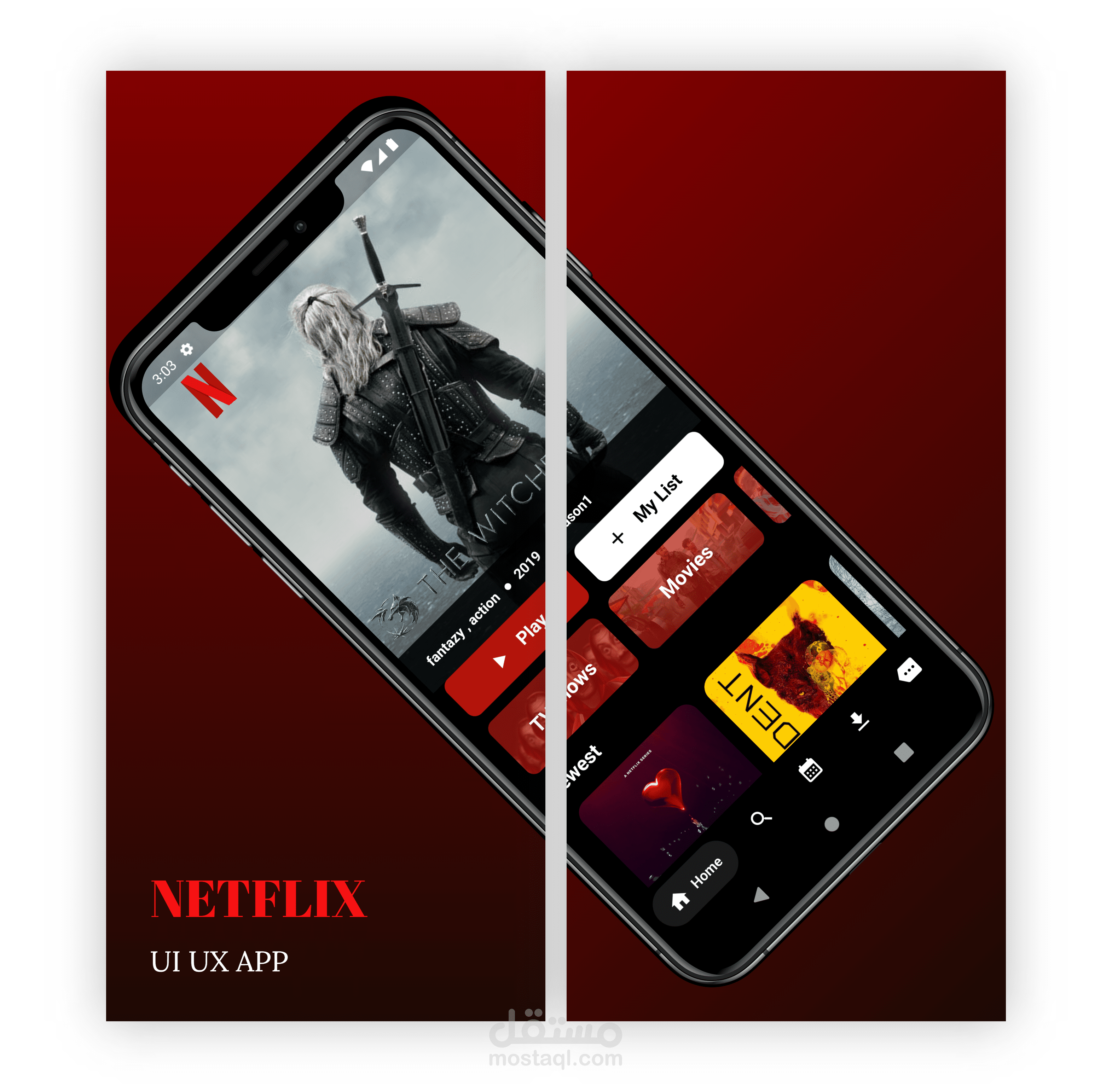 من هواياتي تصميم واجهات بمواصفات مشابهة للتطبيقات العالمية و هذه احدى واجهات تطبيق للافلام شبيه ب NETFLIX