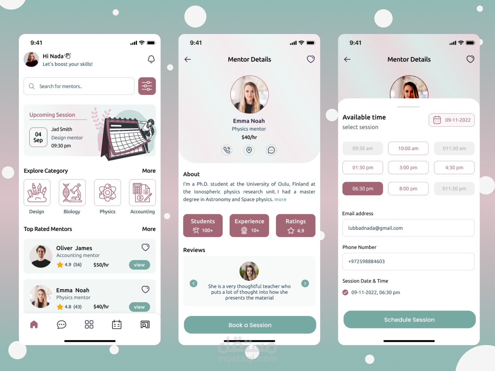 أعرض هنا تصميم لبعض شاشات تطبيق منتور، وهو تطبيق لتشبيك مقدم الخدمات التعليمية مع الباحث عن هذه الخدمات ويرغب بتطوير مهاراته