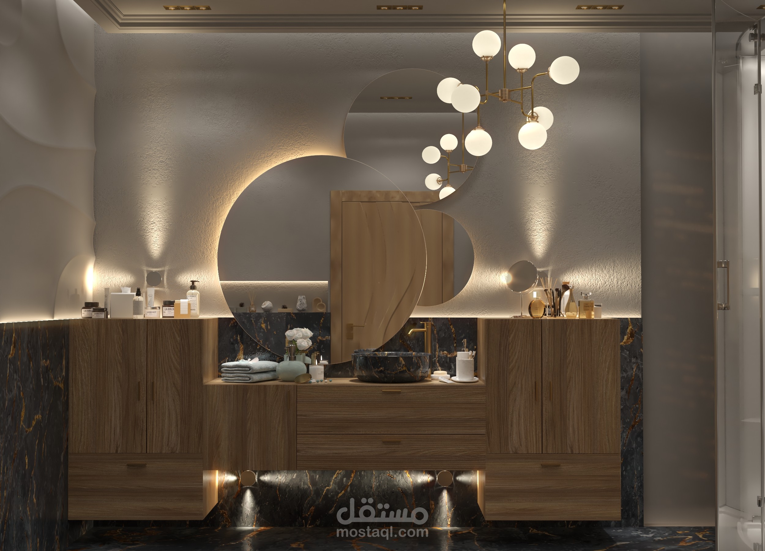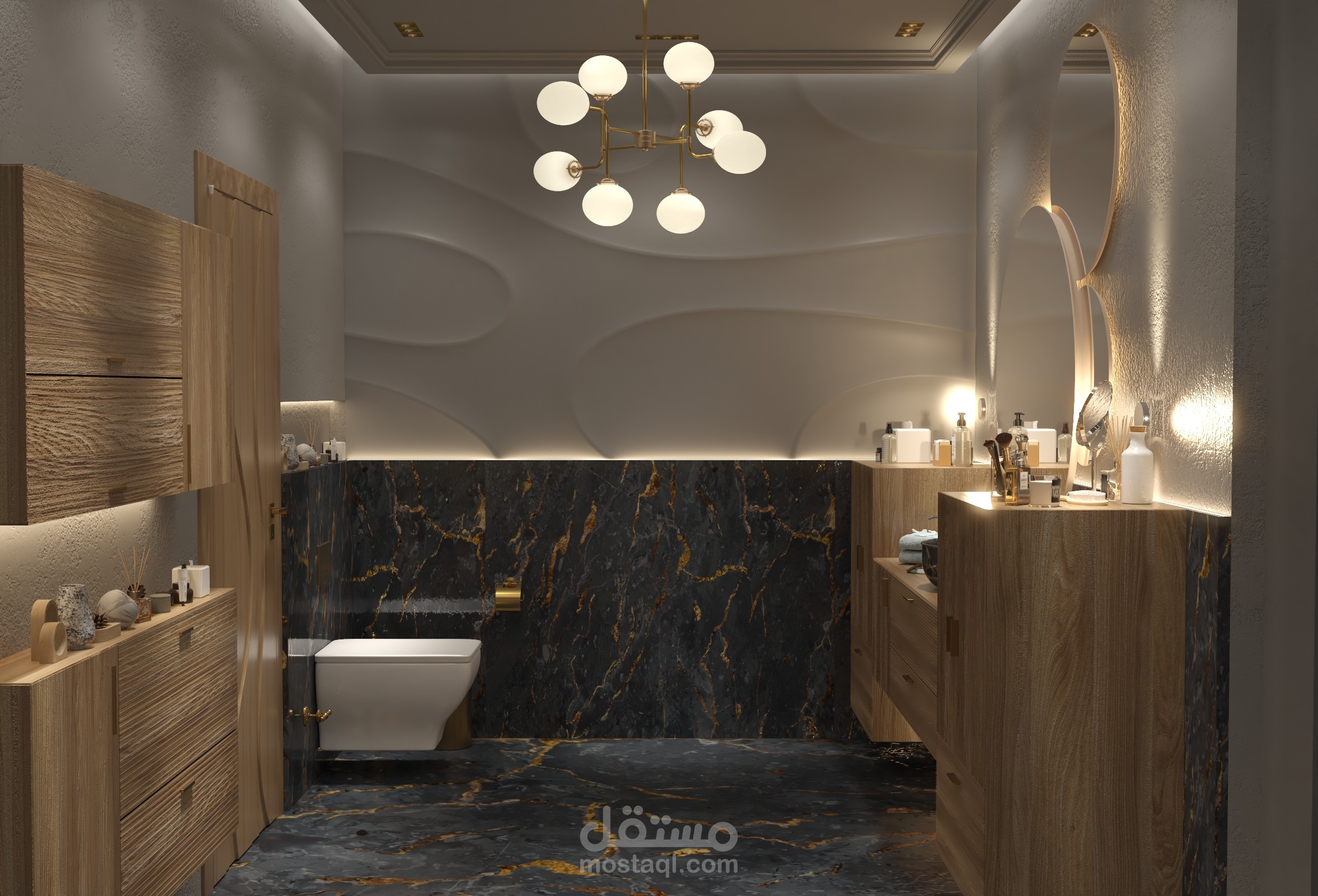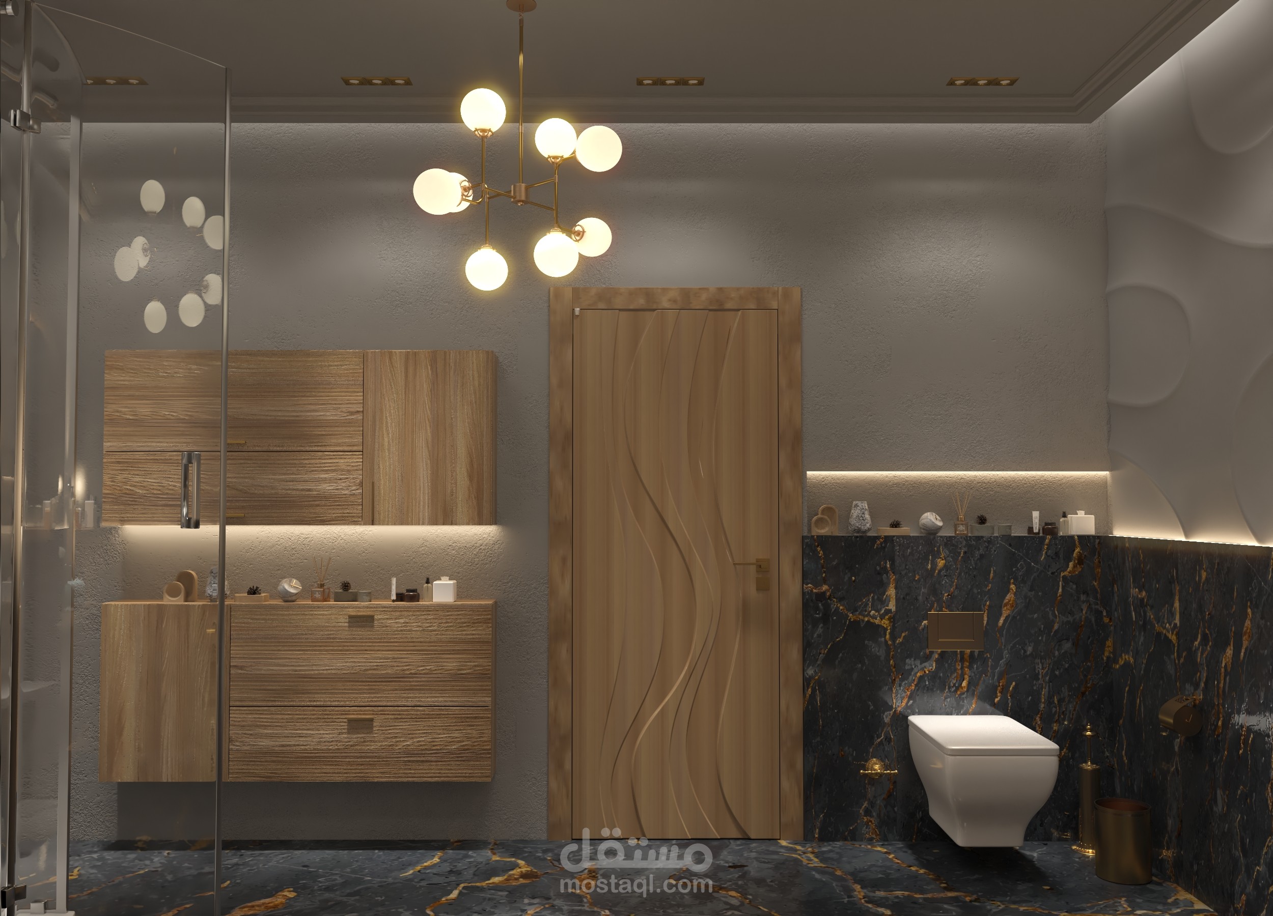 تصميم تخيلي معاصر وبسيط. دقيق وبمقاسات تفصيلية عن غرفة حمام واسعة في مجمع مرتفع