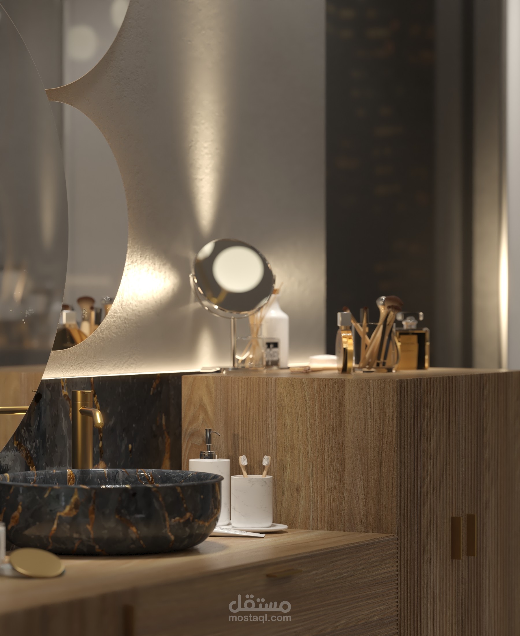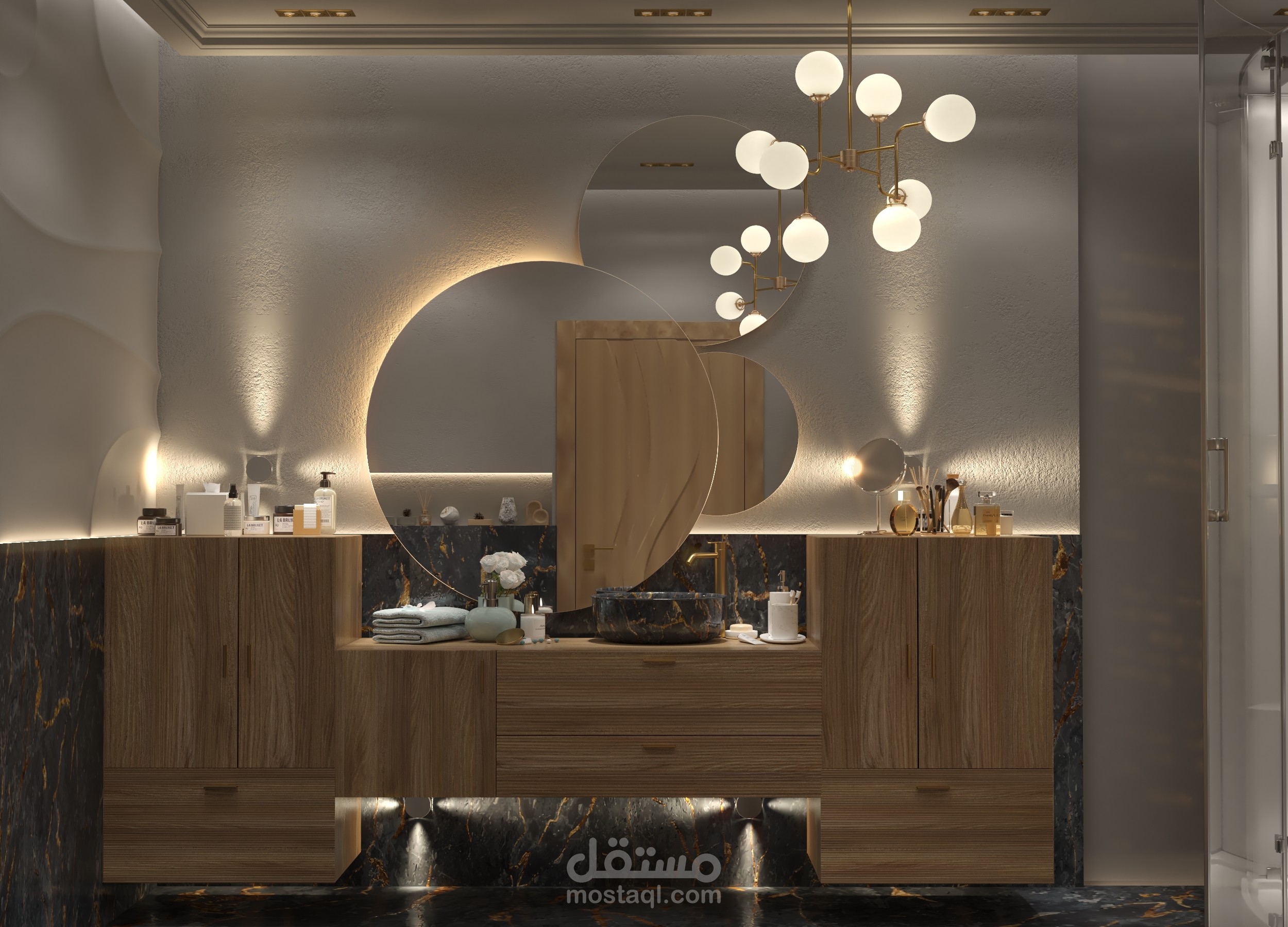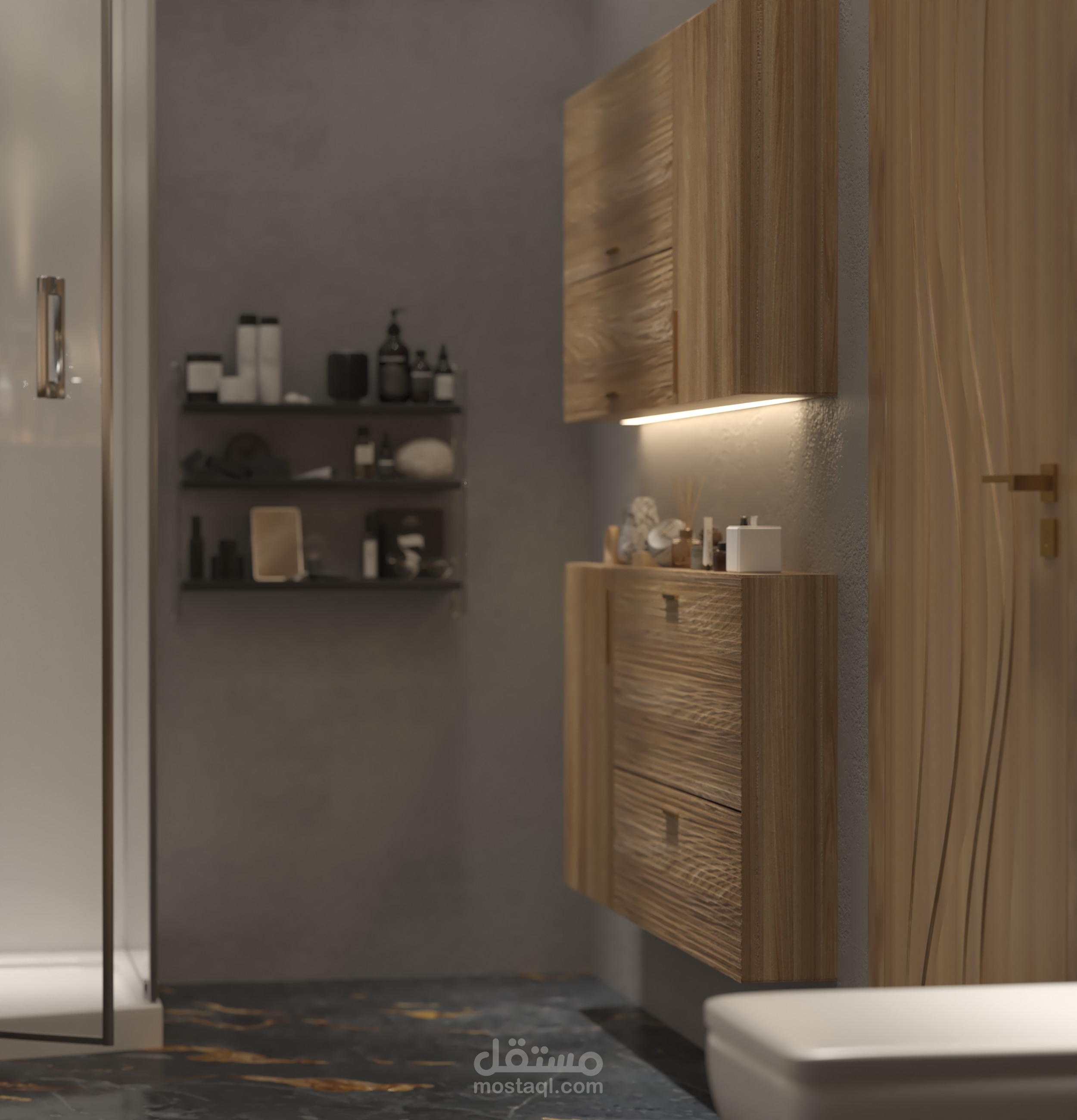 تصميم تخيلي معاصر وبسيط. دقيق وبمقاسات تفصيلية عن غرفة حمام واسعة في مجمع مرتفع