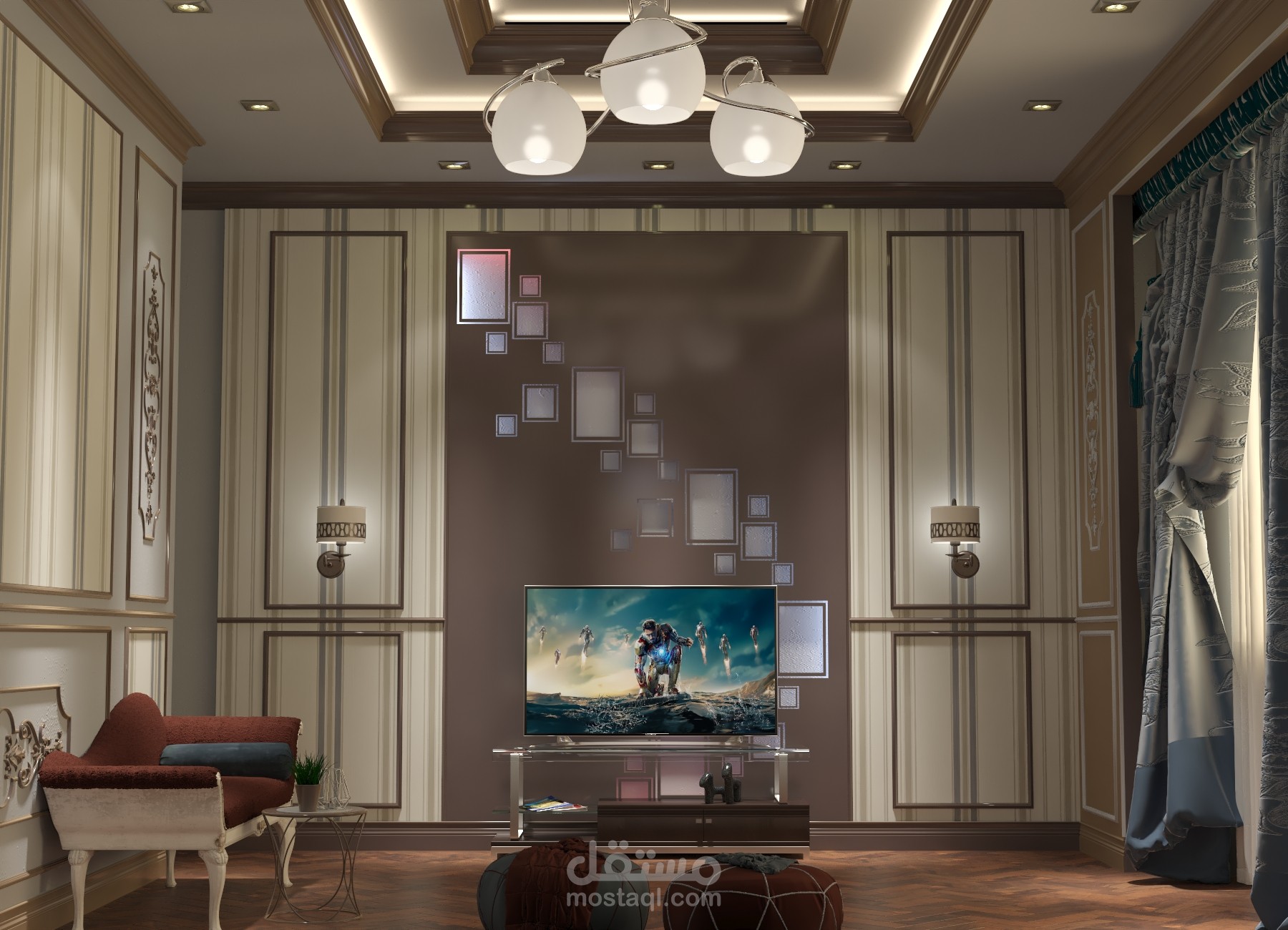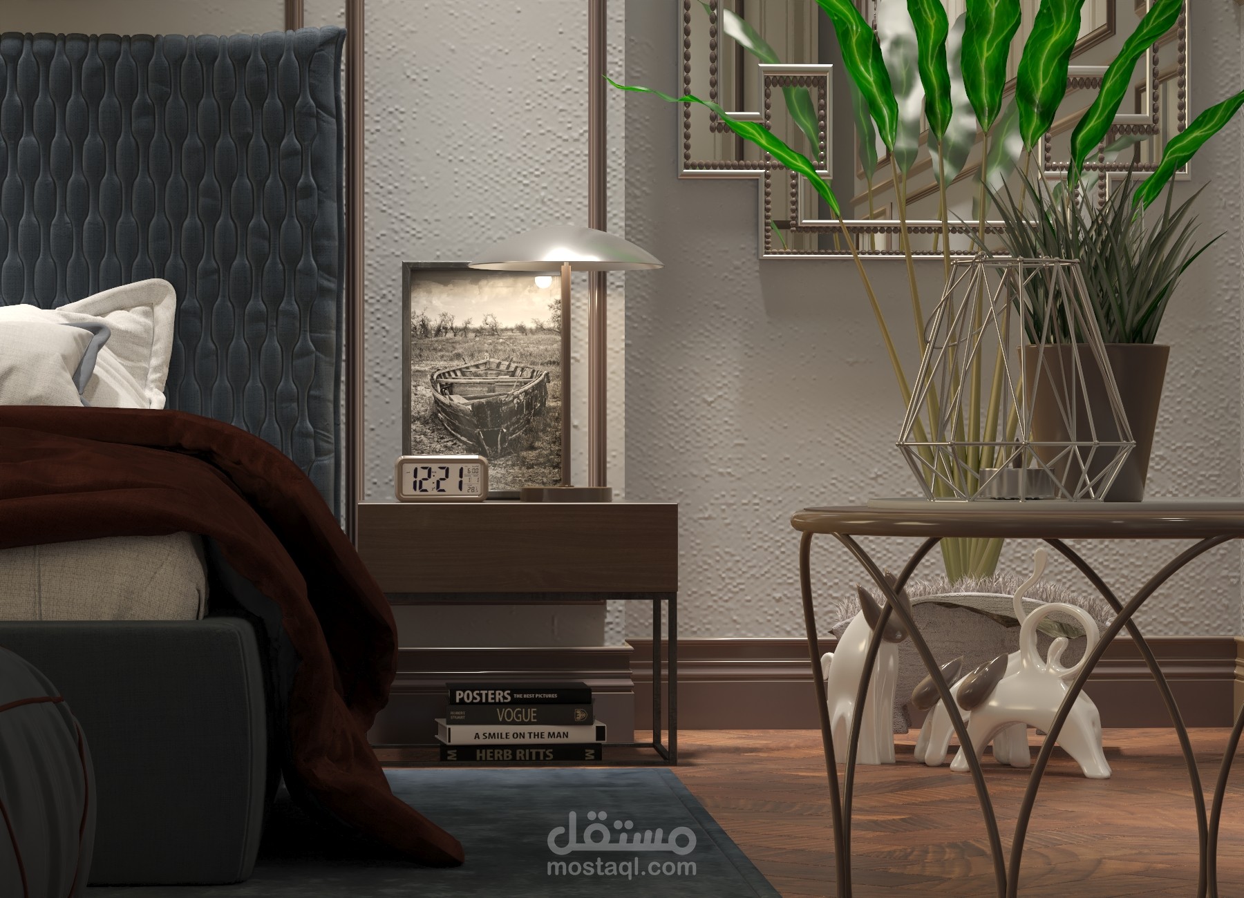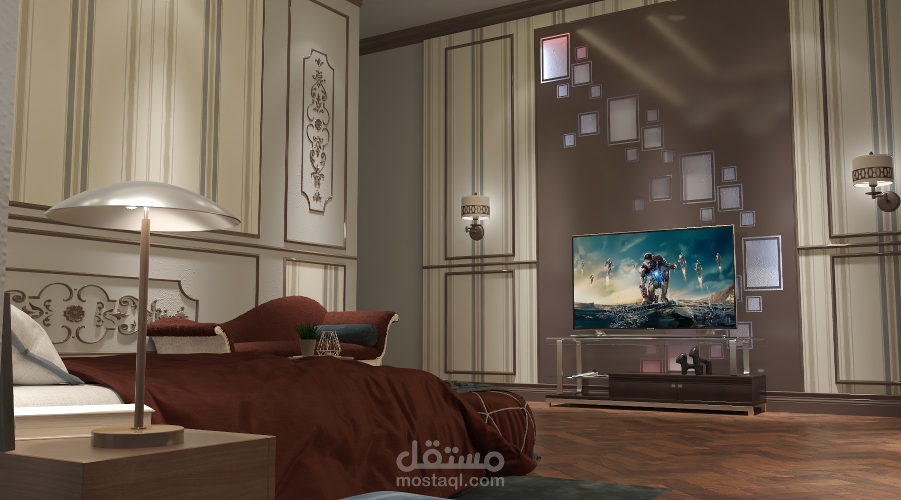 تصميم كلاسيكي معاصر لغرفة نوم ضمن مجمع سكني بتفاصيل بسيطة وجذابة وتفصيلية للتنفيذ الفوري.
