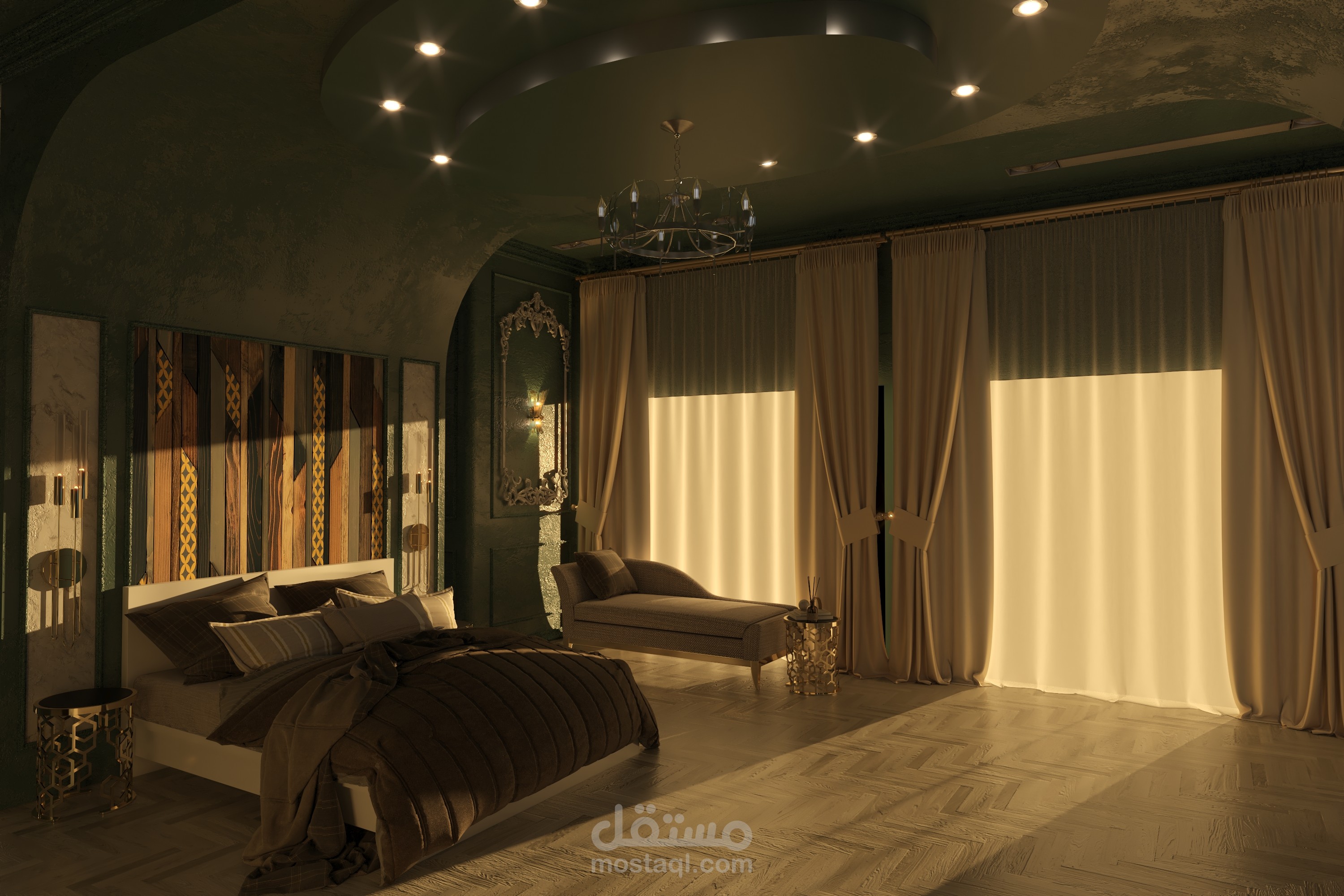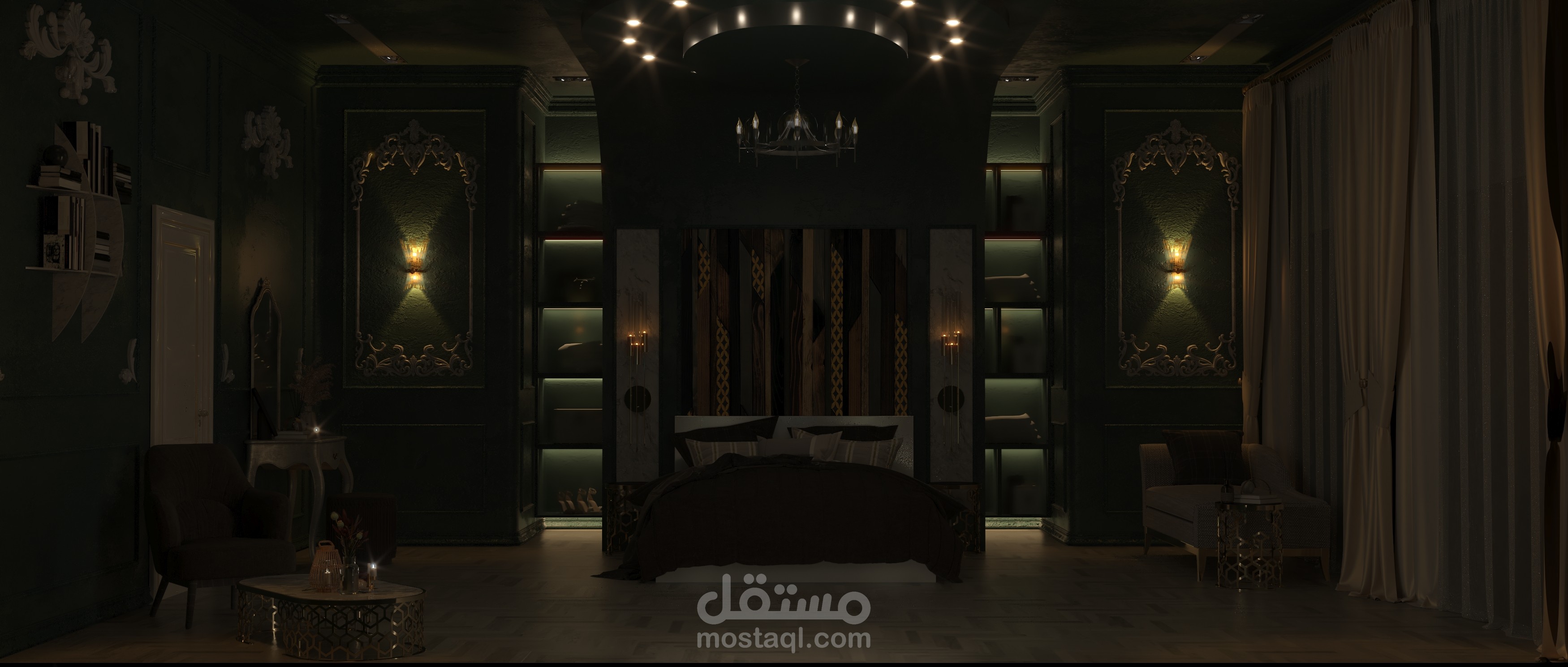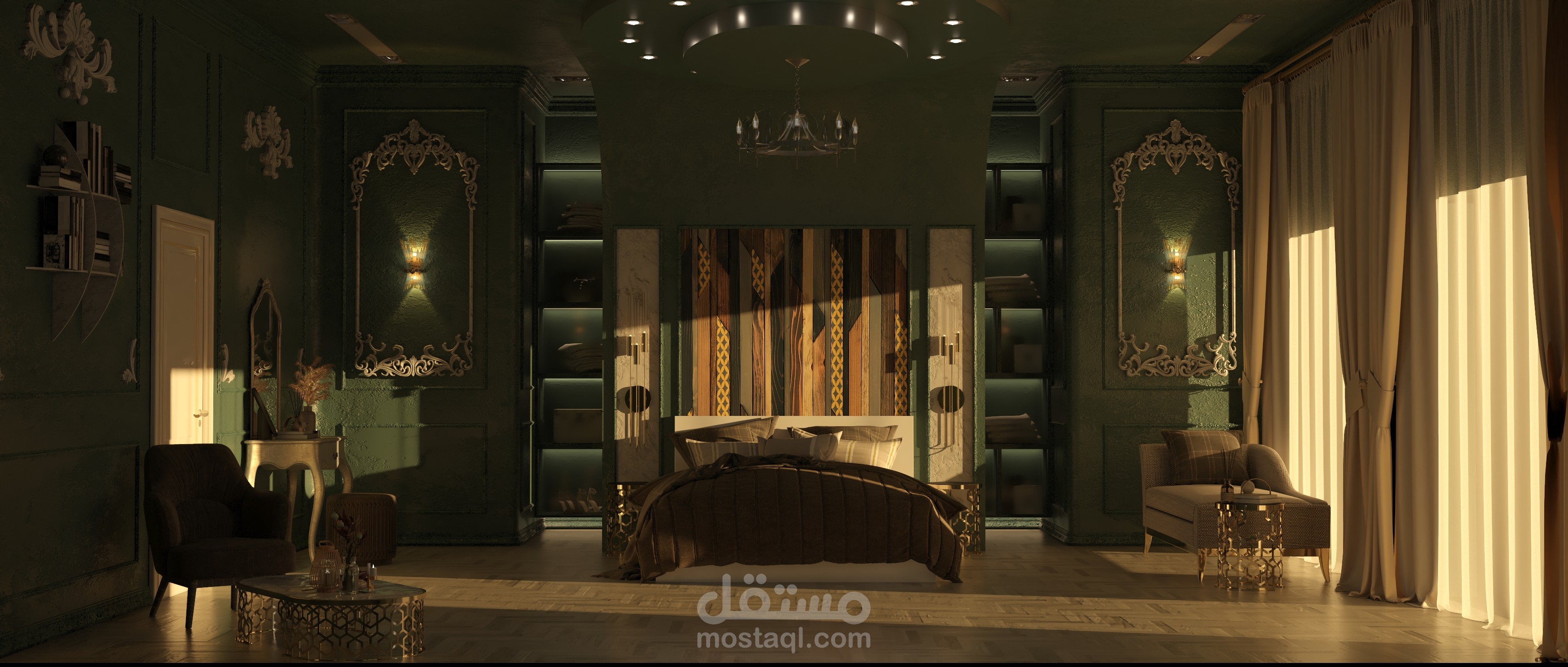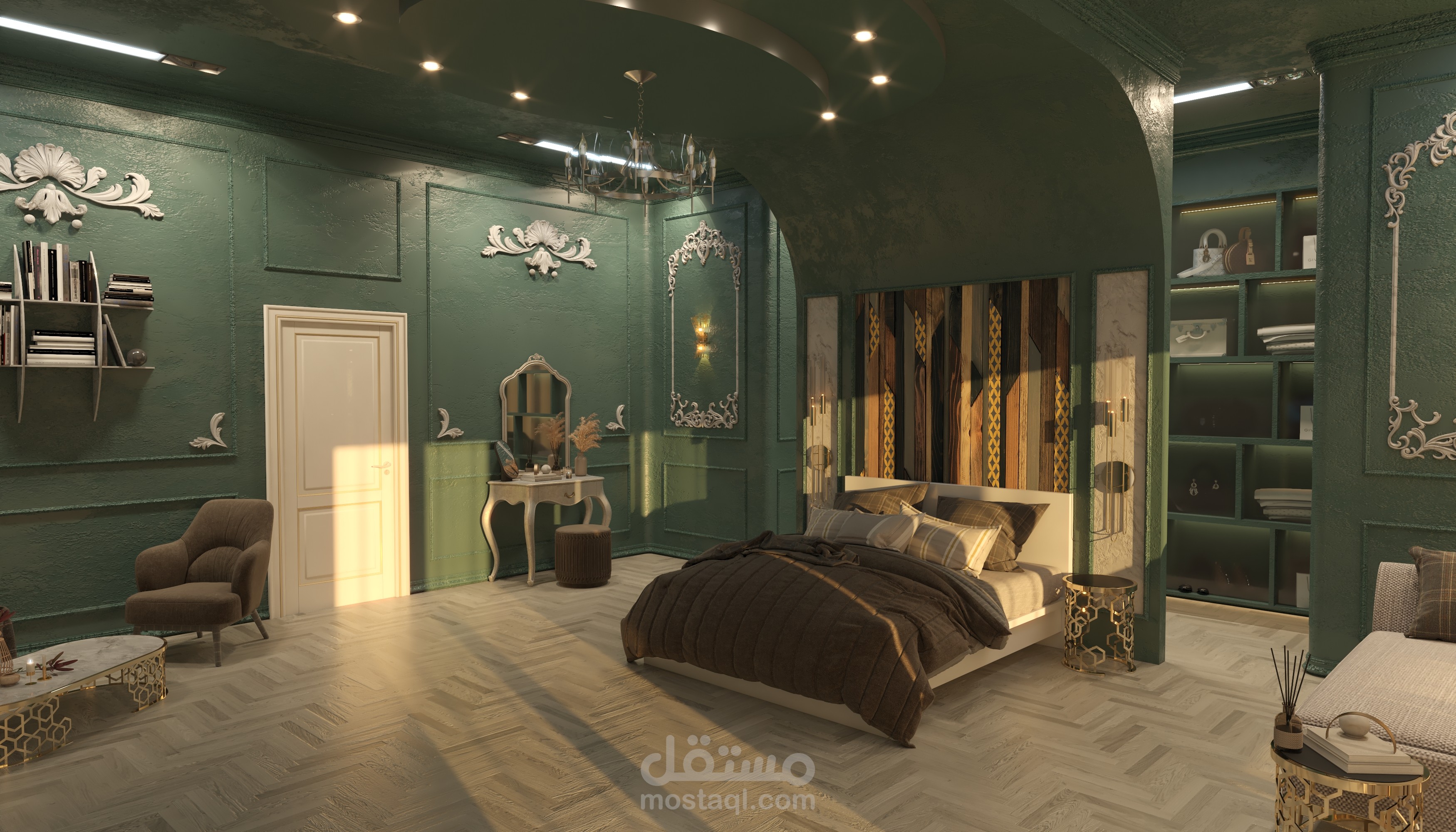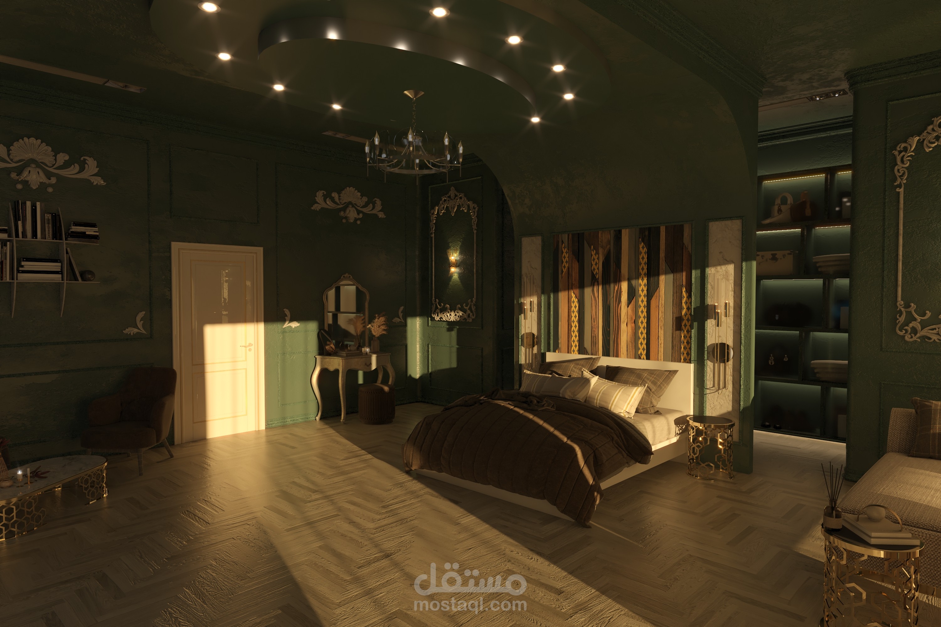 تصميم تخيلي ونموذج عن غرفة نوم ضمن فيلا بطراز كلاسيكي ومعاير حديثة كاملة التفاصيل الداخلية للتنفيذ.