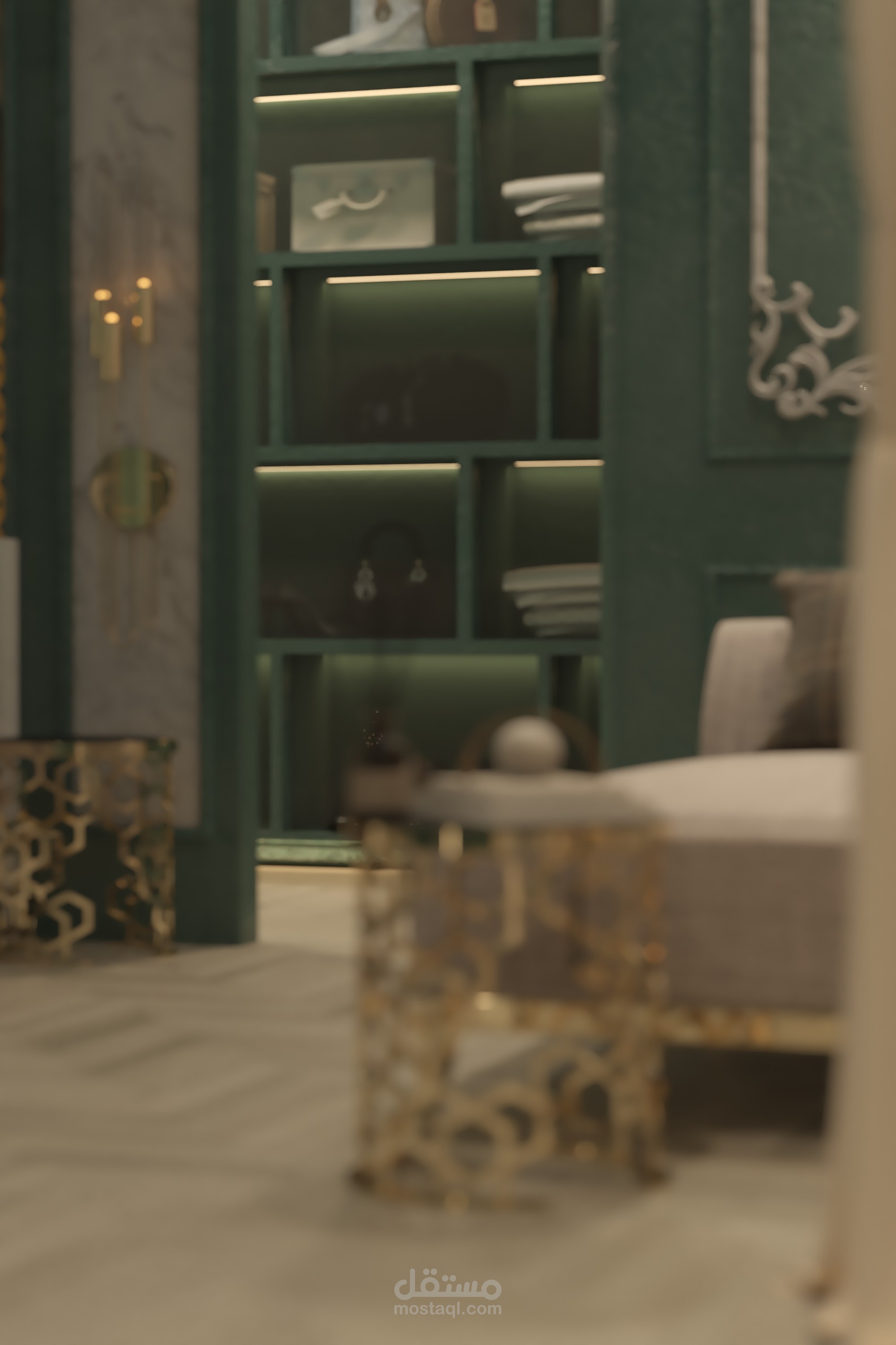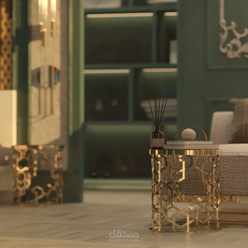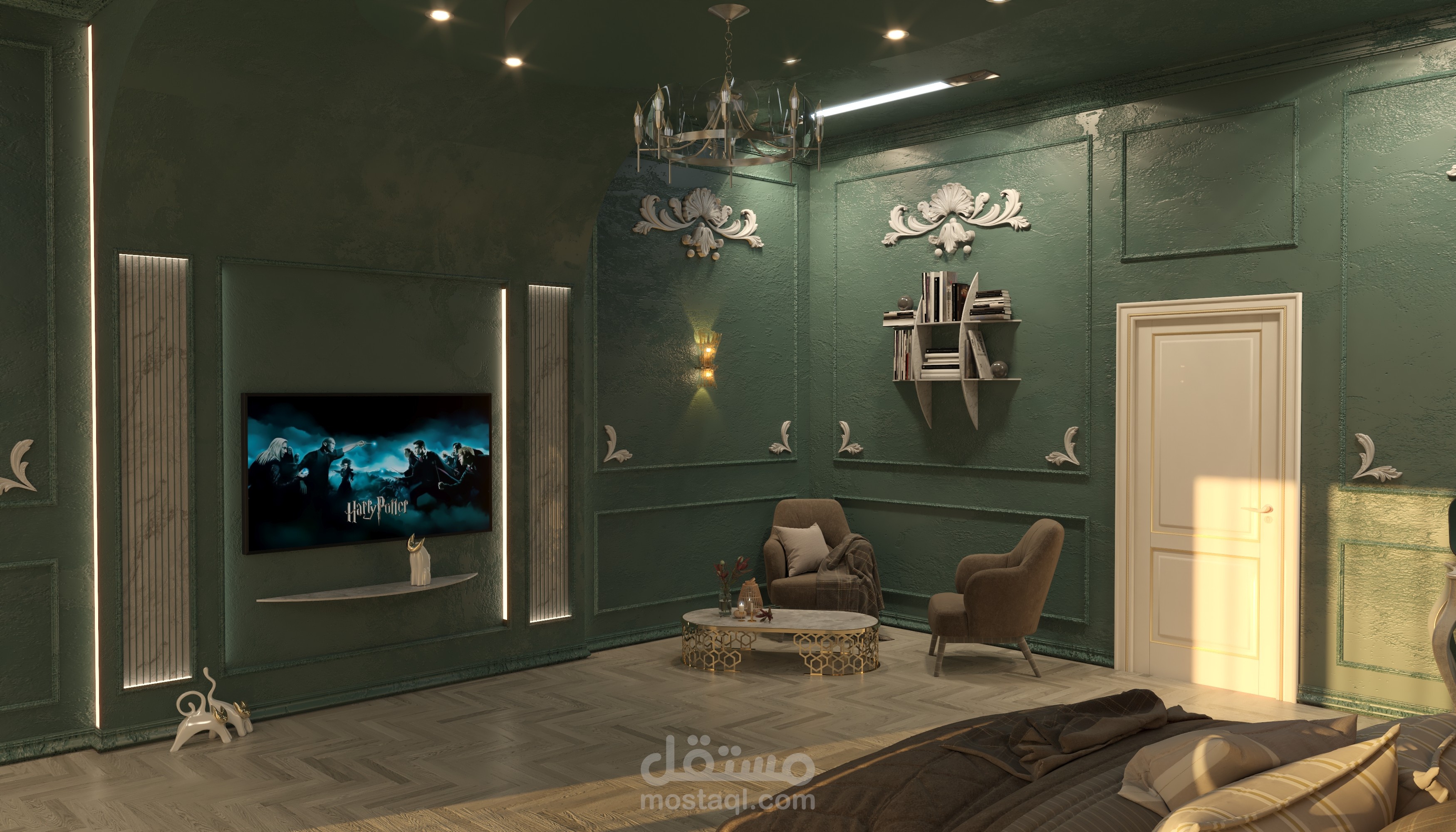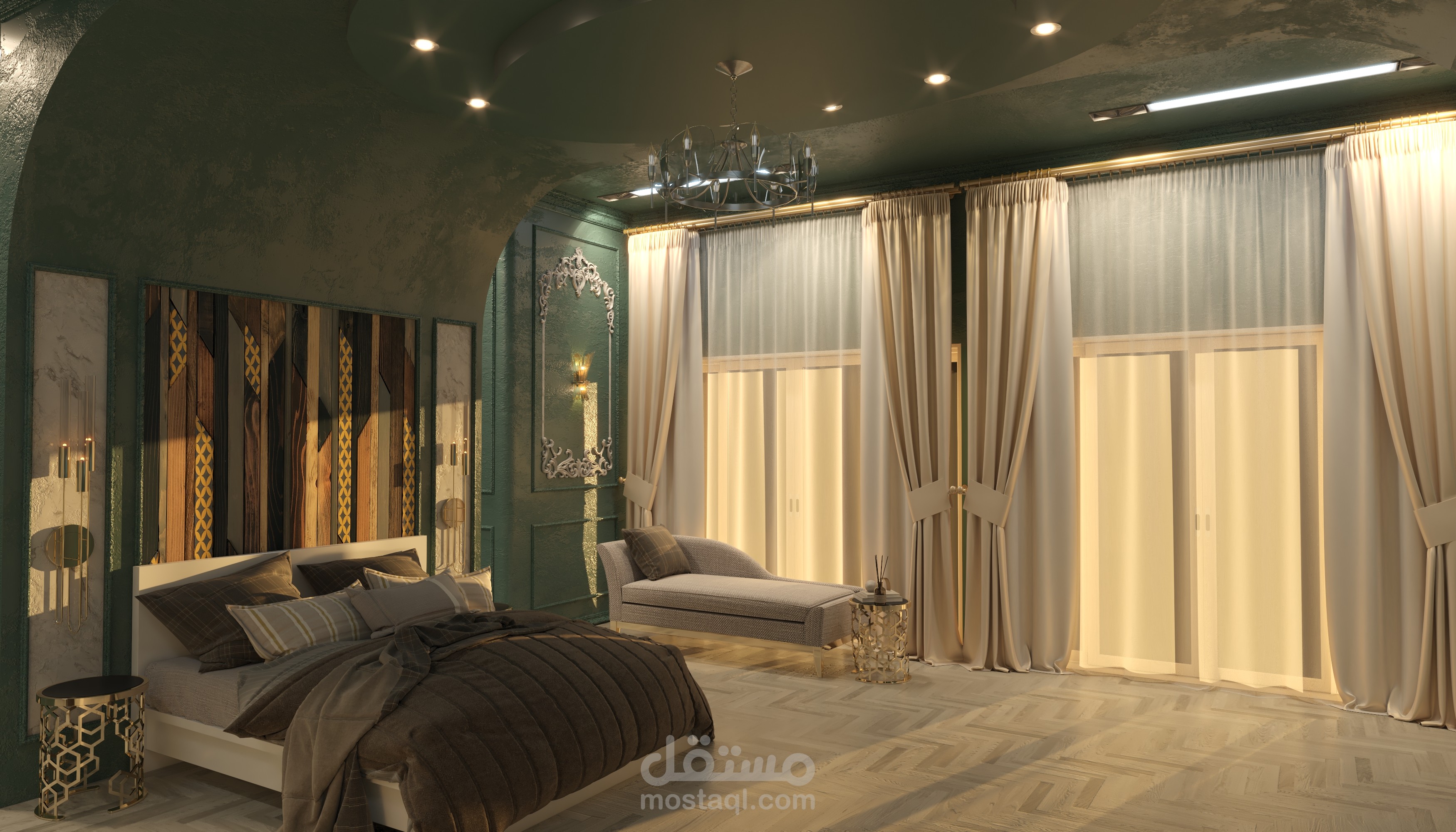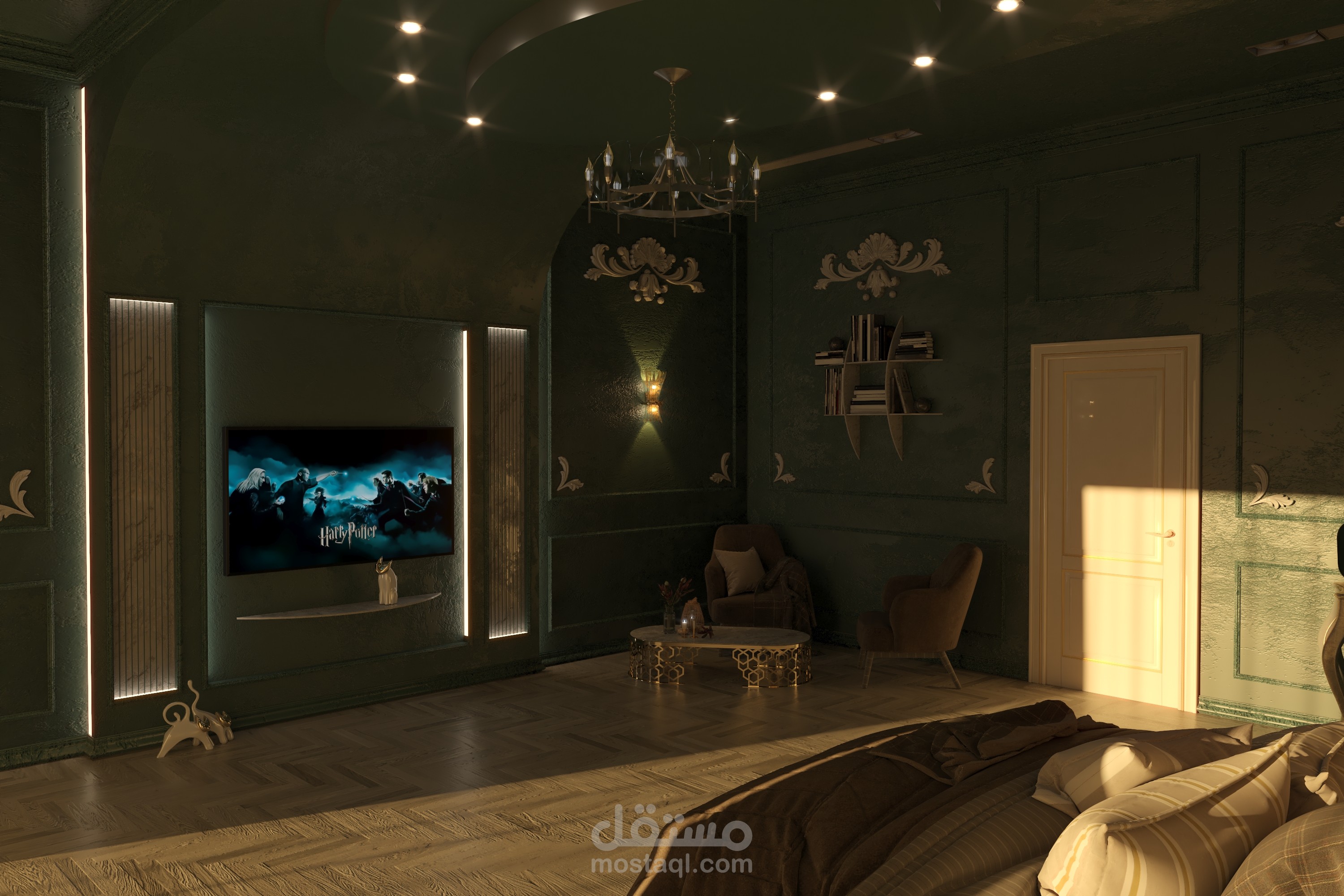 تصميم تخيلي ونموذج عن غرفة نوم ضمن فيلا بطراز كلاسيكي ومعاير حديثة كاملة التفاصيل الداخلية للتنفيذ.