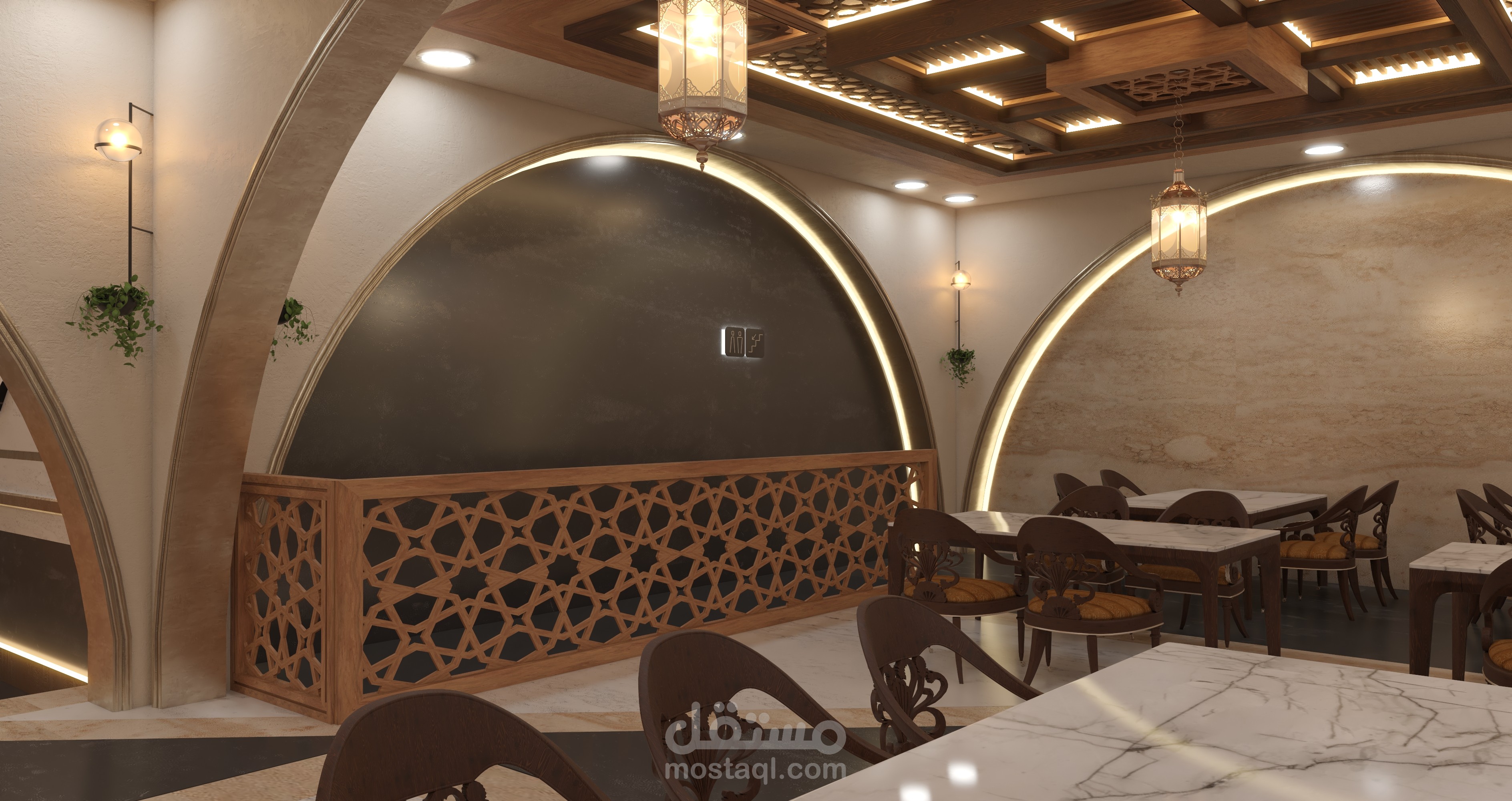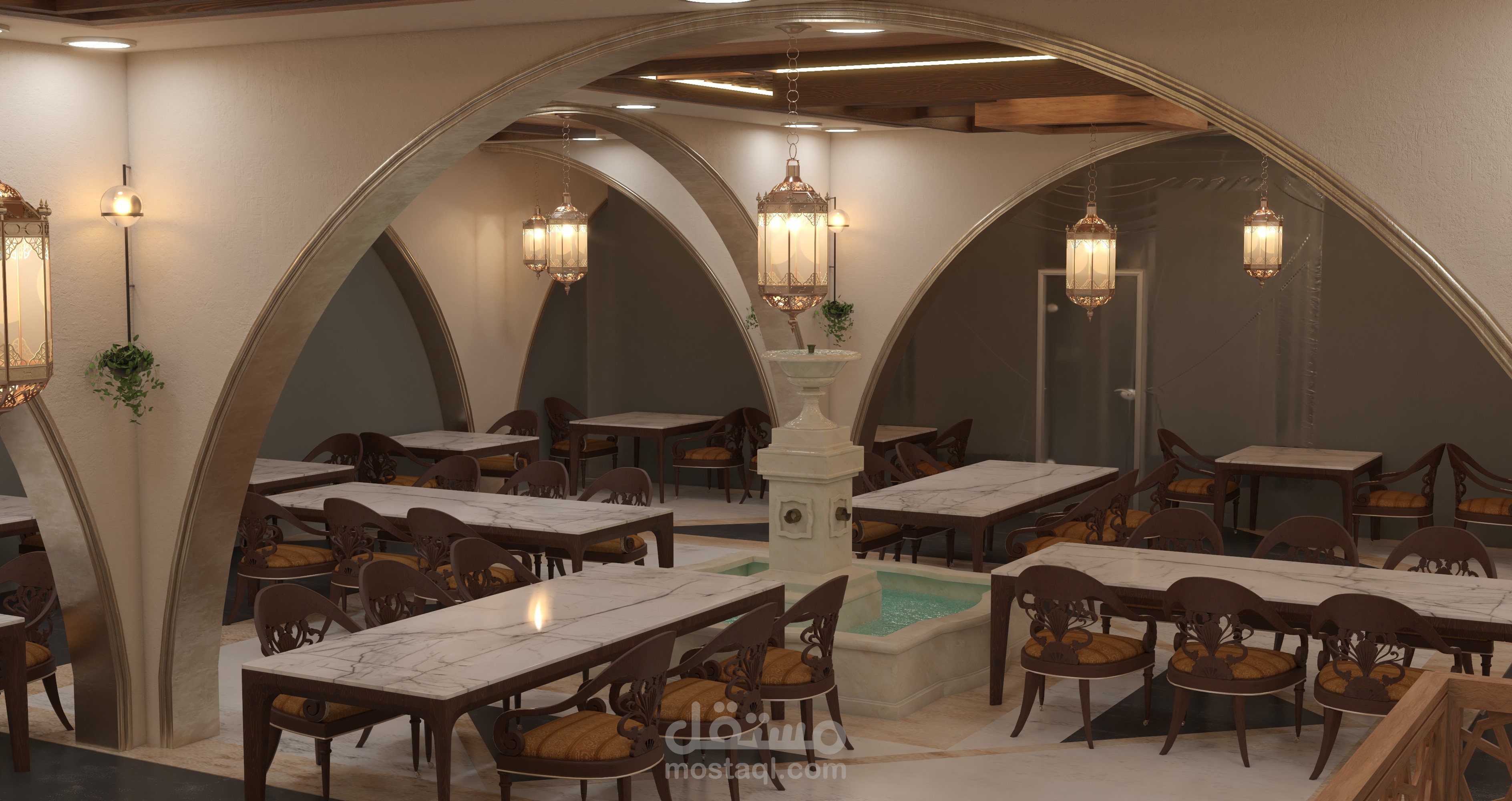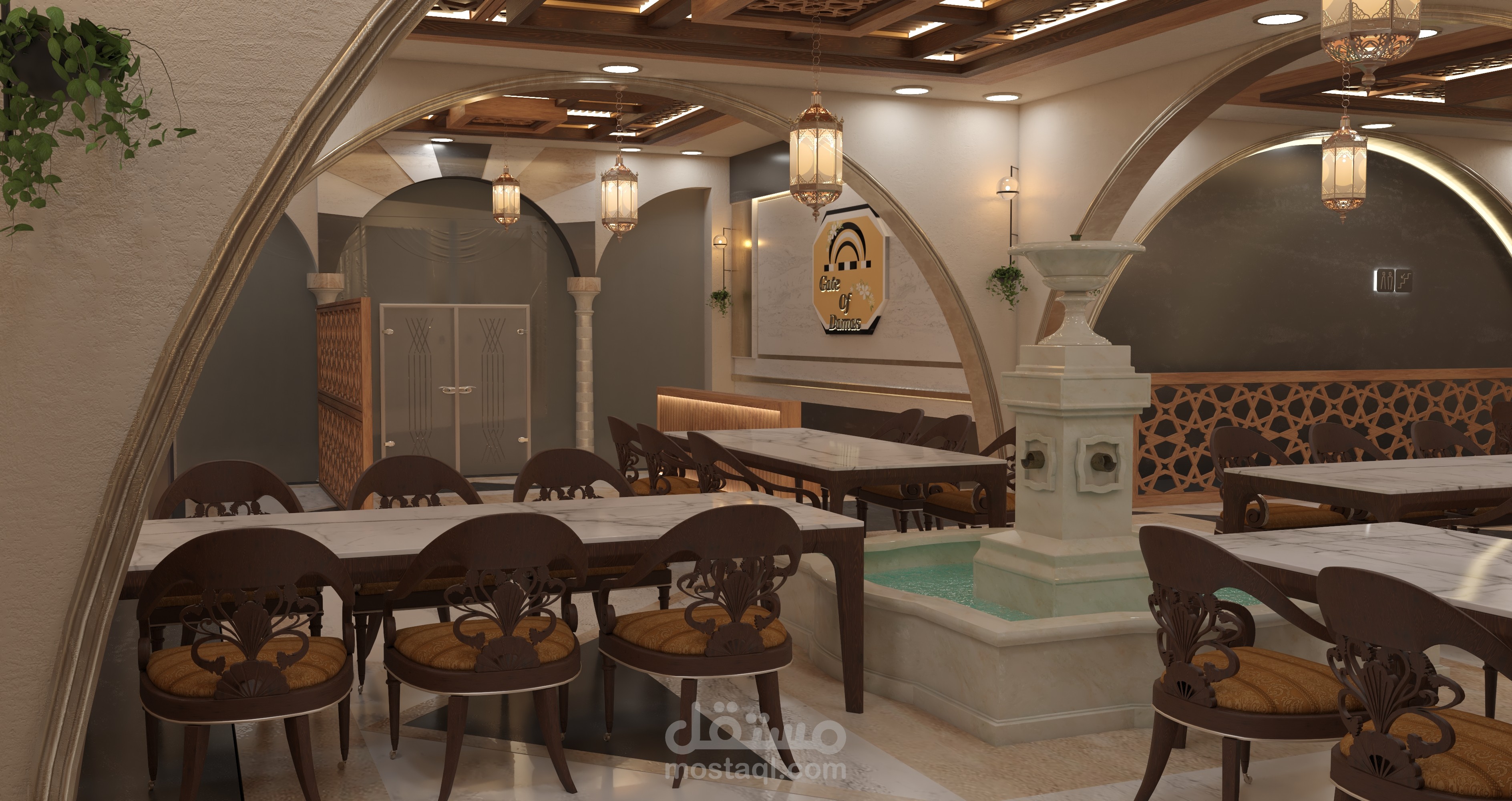 - فكرة المشروع تصميم مطعم بطراز وجمالية المنازل الشامية القديمة مع لمسة عصرية