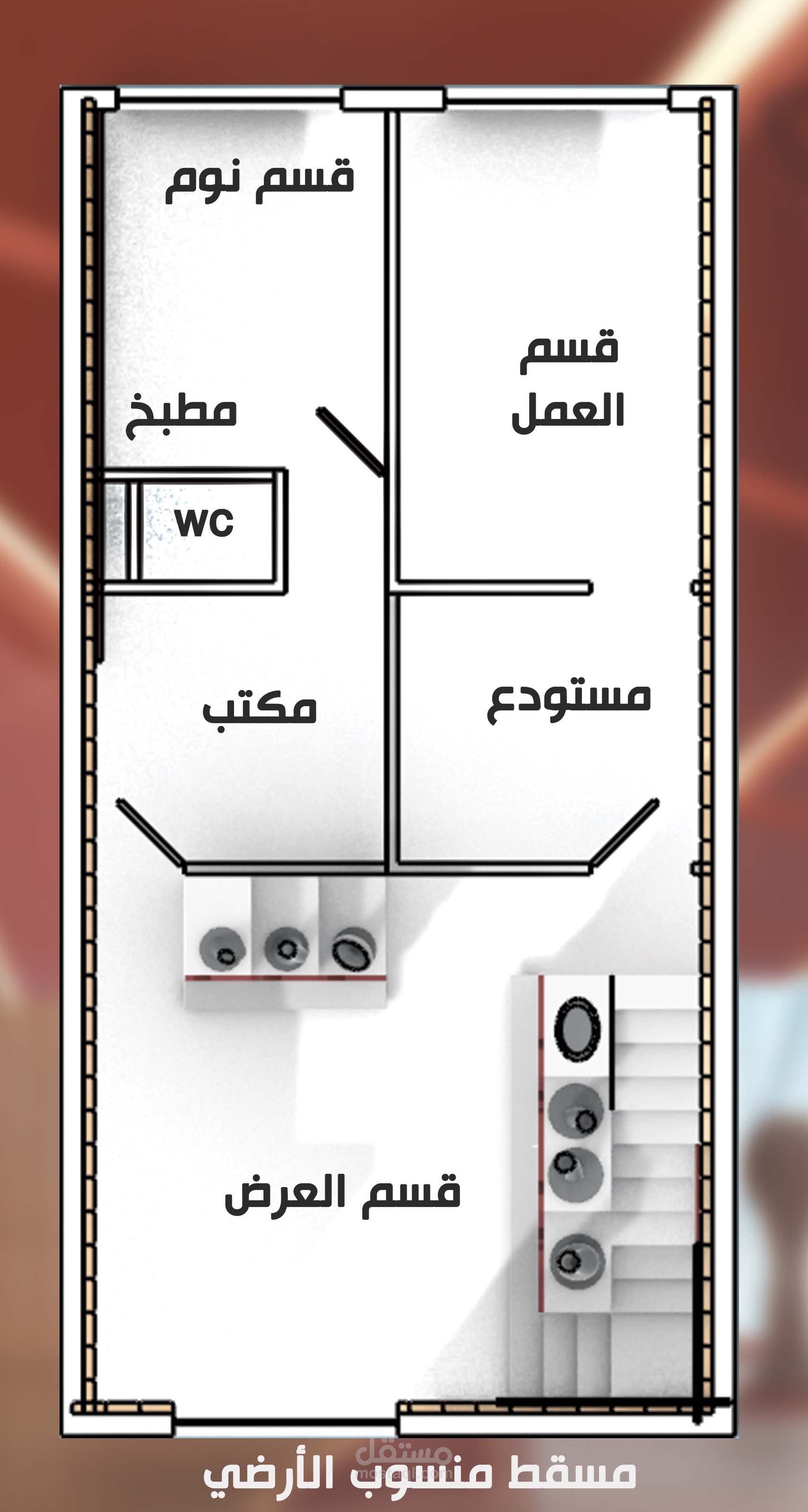 المنسوب الأرضي السفلي تم وضع الخدمات اللازمة للفنان من : 1 قسم العمل 2 قسم النوم وركن مطبخ 3 مكتب 4 مستودع .