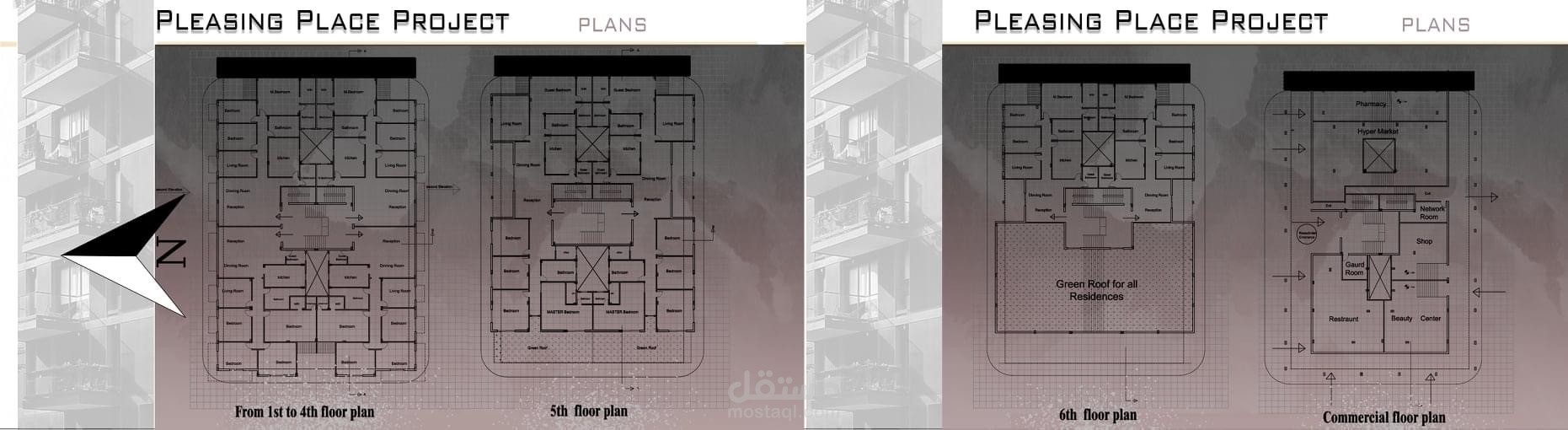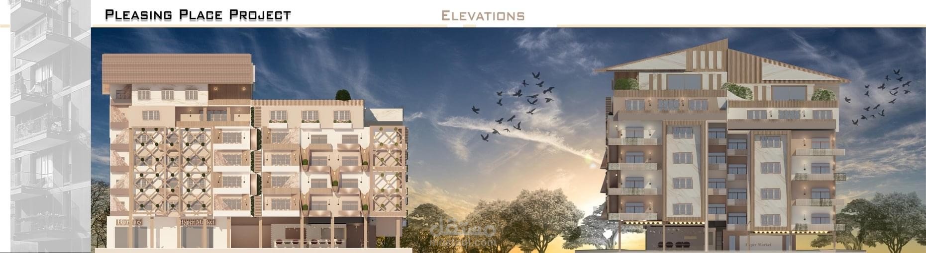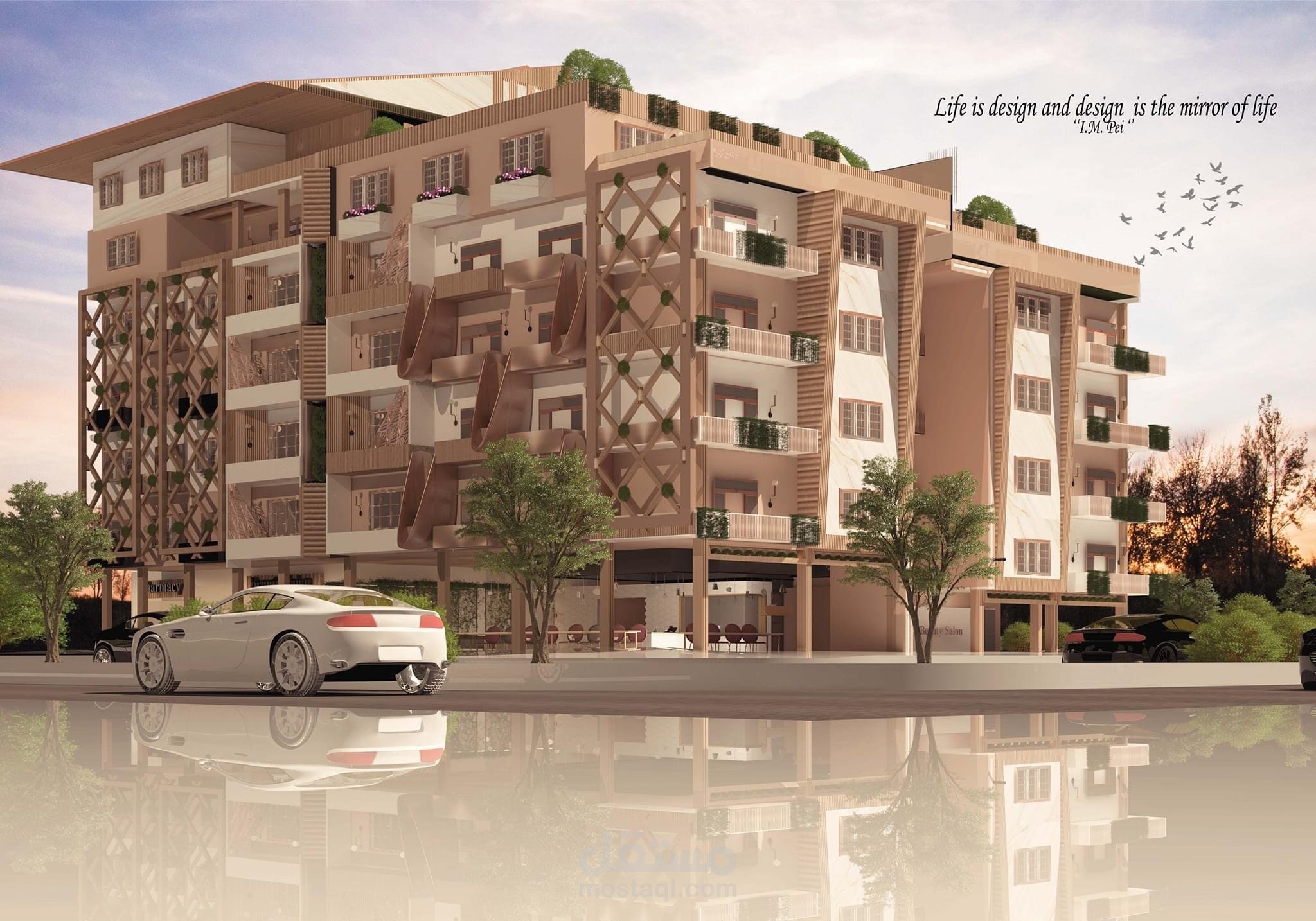 مشروع متكامل لتصميم مبنى سكنى تجارى بدراسات و تحليل و مساقط افقيه وواجهات و قطاع