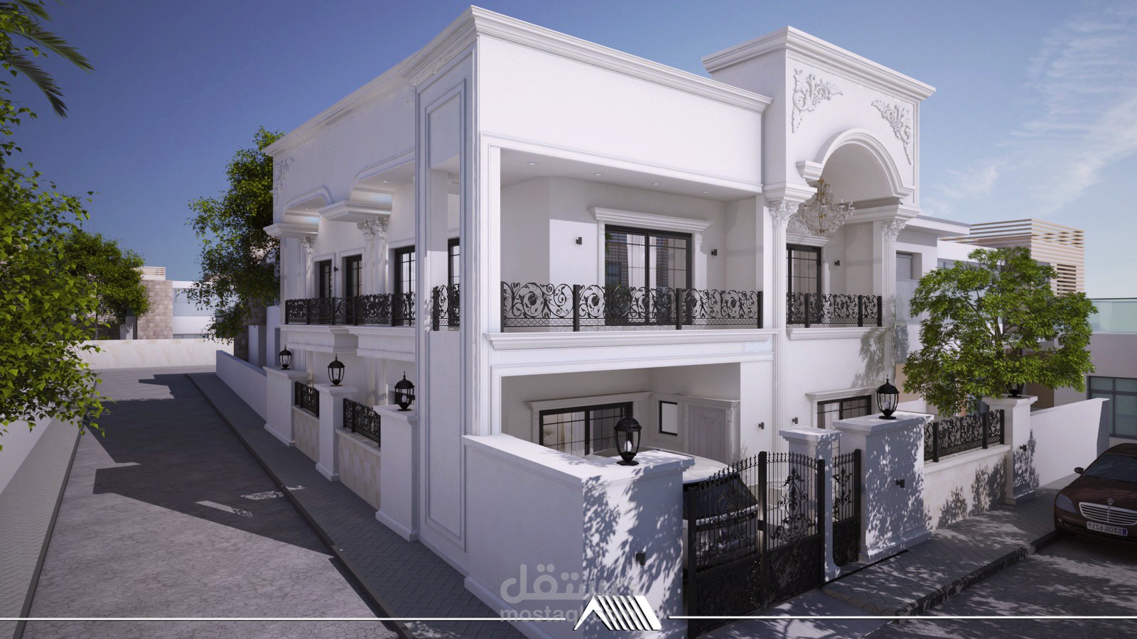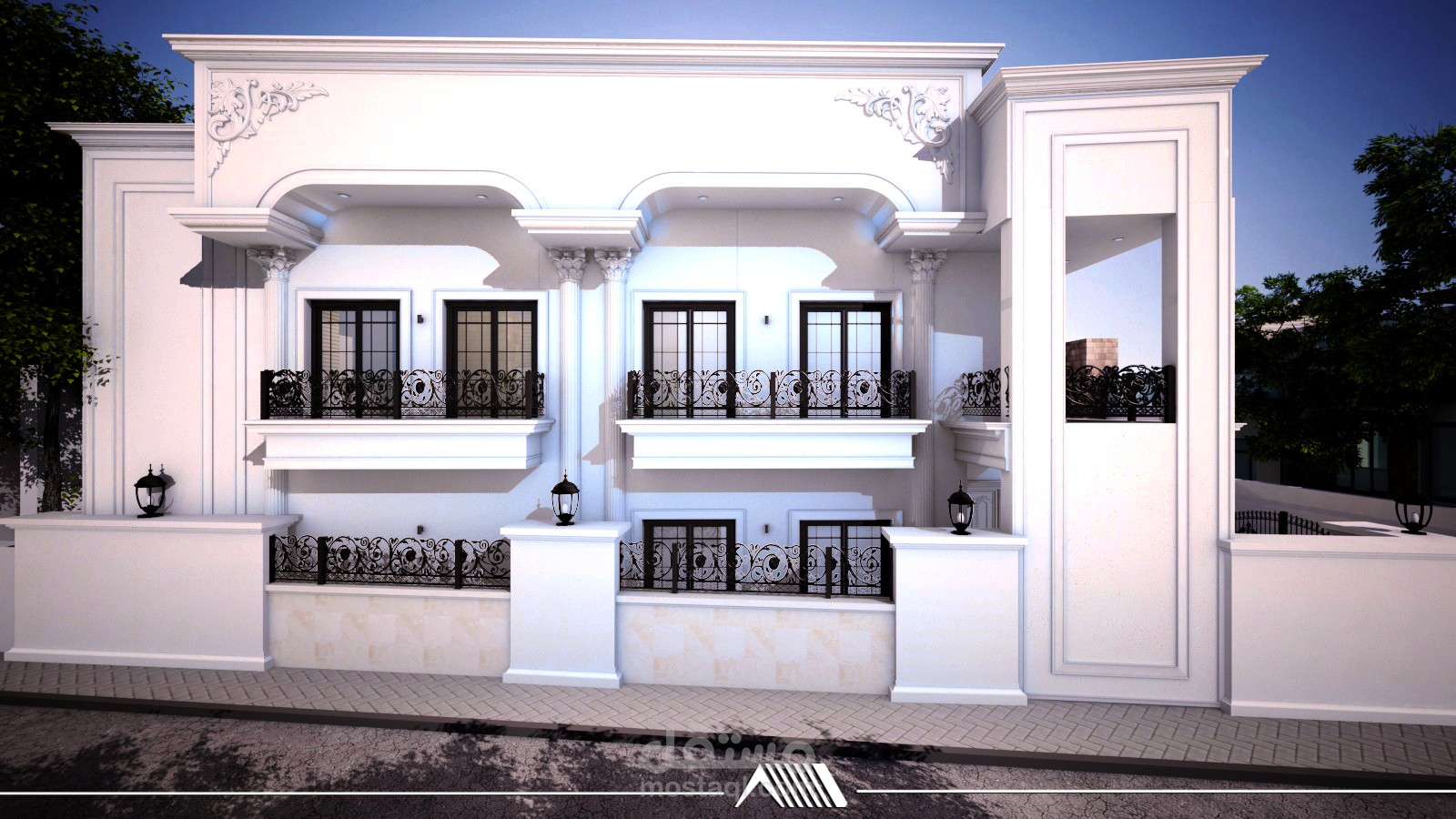 Facade design for a house on two streets in a classic style