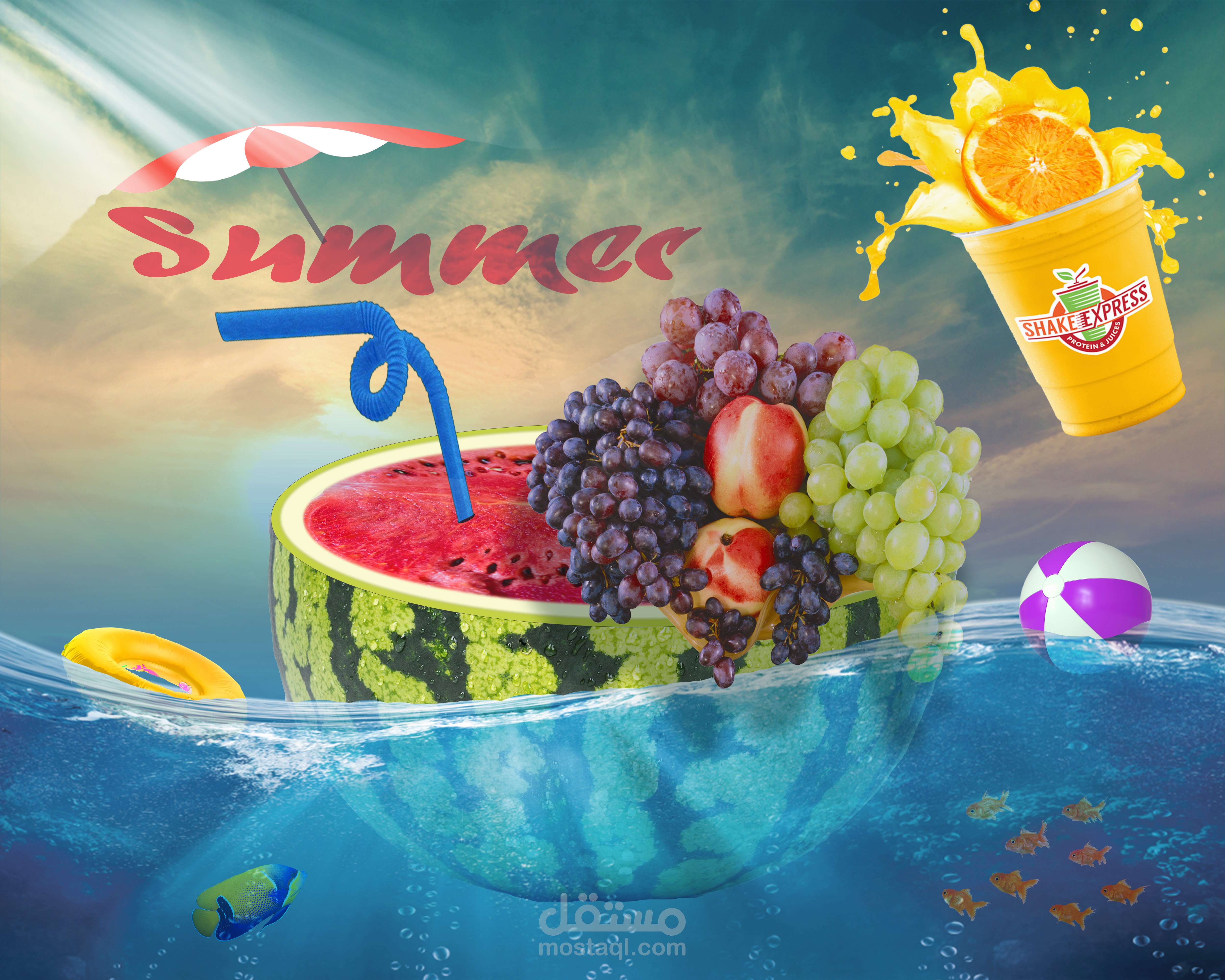 بوستر إعلاني لعصير مع إضافة فاكهة الصيف اللذيذة وبطيخة تعوم في الماء
