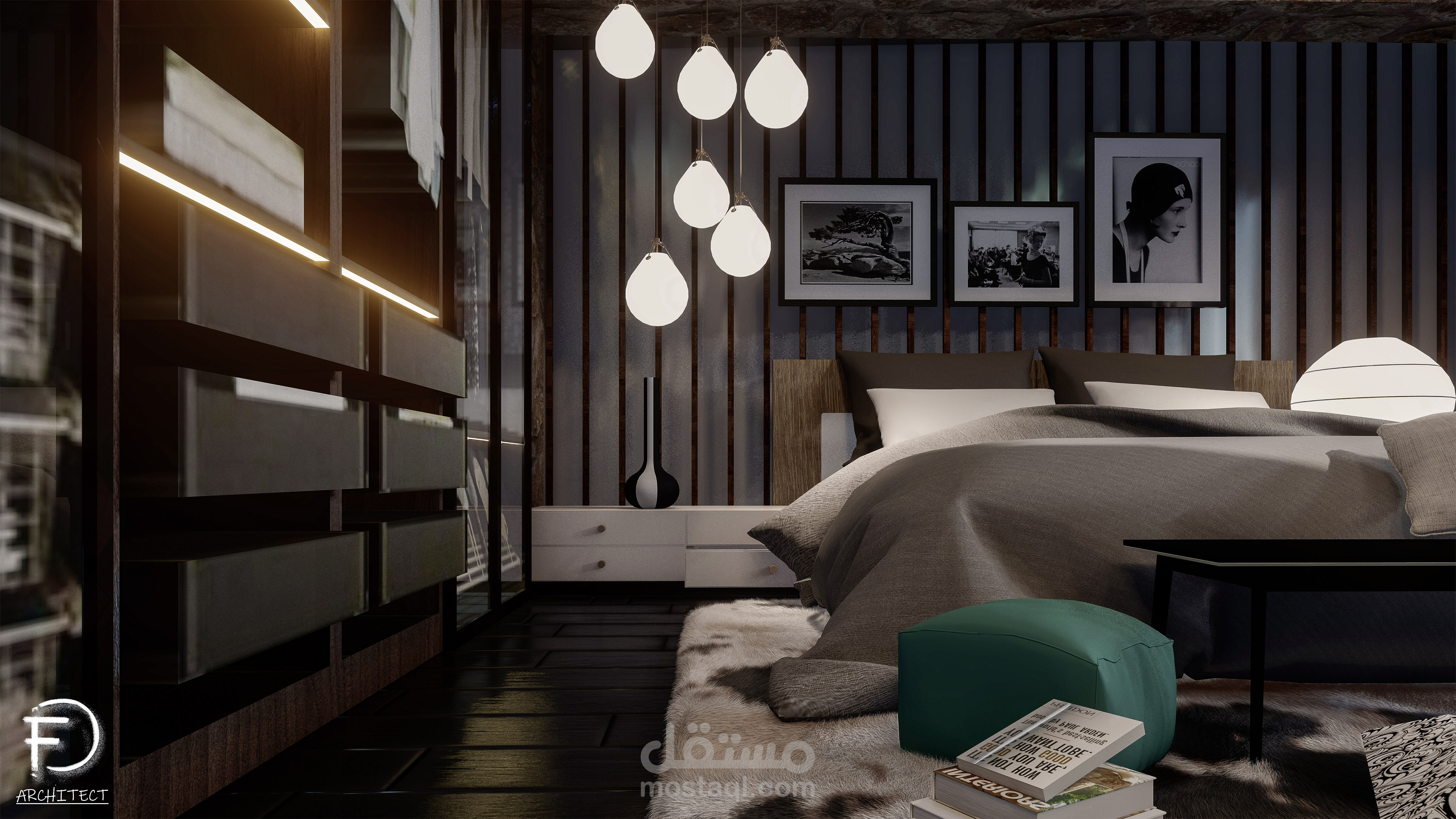 تم توظيفي لتصميم داخلي لغرفة نوم مودرن مع إضائة داخلية، حيث أنني إستخدمت sketchup لتصميم داخلي ثلاثي الأبعاد وأخيراً إستخدامت Lumion للرندر الواقعي.