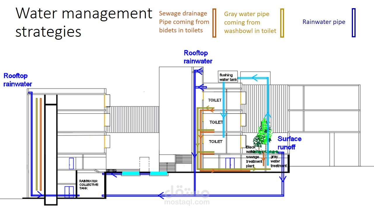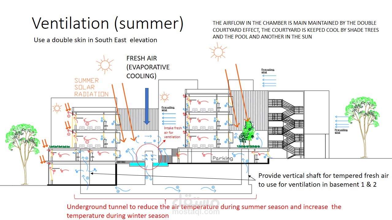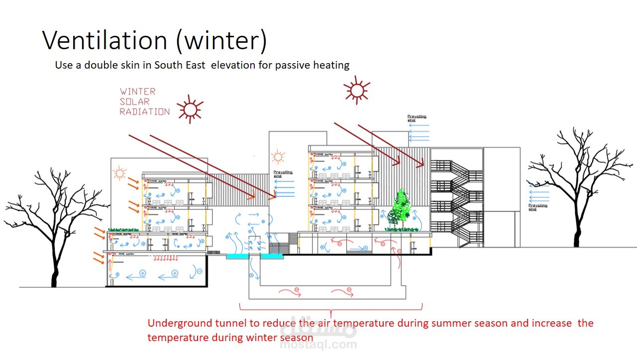 كانت فكرة المشروع إستخدام مواد مستدامة مثل double skin والحجر المحلي وصفائح نحاسية (مواد المعاد تدويرها) بالإضافة إلى أخذ في عين الإعتبار عناصر التدفئة والتبريد وإستخدام الطاقة الشمسية.