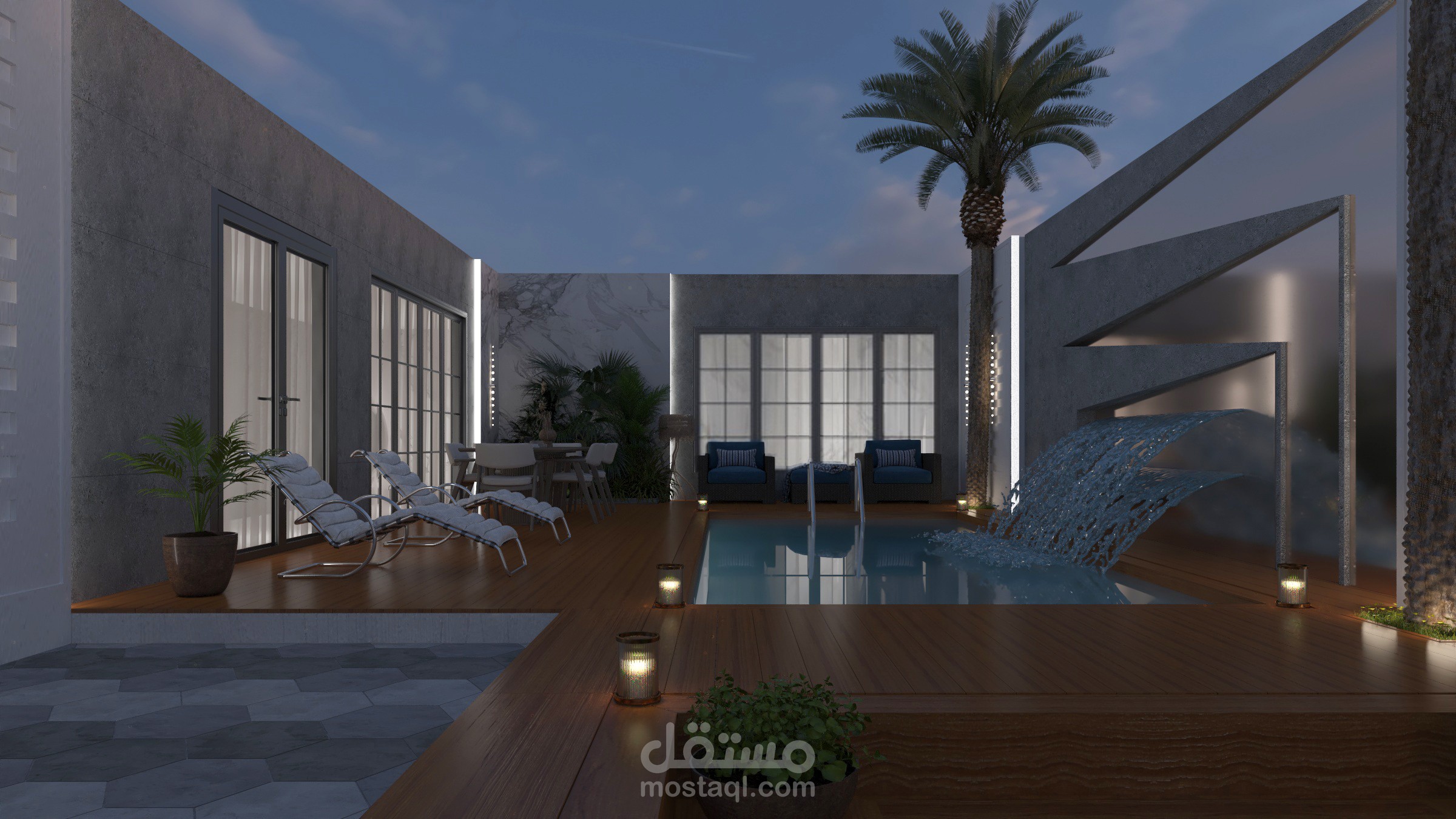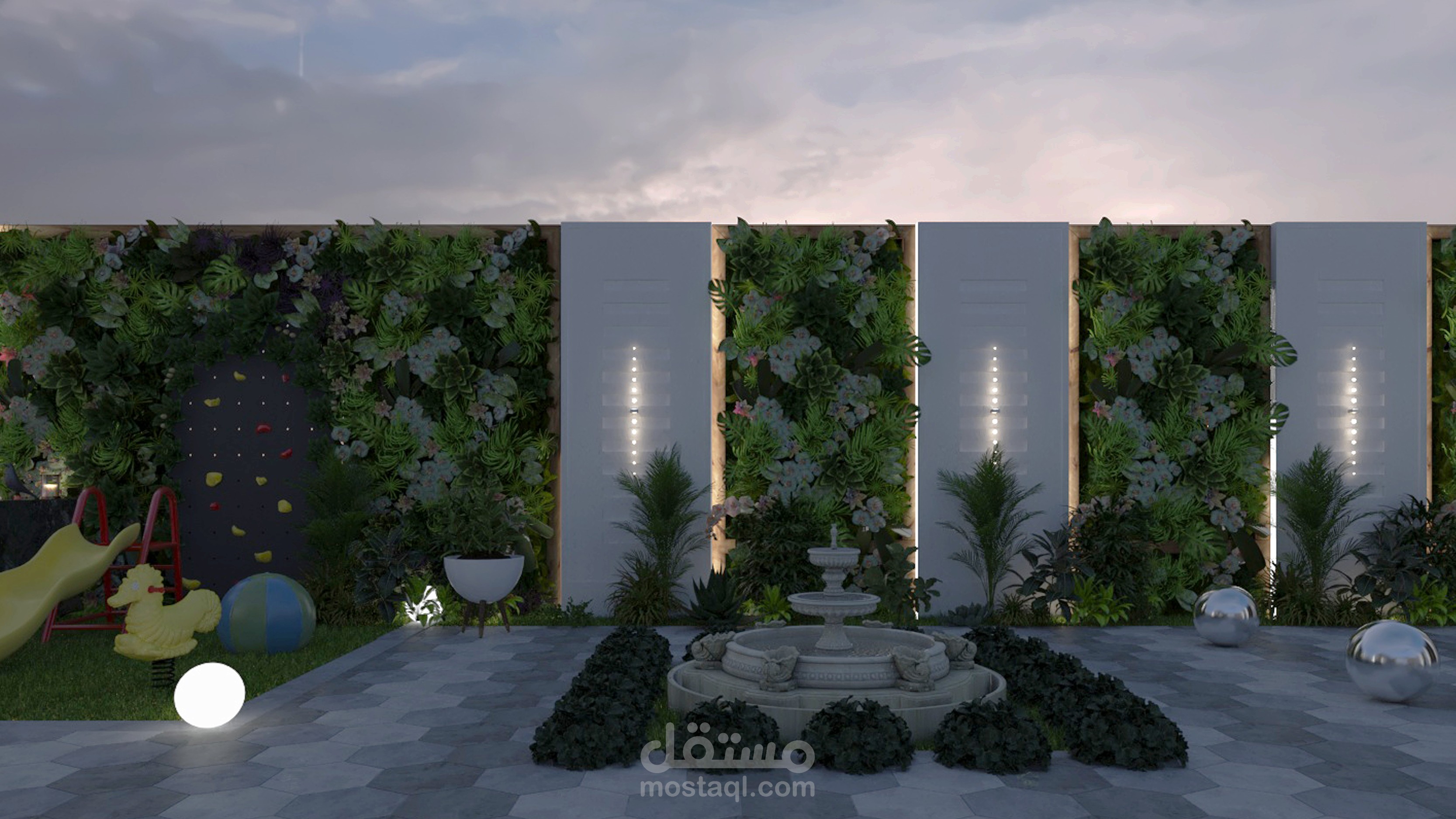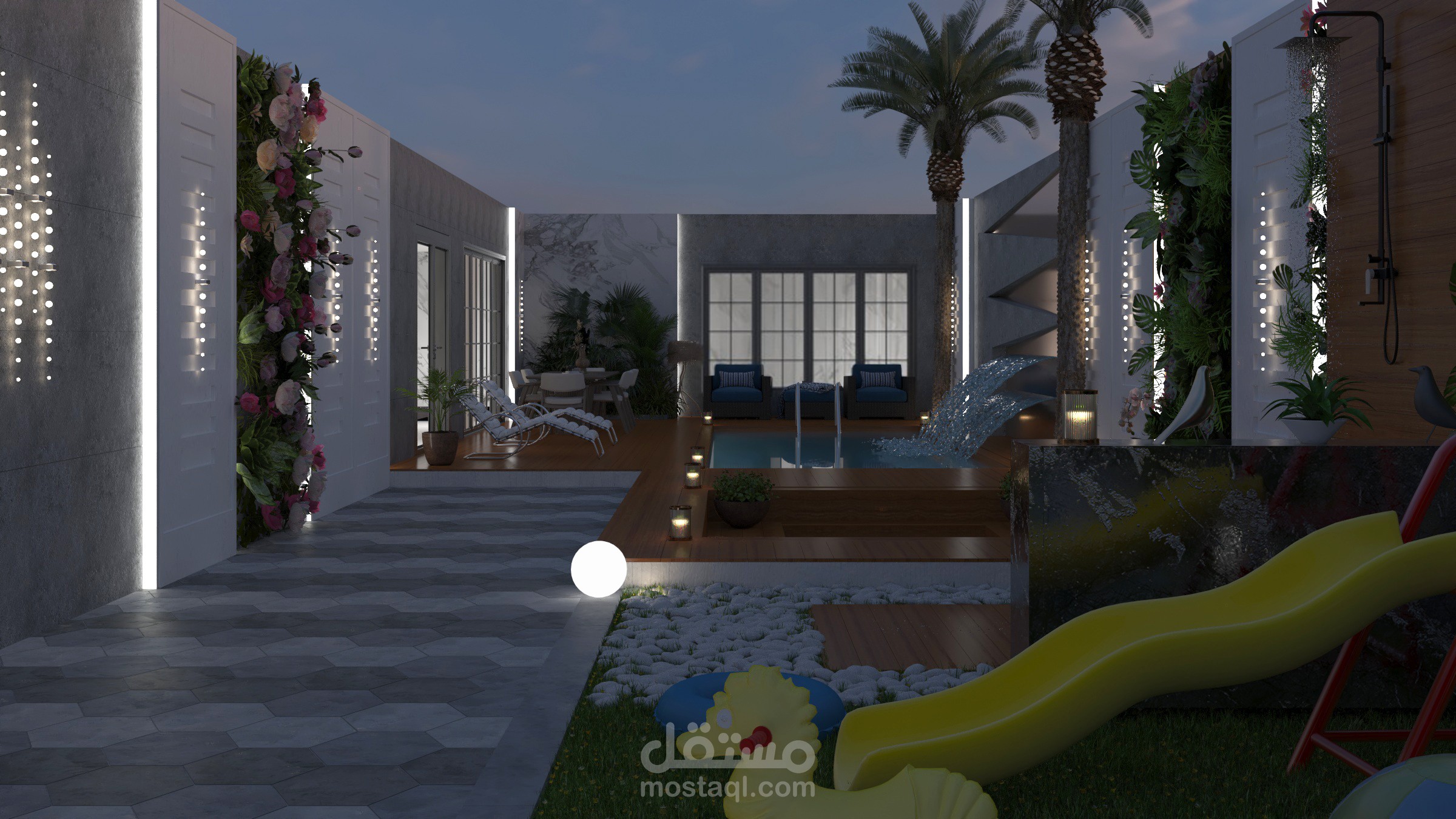تصميم حديقة منزل بطابع حديث تم تقسيم المساحة إلى مناطق لعب أطفال وحمام سباحة ودش ومقاعد.