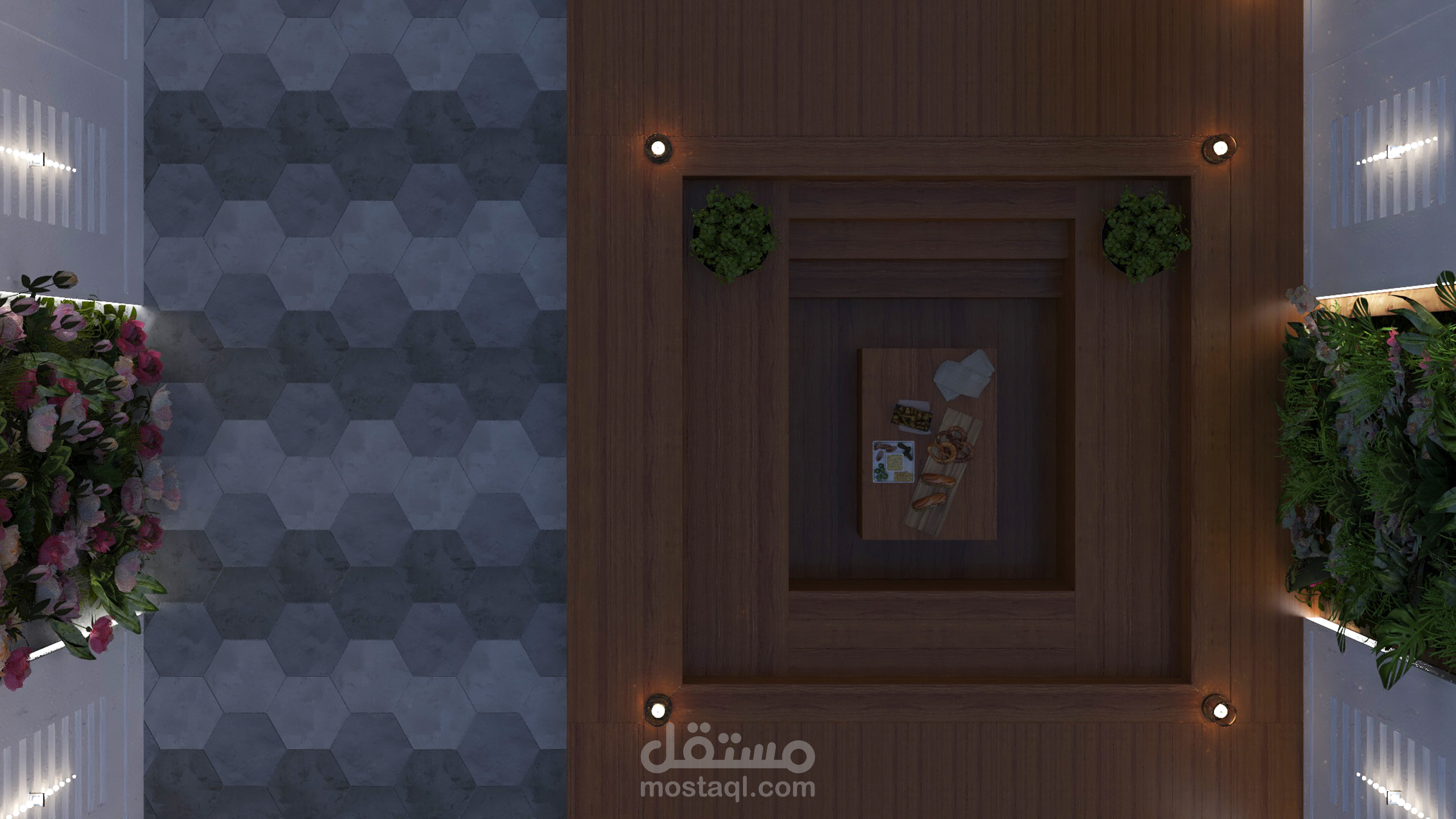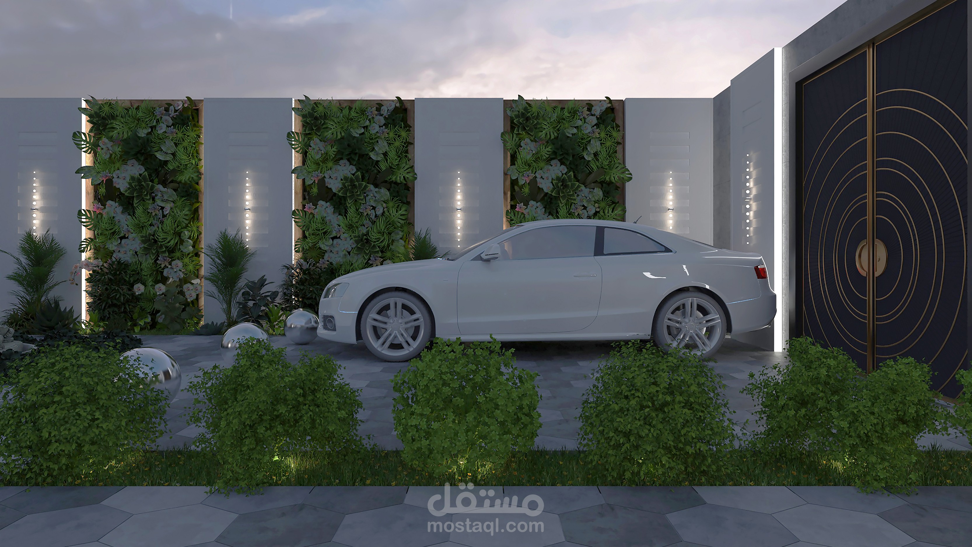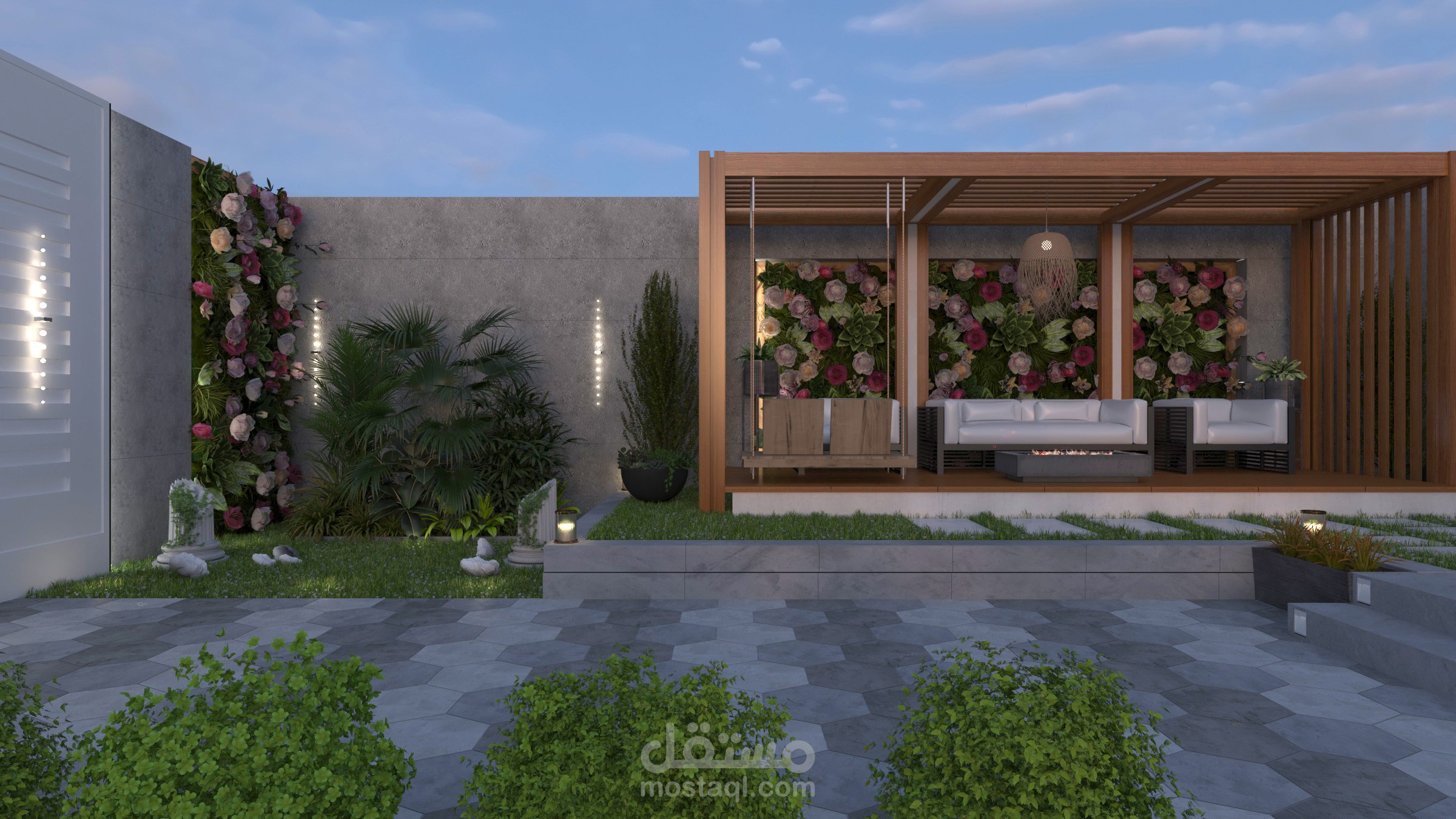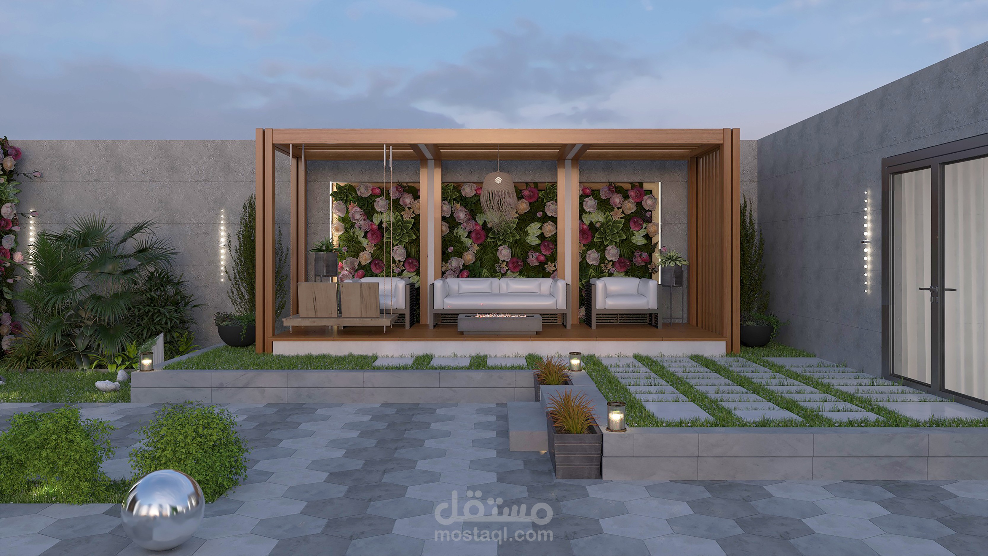 تصميم حديقة منزل بطابع حديث تم تقسيم المساحة إلى مناطق لعب أطفال وحمام سباحة ودش ومقاعد.