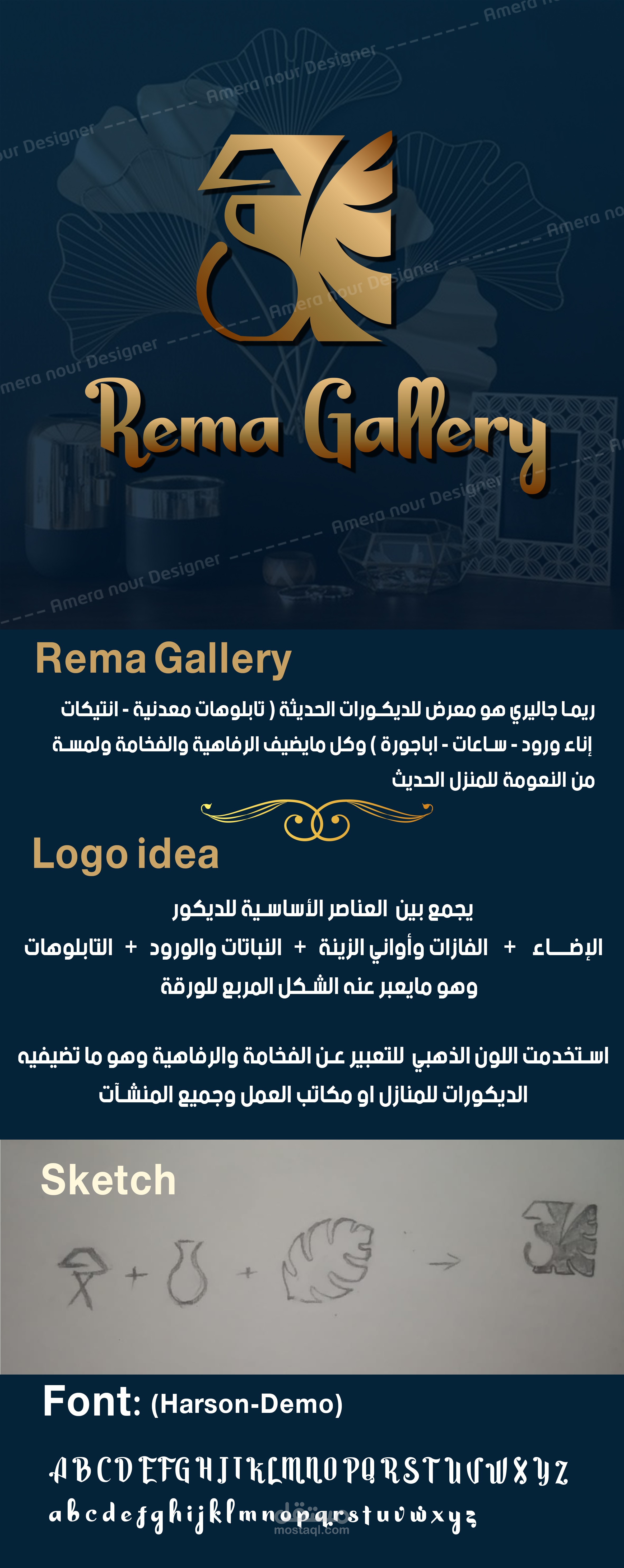 تصميم اللوجو مستوحي من عنصر الإضاءة ( الإبليك ) وعنصر اواني الزرع والزينة وعنصر النباتات وتم إدخال شكل التابلوه المربع في شكل ورقة الشجر بدمج هذه العناصر مع بعضها تتضح لنا فكرة اللوجو والتي تعبر عن اهم العناصر الاساسية للديكور الداخلي