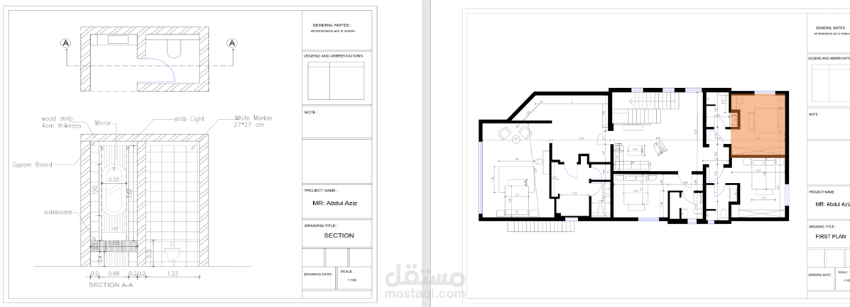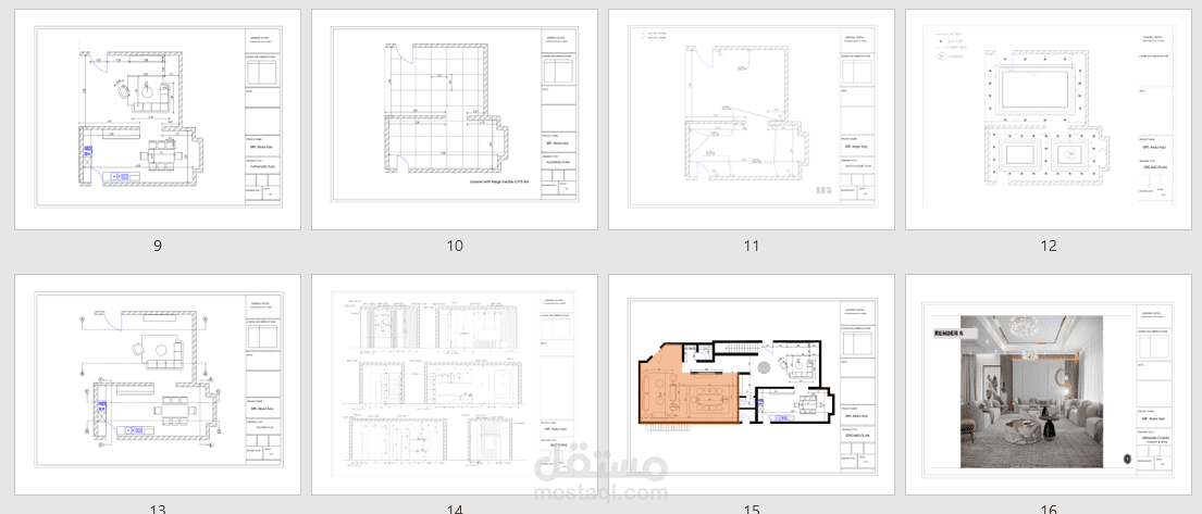 عمل مخططات تنفيذية كاملة لجميع الاسقف والأرضيات والحوائط الداخلية للفراغات